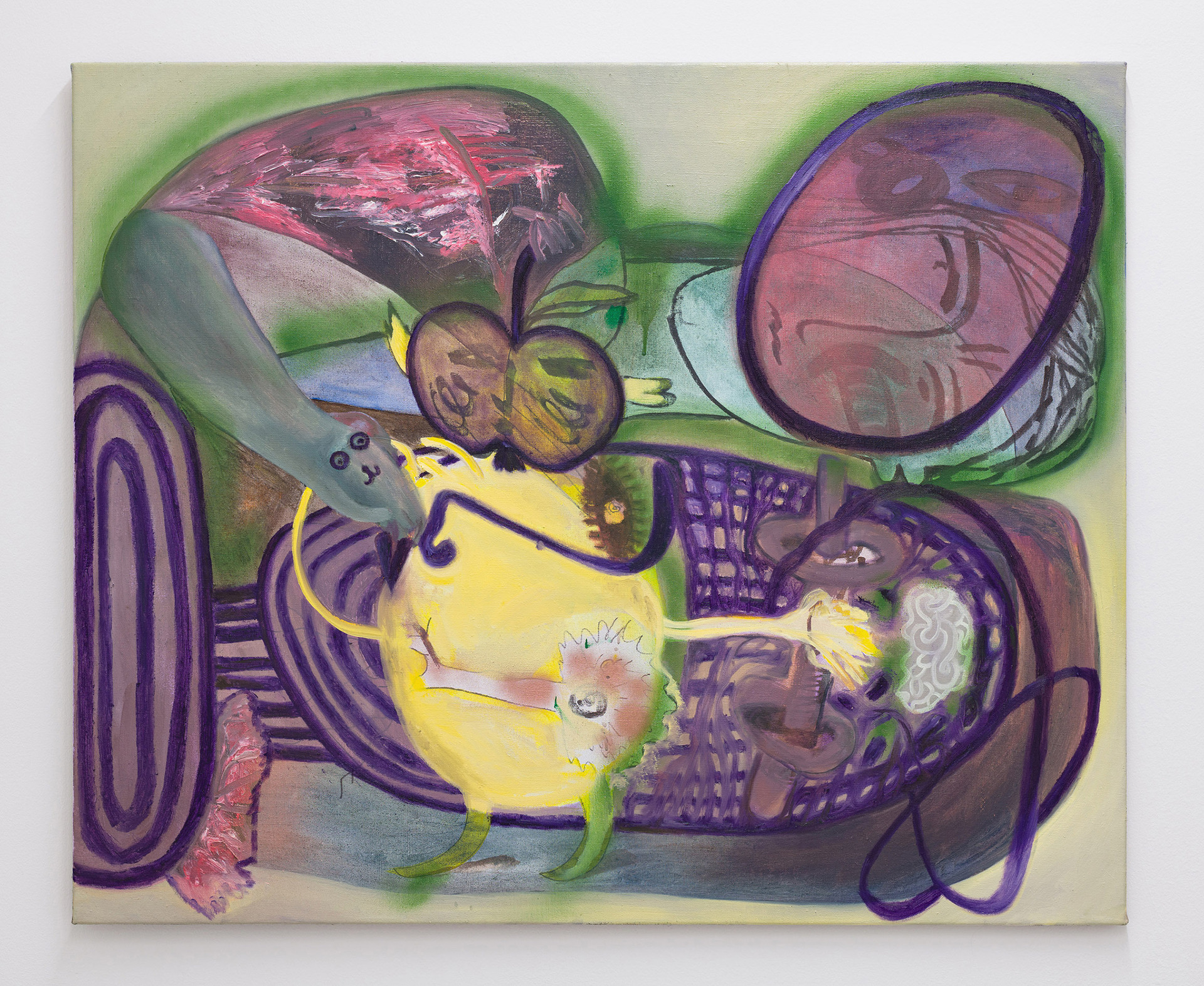 KH: Oh yes, we always fancied exploding them with our fingers as children, and still up to now. I imagined it would be an actual cucumber which is exploding when it's 'grown up'. I have to paint that. Also, when I think about your paintings, it's not so much that they are exploding, but continuously spritzing (not actually true, it's more splashing and flowing, but I like the relation to the German word), like an endless application of colour that doesn’t stop from one painting to the other, but just changes. And even though you would often say 'no' and sometimes say 'yes', for me it's so important to see the whole action. Maybe for me, it's a bit like the contrast to that, it's more 'stop and go'. Although I can totally relate to what you said about each painting being the answer to the last one. VP: Do you mean like 'stop and go' and move to the next one? Kiss-and-ride! I see it in your small-format paintings on cardboard. They are more like vessels and more pronounced as portraits or still lifes, for example. Large-format paintings are multi-functional in a way: a still life is not only a still life but also a portrait and a landscape. What was the difference in the process? [caption id="attachment_72271" align="alignnone" width="660"] Katharina Höglinger, On a Plate, 2020, oil on cardboard, 27 × 36 cm, © WONNERTH DEJACO and the artist 2020, photo: Peter Mochi[/caption]