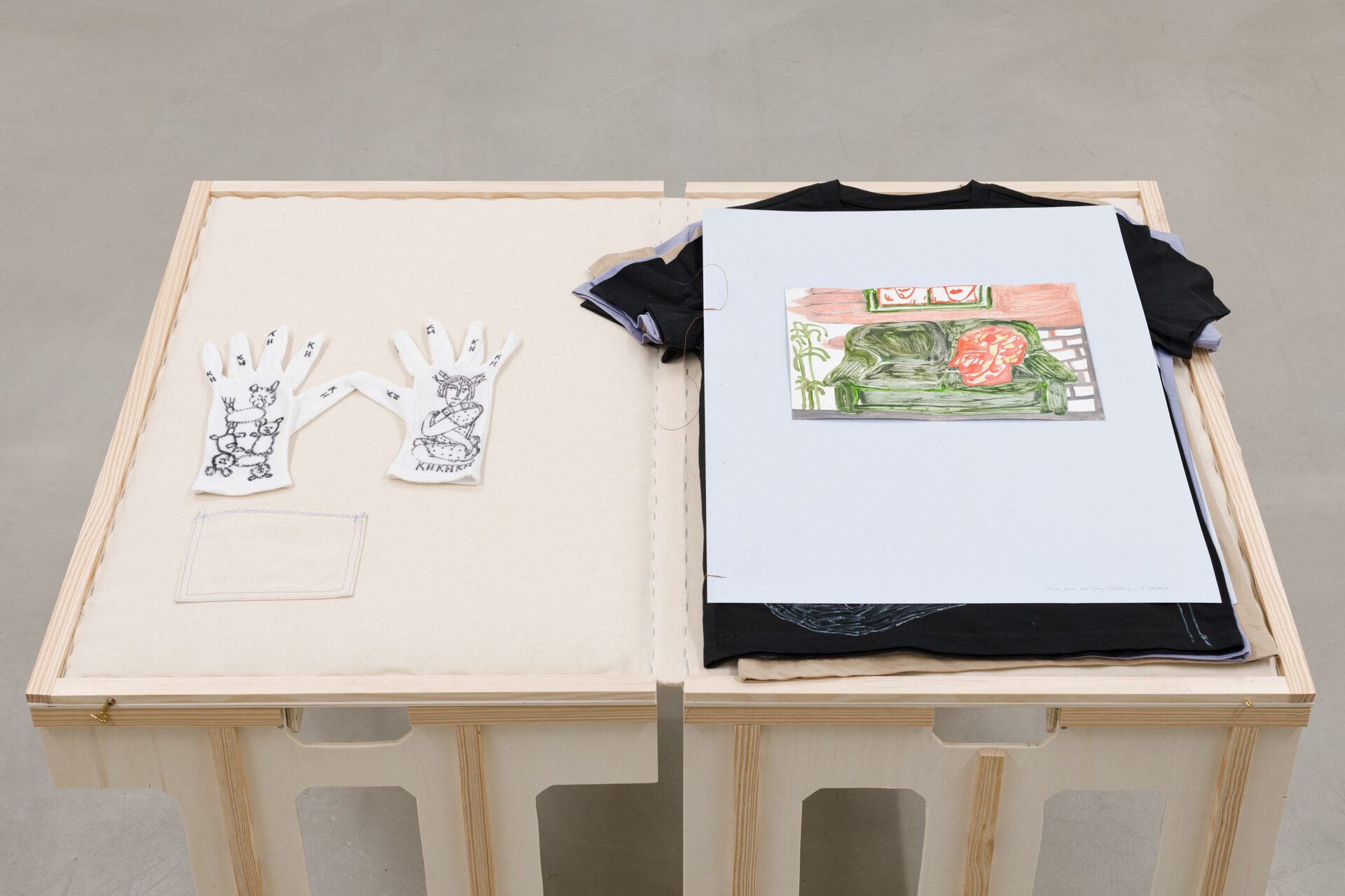 Katharina Höglinger, The Secret Life of KH, 2019, oil, oil pastels, marker, paper, T-shirts, cotton gloves, poplar and pine wood, cotton fabric, velcro fastener (Storage table: design and construction – Lena Sieder-Semlitsch), 65 × 102 × 76 cm, © WONNERTH DEJACO and the artist 2020, photo: Peter Mochi[/caption]
