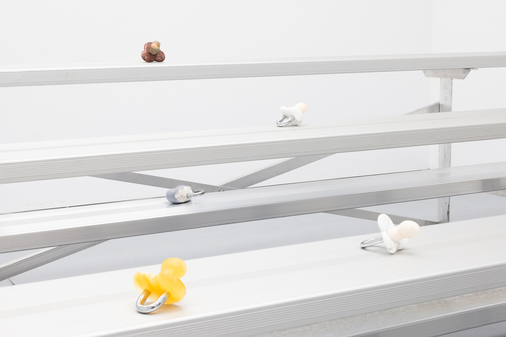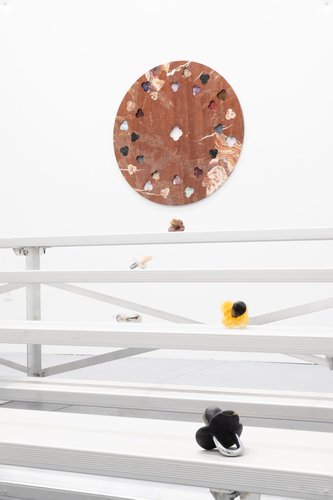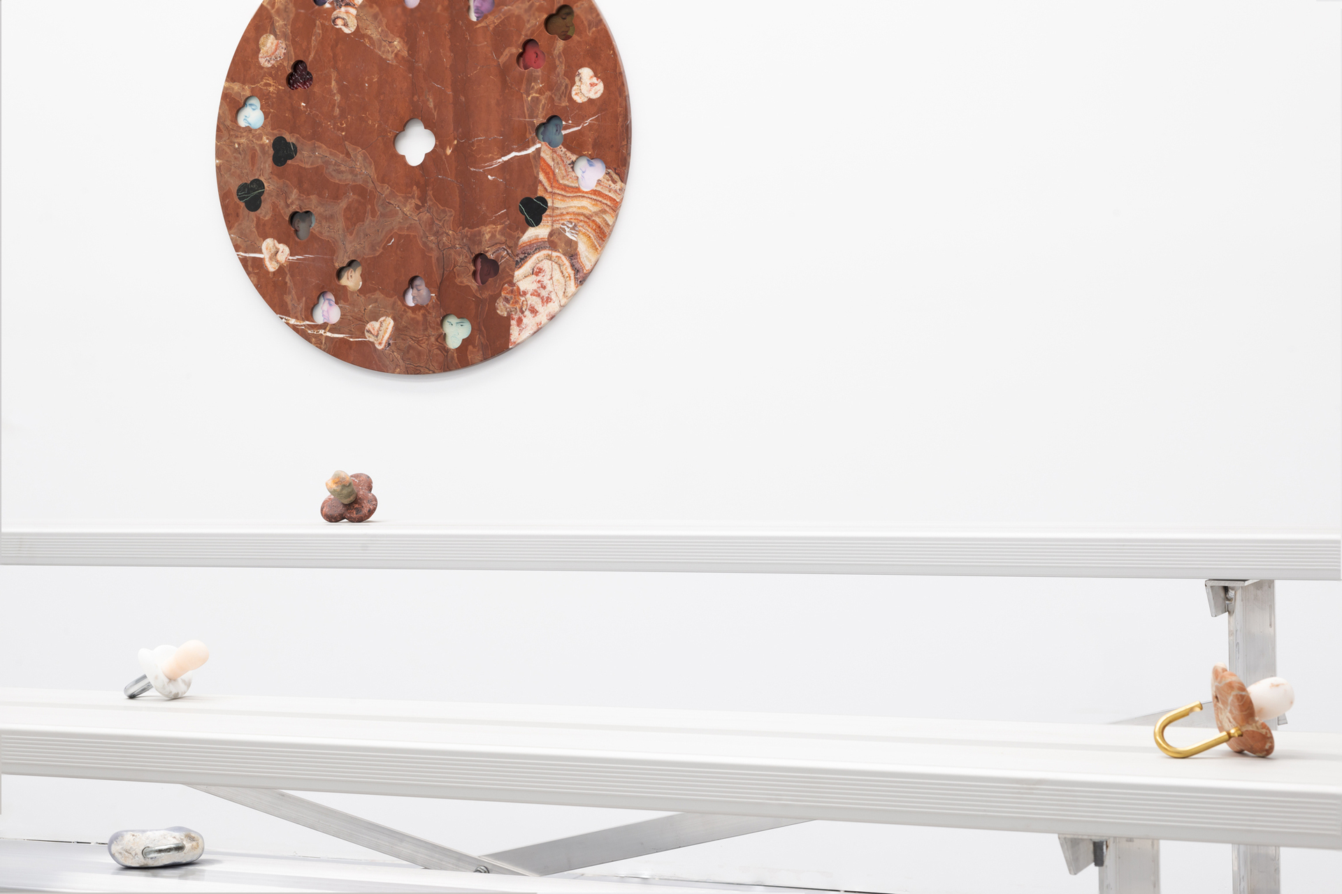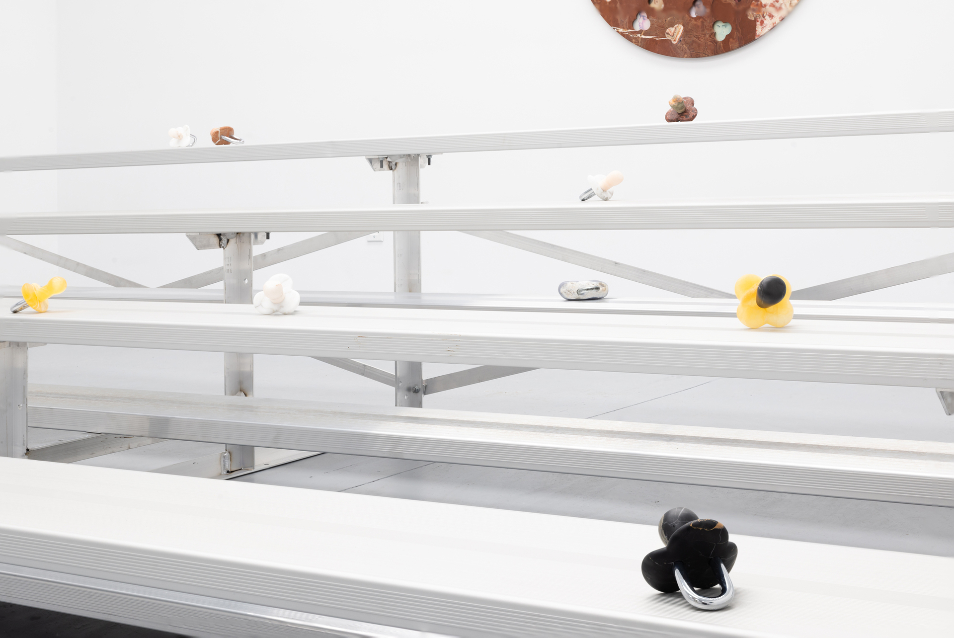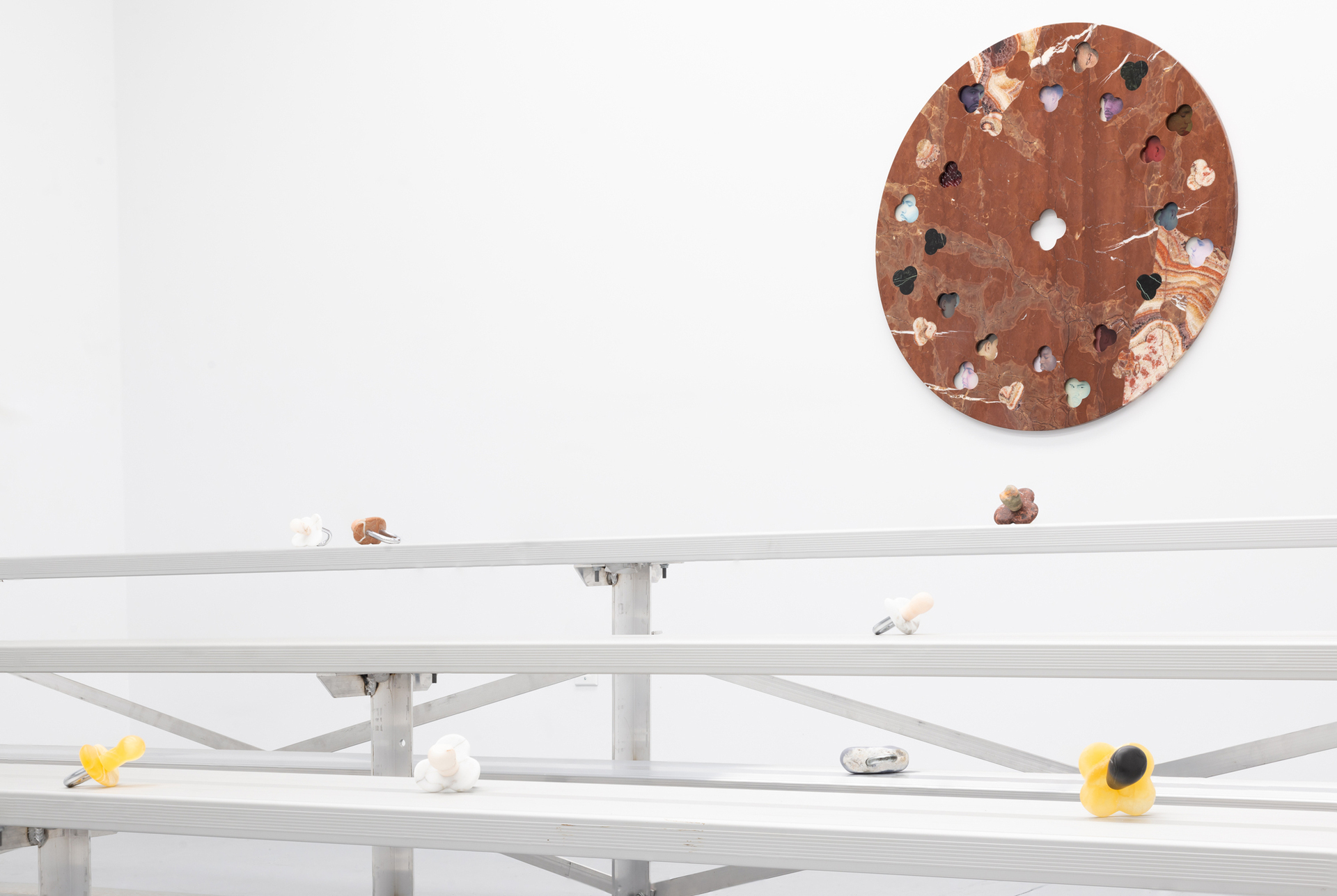 For Fin Simonetti’s exhibition Our Denomination, the artist has recast this early transitional object, perverting the pacifier’s typically pliant head with the visceral hardness of stone. Continuing her earlier work for which she carved protective objects out of alabaster, the artist has swapped the handle of the coping device with the shackle of a steel padlock. If Simonetti previously used hand railings in lieu of traditional plinths for displaying her stone works, here, a stage of bleachers serves as the safety armature-cum-display for the stone pacifiers. Meanwhile, three inlaid rose windows overlook the scene, their scalloped lobes of trefoil and quatrefoil motifs variously adorned, too, with steeled security arches.