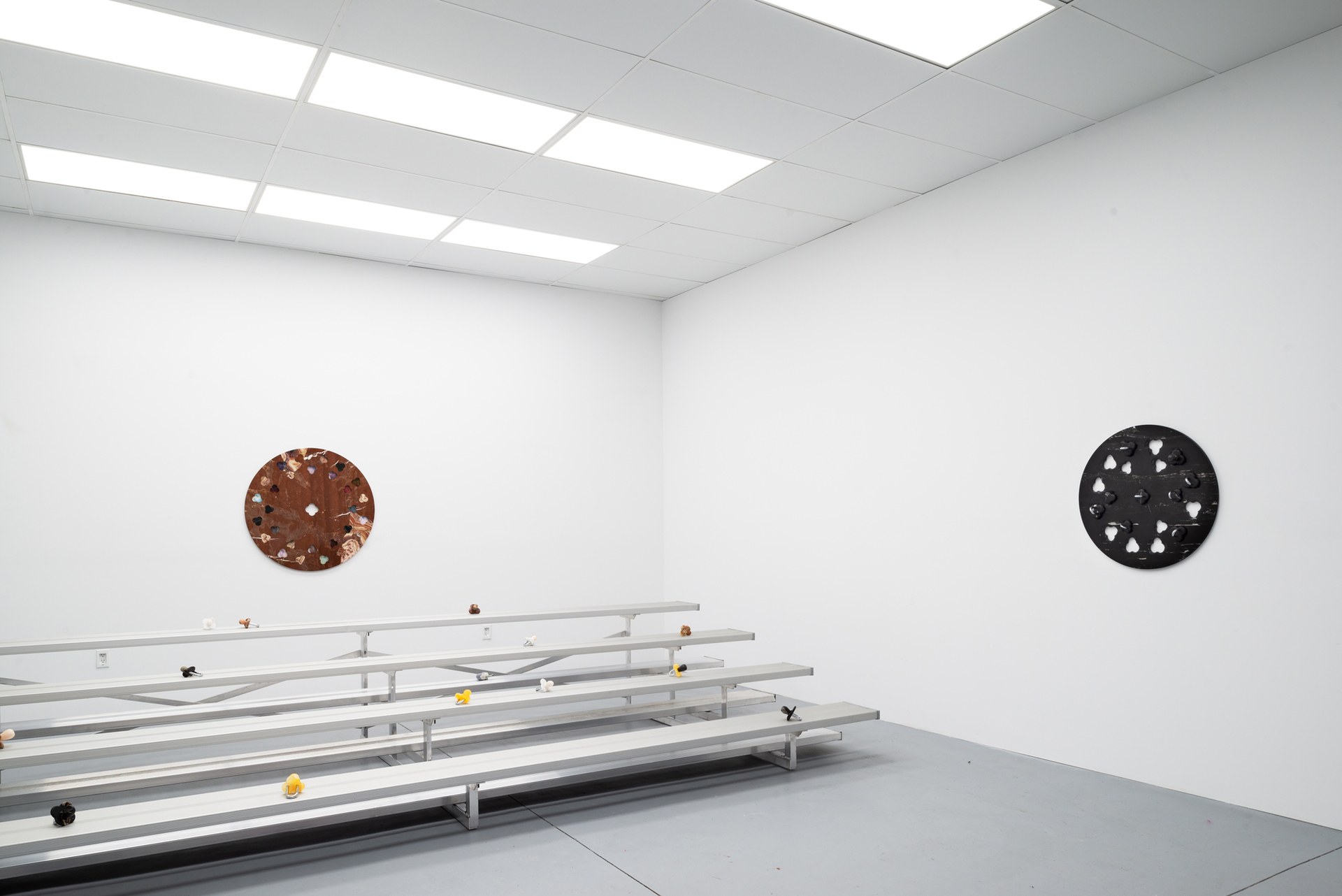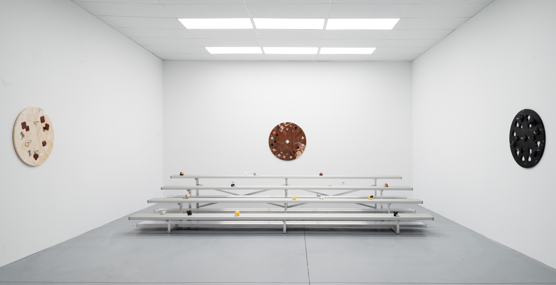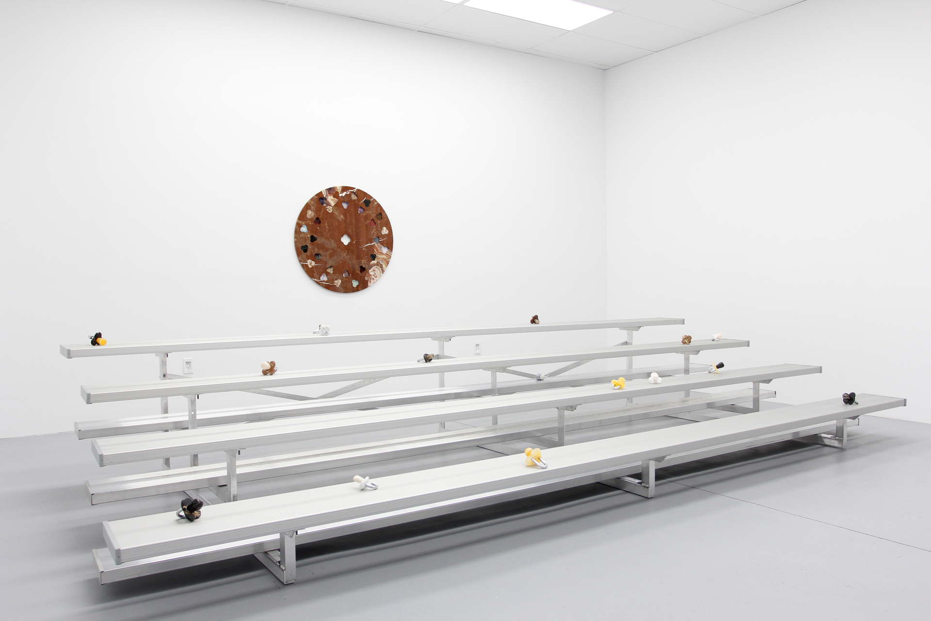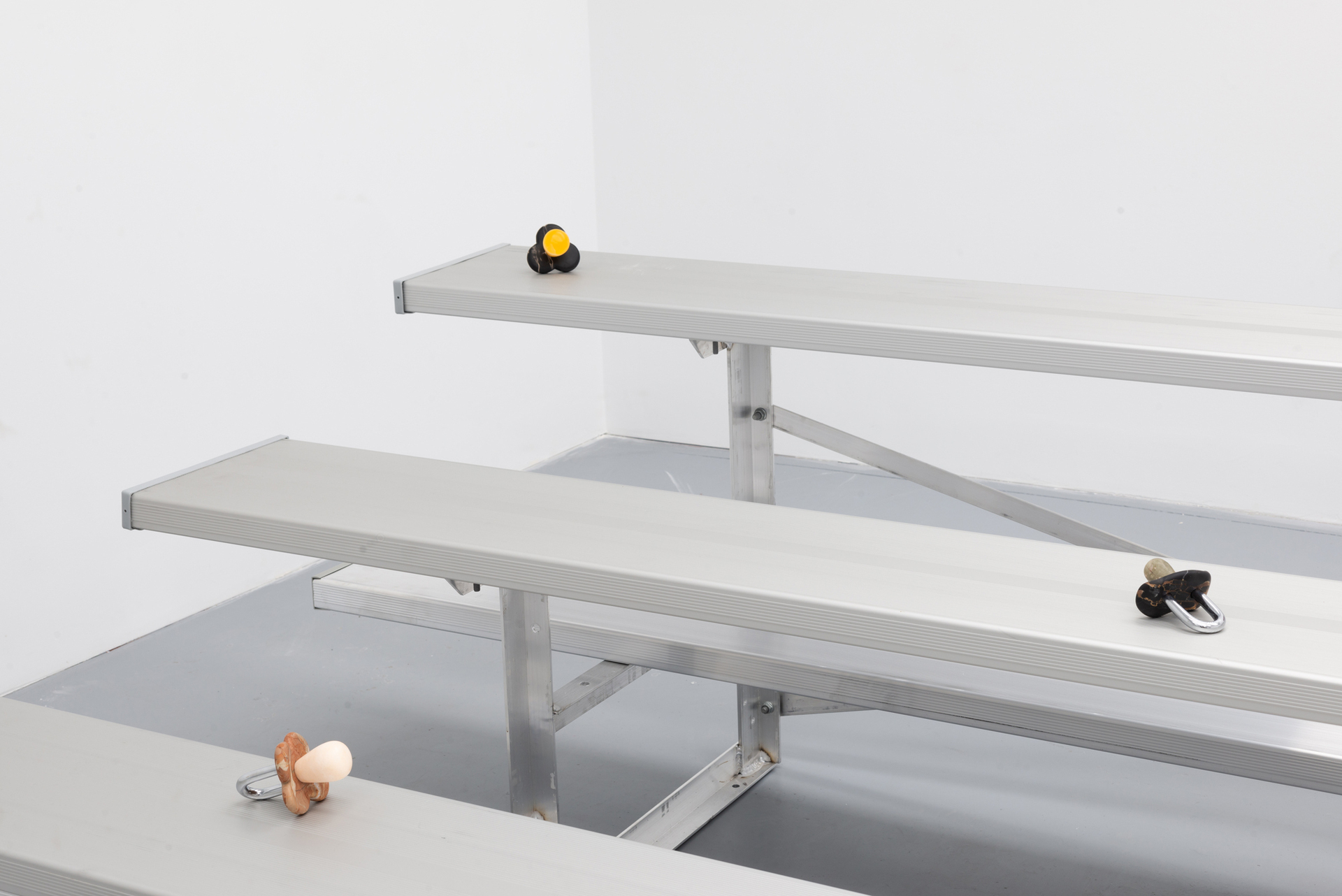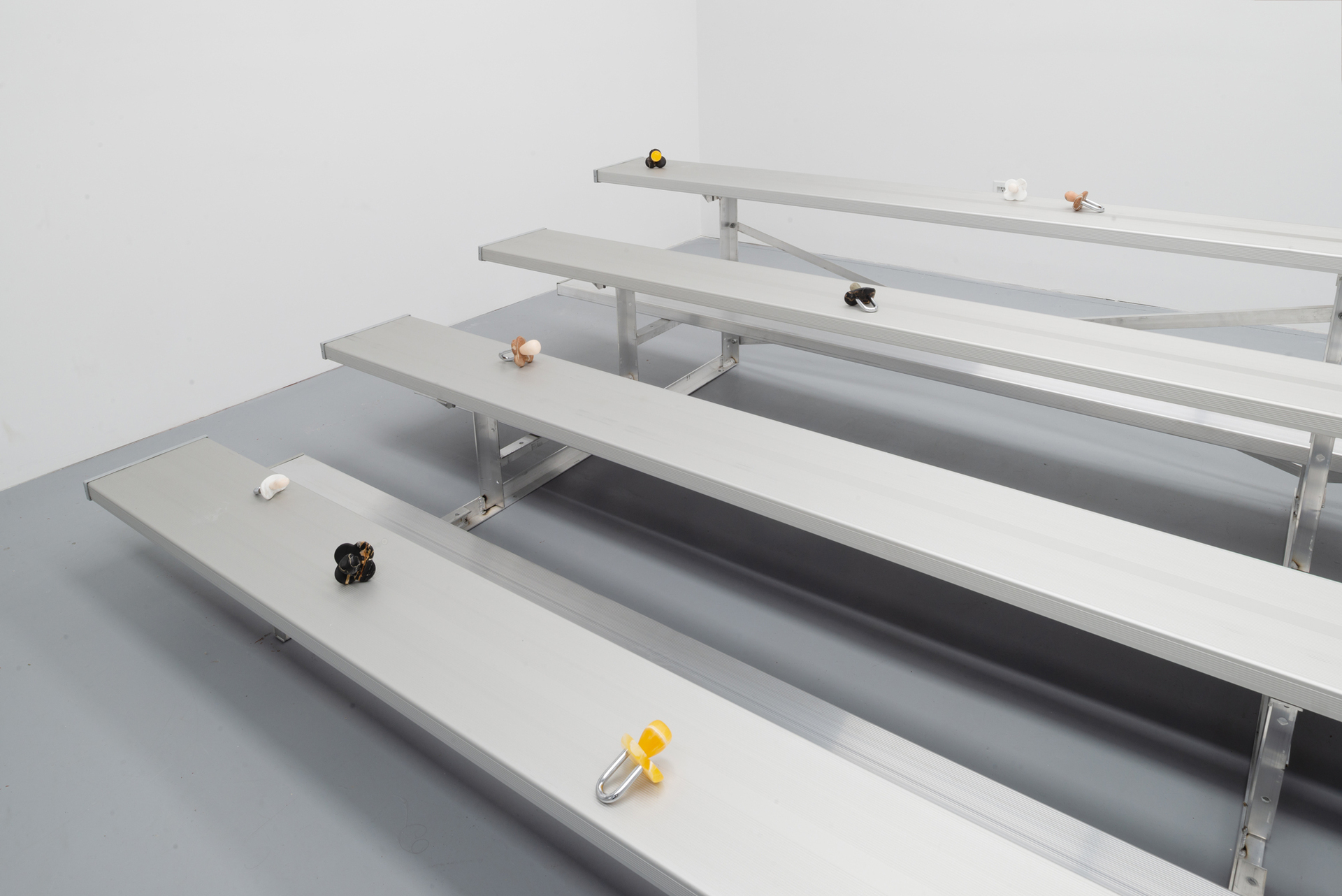 For Fin Simonetti’s exhibition Our Denomination, the artist has recast this early transitional object, perverting the pacifier’s typically pliant head with the visceral hardness of stone. Continuing her earlier work for which she carved protective objects out of alabaster, the artist has swapped the handle of the coping device with the shackle of a steel padlock. If Simonetti previously used hand railings in lieu of traditional plinths for displaying her stone works, here, a stage of bleachers serves as the safety armature-cum-display for the stone pacifiers. Meanwhile, three inlaid rose windows overlook the scene, their scalloped lobes of trefoil and quatrefoil motifs variously adorned, too, with steeled security arches.