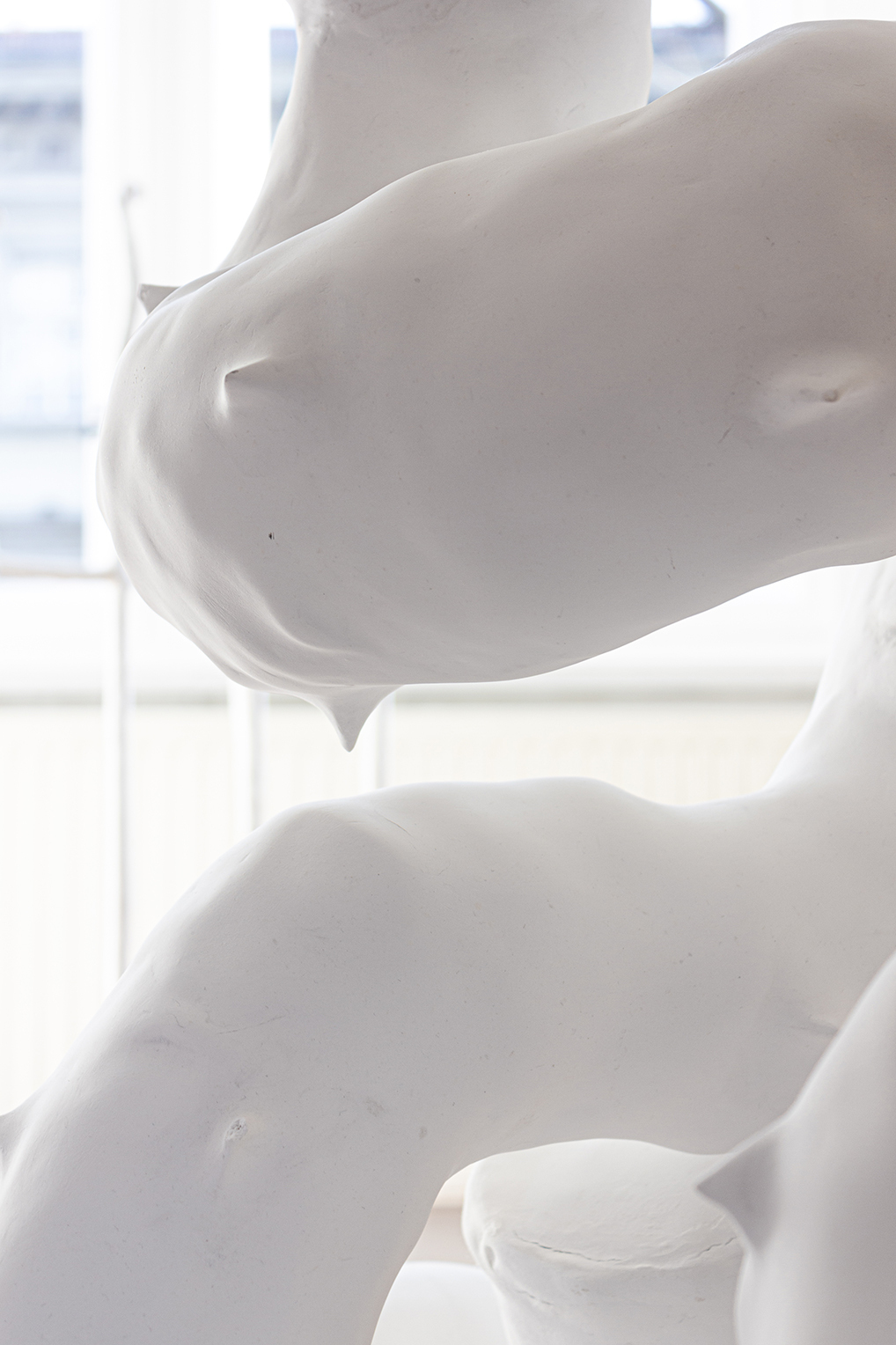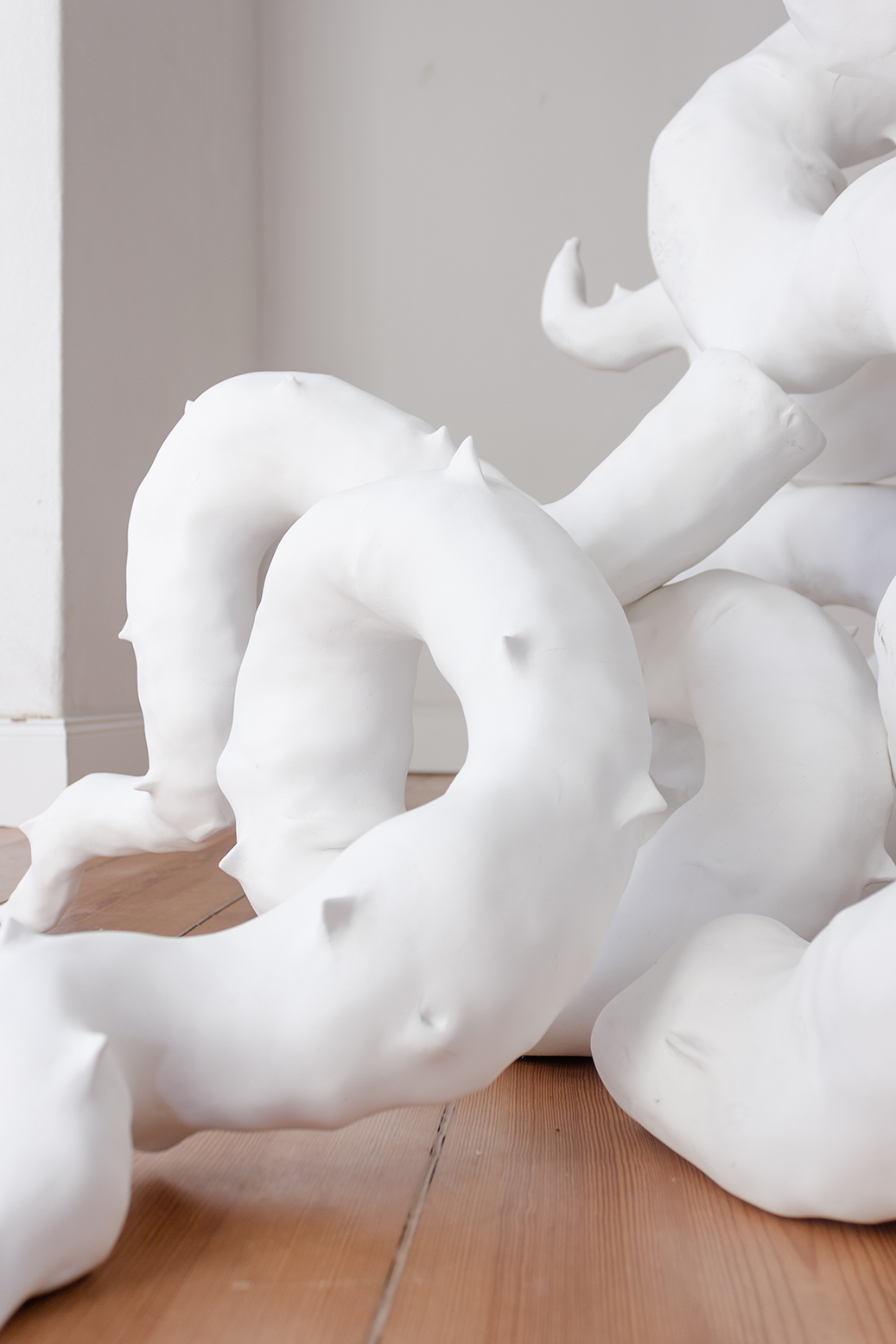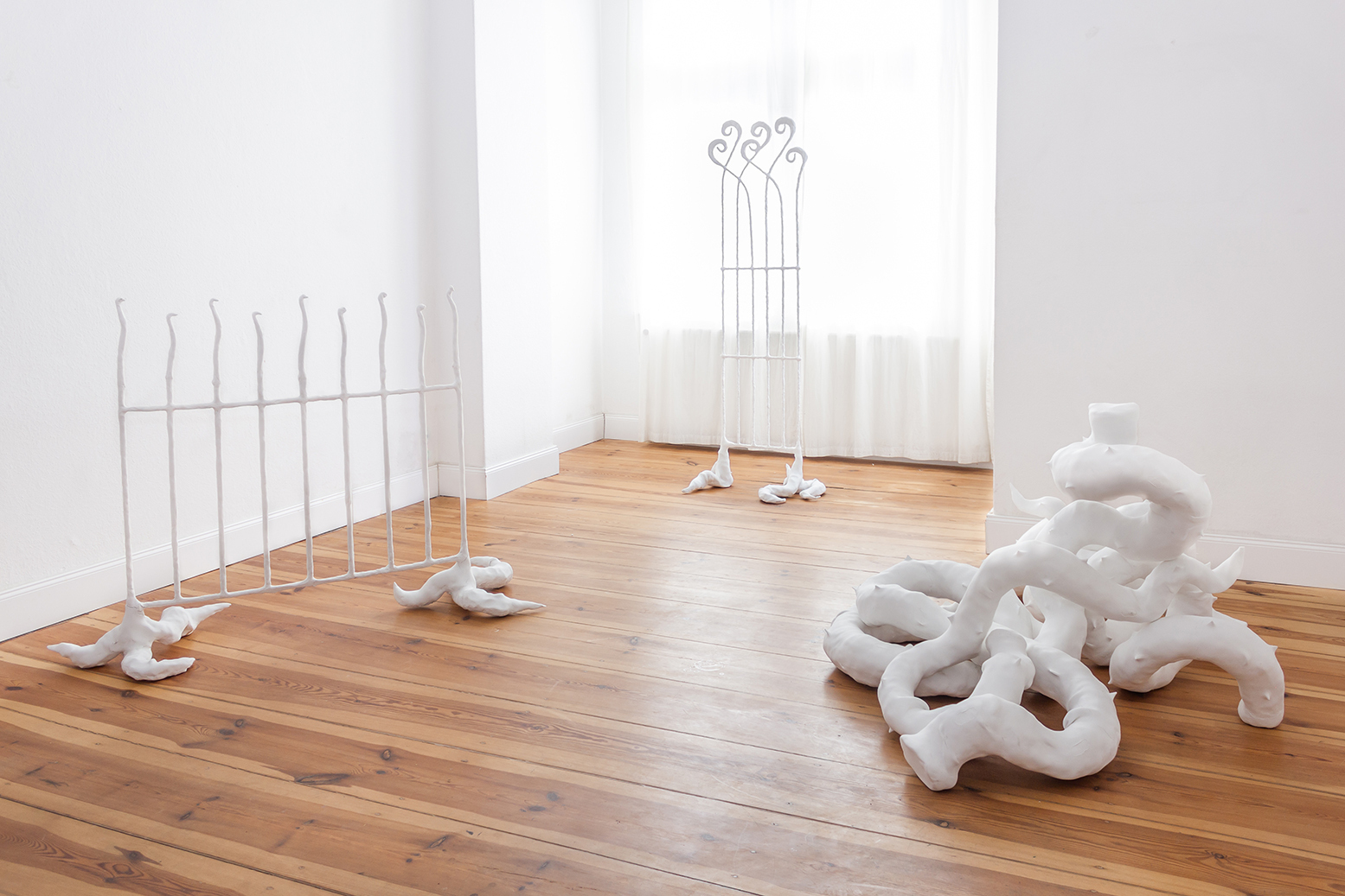 Annkathrin Kluss set up PARASITES OF FRAGMENTED GARDENS, which was supposed to be shown in the Warte für Kunst in Kassel, in a room in her apartment.Text