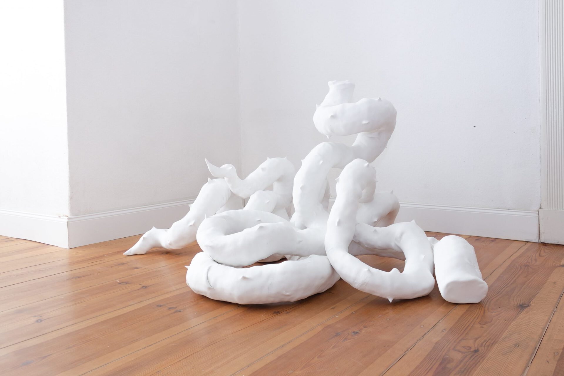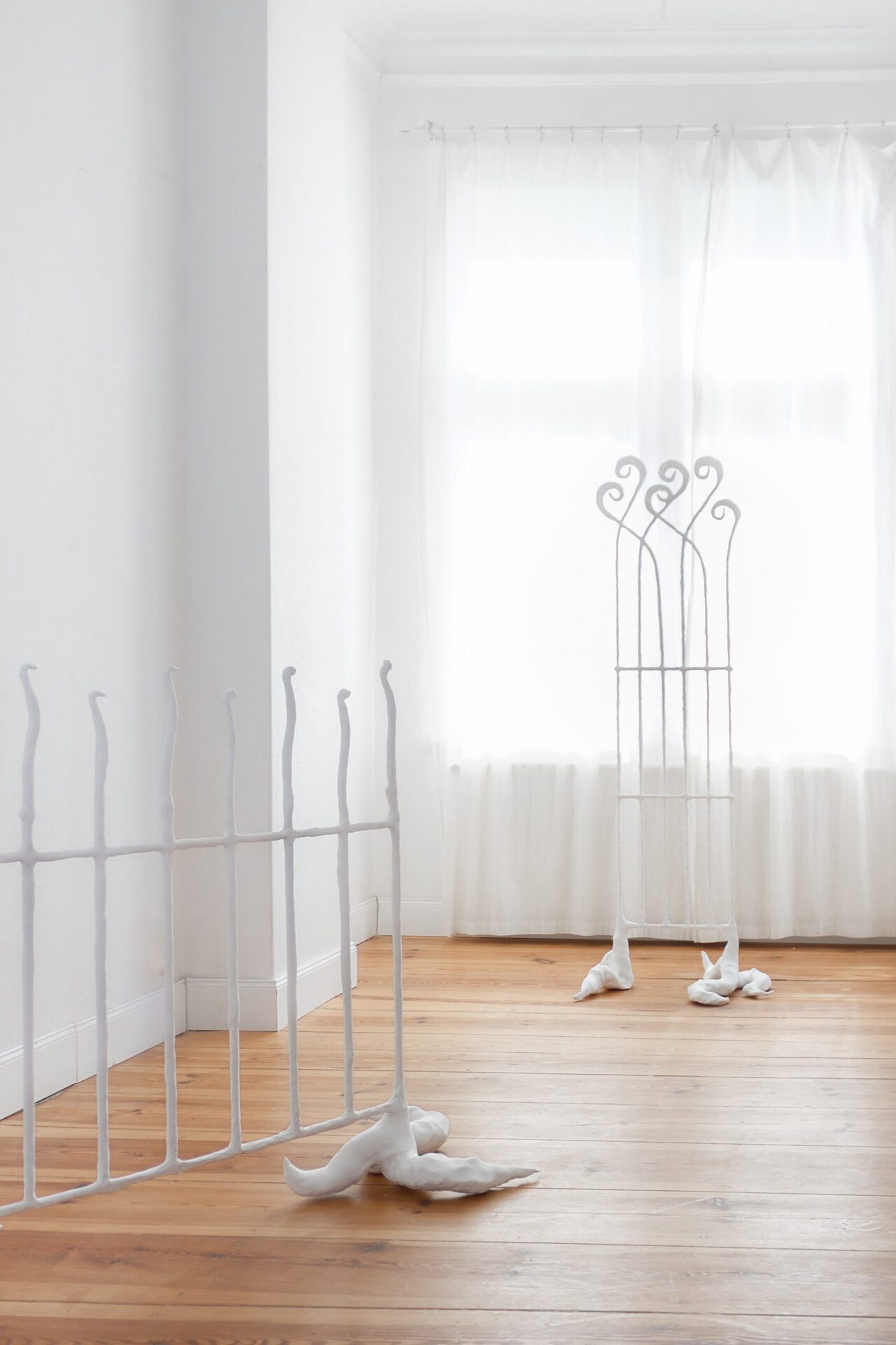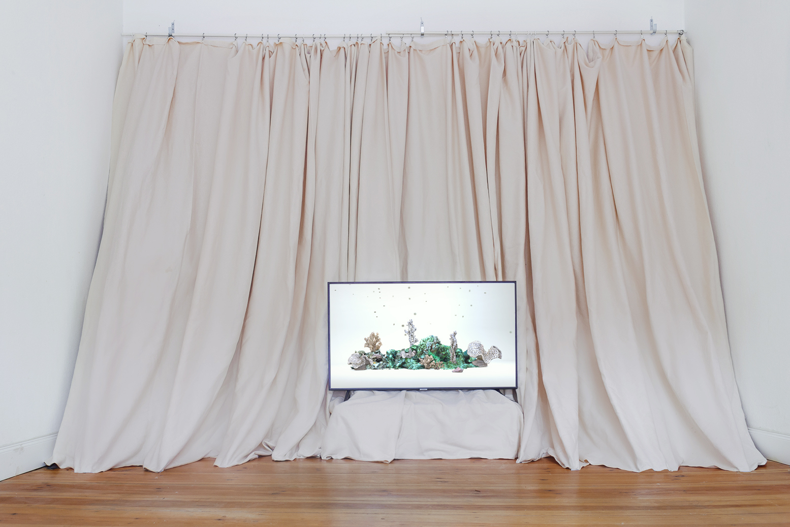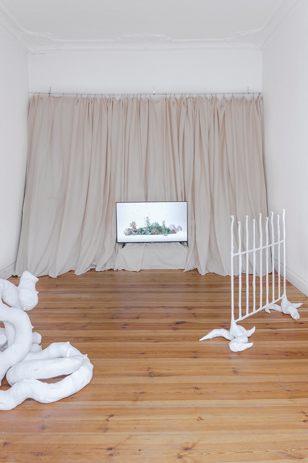 In PARASITES OF FRAGMENTED GARDENS, garden fences and thorn tendrils become alive, they drag themselves through a stage-like installation in an intermediate stage of being subject and object, of emancipation and subordination. The tendrils appear fragmented and broken. They arrange themselves into a structure that can be seen both as a whole and as a composition of individual parts. Fences that are rigid become zoomorphic, elude their limiting functionality and are detached and seemingly lost in the room. In front of a curtain, like a theater stage, there is a screen that shows changing still lifes in an empty white room. The landscapes are generated from scientific 3D scans, which are used, for example, to monitor dying coral reefs or from photogrammetry by private nature lovers and generic CGI 3D models.