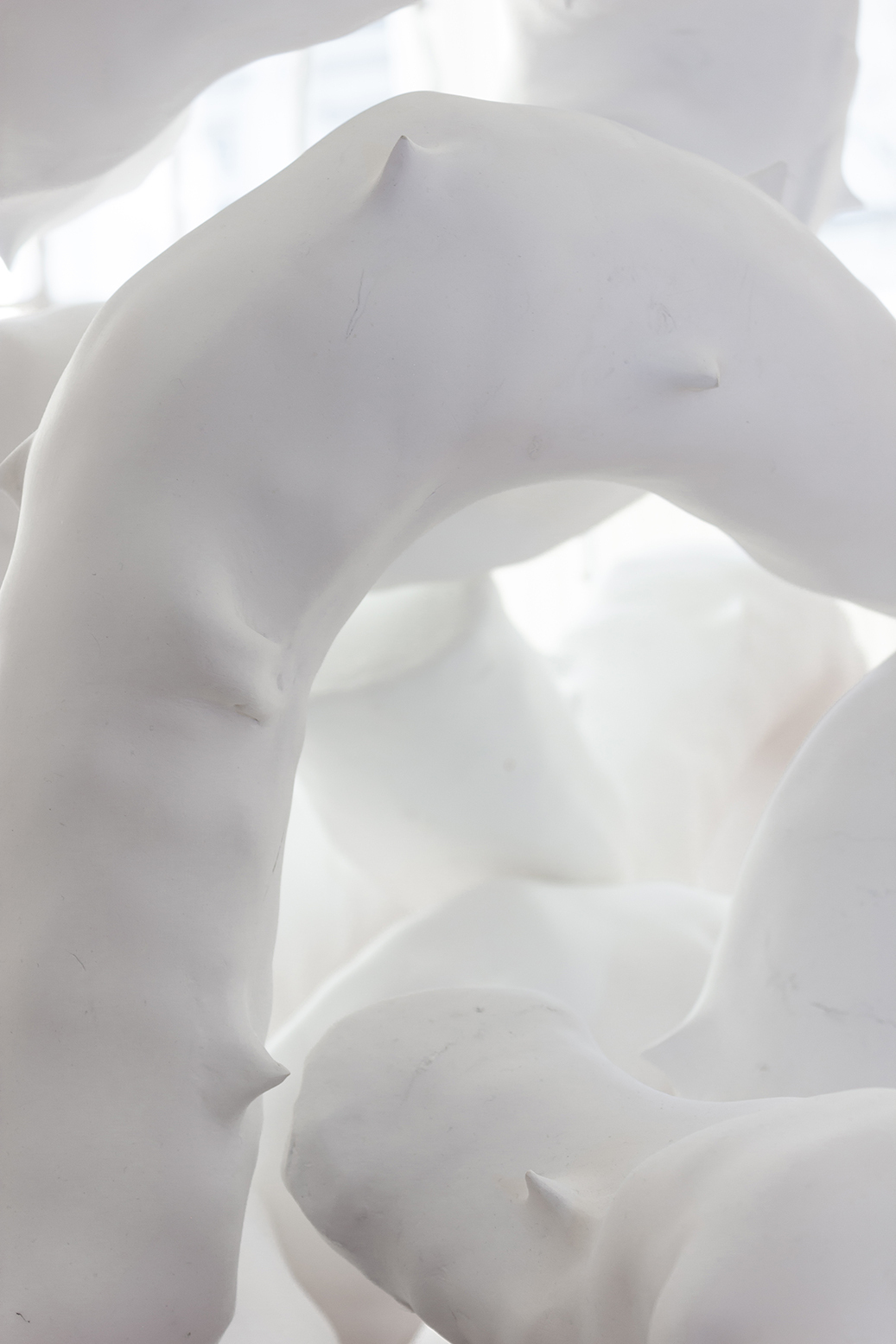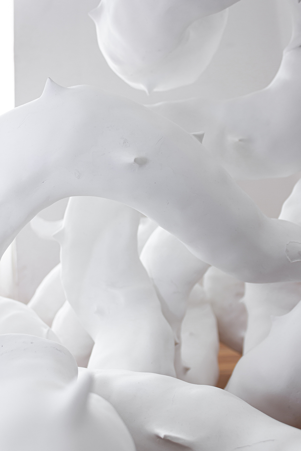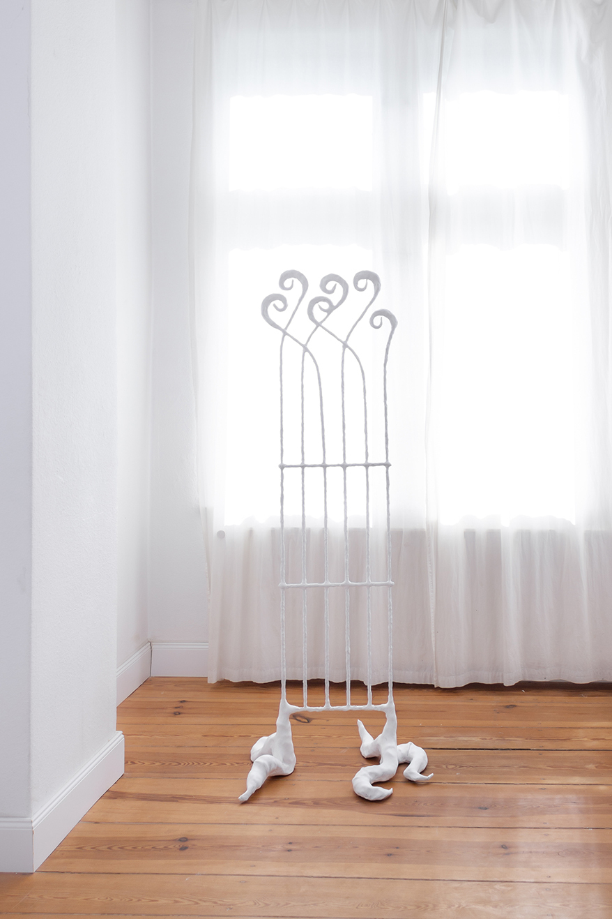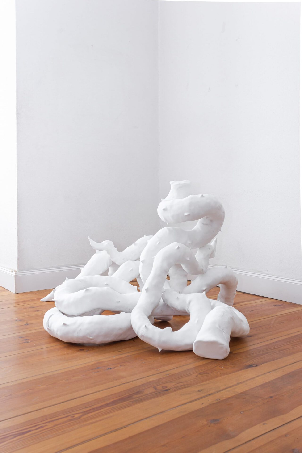 In PARASITES OF FRAGMENTED GARDENS, garden fences and thorn tendrils become alive, they drag themselves through a stage-like installation in an intermediate stage of being subject and object, of emancipation and subordination. The tendrils appear fragmented and broken. They arrange themselves into a structure that can be seen both as a whole and as a composition of individual parts. Fences that are rigid become zoomorphic, elude their limiting functionality and are detached and seemingly lost in the room. In front of a curtain, like a theater stage, there is a screen that shows changing still lifes in an empty white room. The landscapes are generated from scientific 3D scans, which are used, for example, to monitor dying coral reefs or from photogrammetry by private nature lovers and generic CGI 3D models.