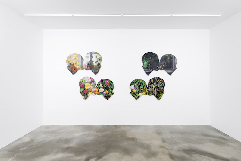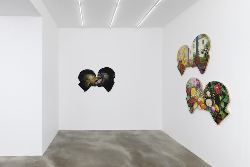 The works of the second section of the exhibition take the form of the silhouette of an embrace. They are juxtaposed with the paintings of the first section and seem to comprise a counterpoint. Brambora here represents intimacy, private life, a sense of sanctuary. These are no longer scenes of the outside world but interior perspectives. The artist develops a new body of work which refers to still life tradition, replacing it in the context of a contemporary apartment. The images evoke different moments and sentiments linked to relationships, notably amorous ones, between individuals: sometimes painful, dark, luminous, outrageous…