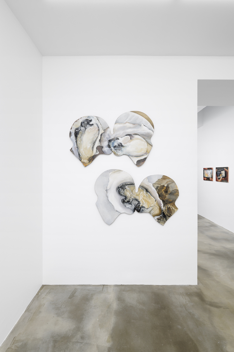 This group is supplemented by three other paintings. In the first are seen two dogs, in a pose halfway between play and combat. The two other paintings offer an interior view of an open oyster, creating a feeling between attraction and repulsion. These allegories dredge up ambiguities that generate malaise. The artist seeks to illustrate the sensation of discomfort: this feeling to which we have difficulty putting into words.