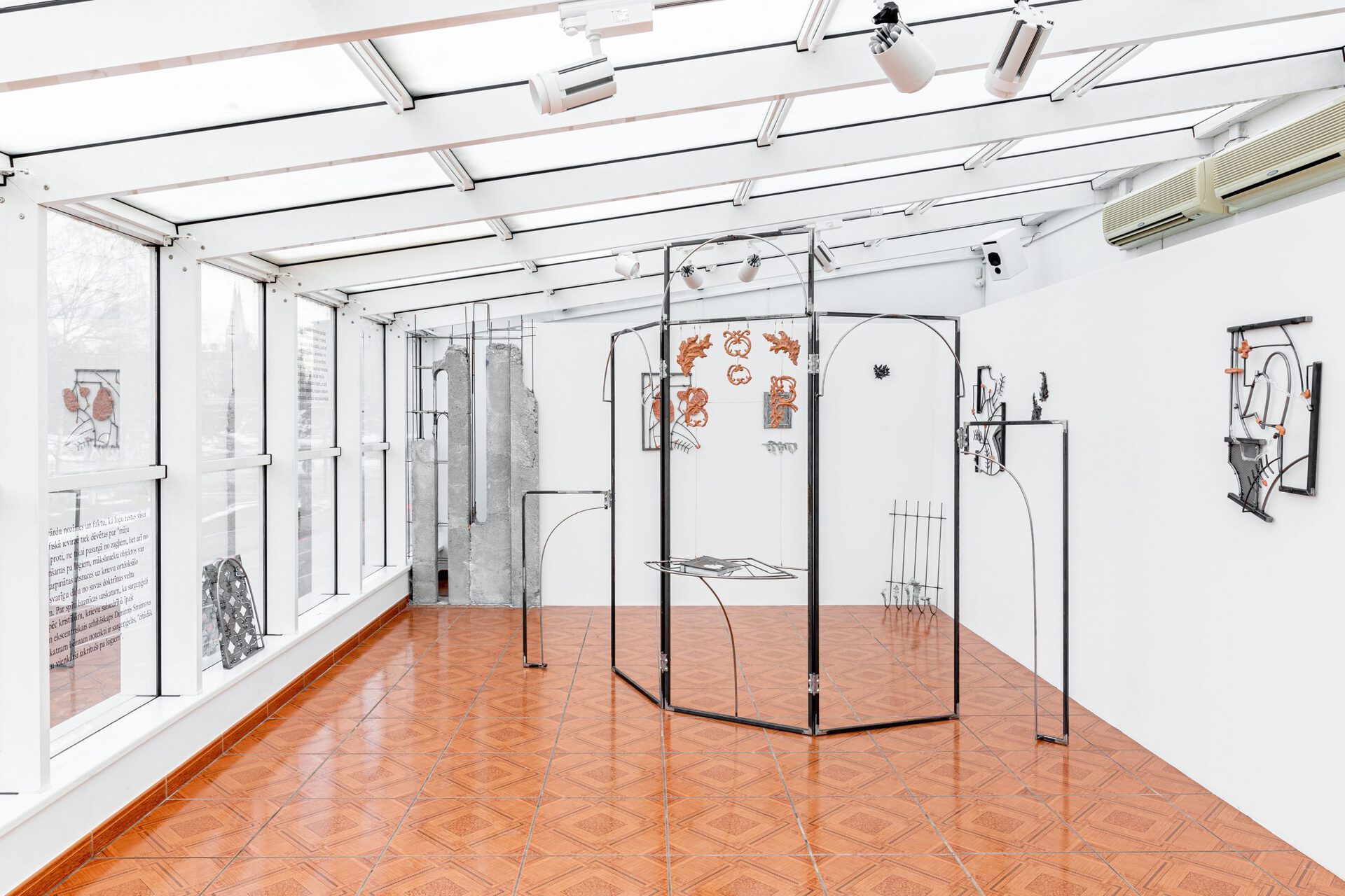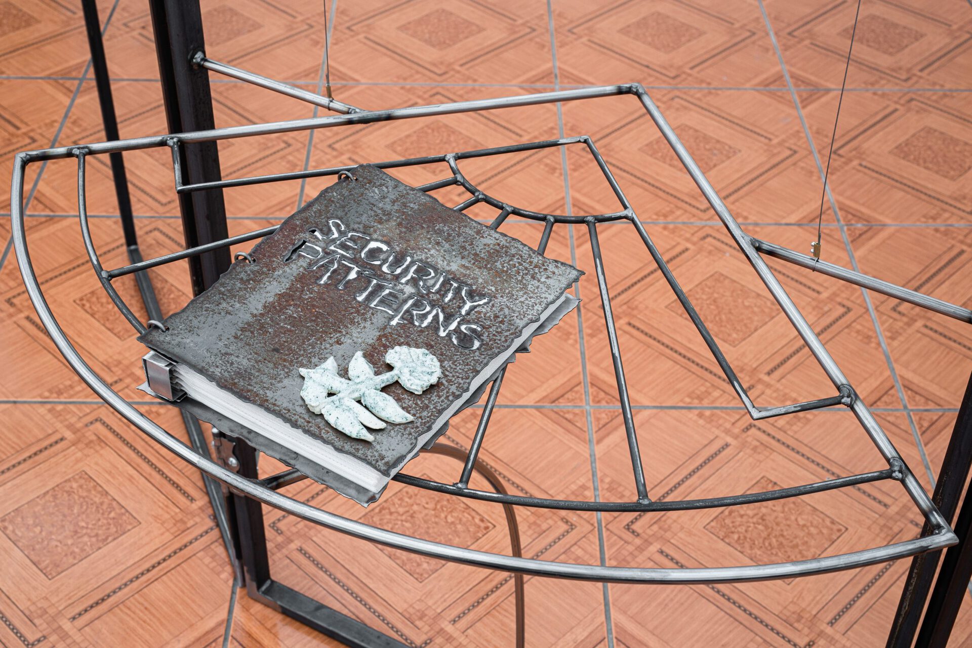 The central reference points of the installation are most notably the metallic, burglar-proof window fastenings patented in 1886 by John Wesley Harbert, yet window grilles have been present since times of antiquity, having previously been made of perforated stone. Although the primary function of the grilles has always been pragmatic, early examples show these protection “landscapes” were stylised with an intricate ornamental pattern, often incorporating plant motifs and recurrent geometric strings, representing religious themes such as monotheism and divine unity. “God is in the details” - in the literal sense. The objects displayed in the exhibition communicate allegorically by “beating around the bushes” (or “through flowers” - a Latvian idiom that indicates an oblique manner of speaking) and through literal, unambiguous floral ornamentalism - invites the viewer to ponder the reasons of equivocal expressions and ways in which other forms of protection are manifested.