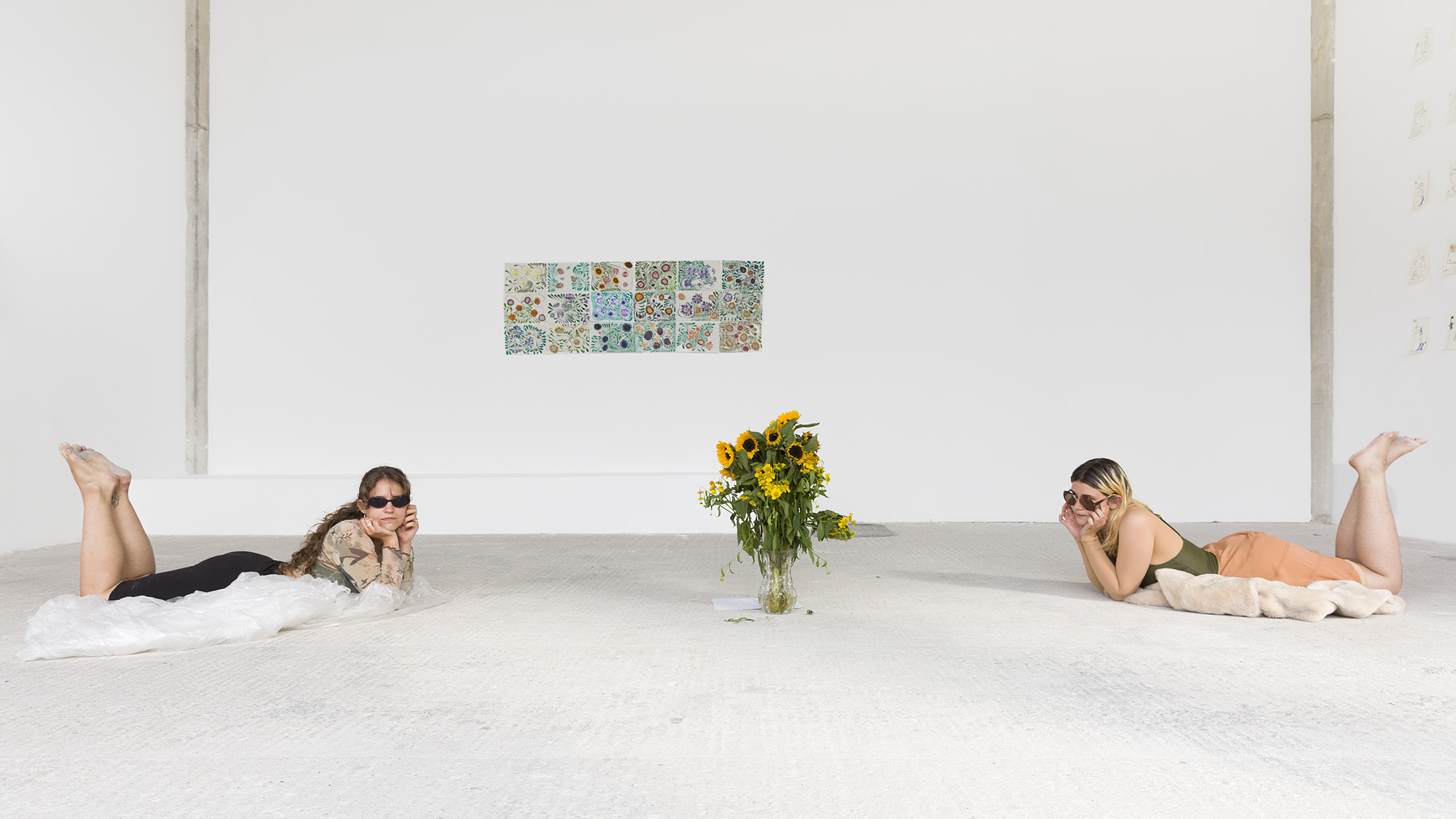 sowie „performativen Elementen“, also zu Kunst gewordene Reste ihrer Performances, in der Mitte des Raumes. Hierbei handelt es sich um langstielige Blumen, die in einem großzügigen Kreis um eine leere Karaffe und einen Stapel Essays ausgelegt sind. Darin deutet sich bereits an, was sich in den diversen Zeichnungen der Künstlerin, zum einen thematisch, aber vor allem konzeptuell, fortsetzt. Der Kreis besteht aus Sonnenblumen und gelben Wildblumen, die inmitten des kargen Betons ihrem ursprünglichen Kontext gewaltsam entrissen scheinen. Dank der akkuraten Reihung des organischen Materials bekommt das Ganze einen geradezu rituellen Charakter, eine Beschwörung der Natur mit den Mitteln der sorgfältigen Organisation.