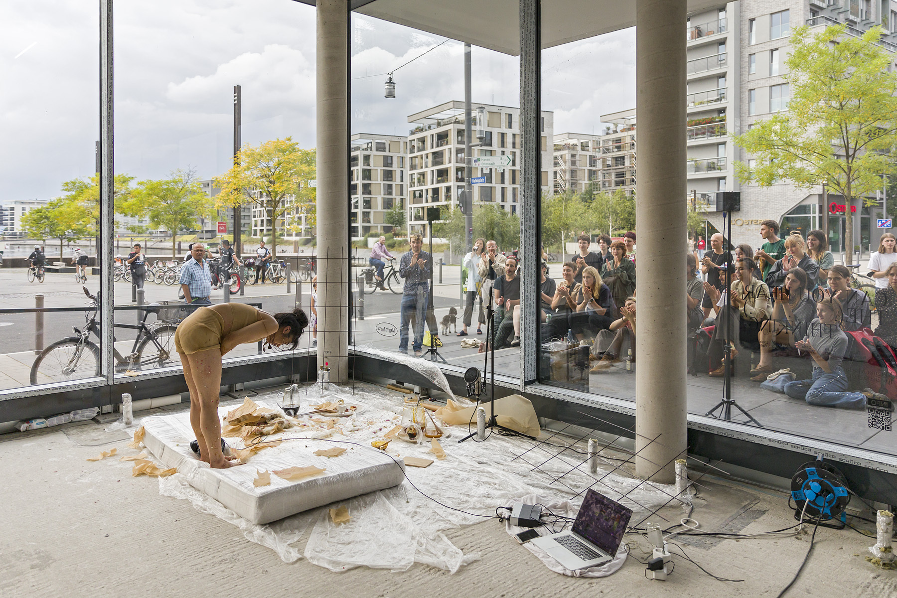 Auf der gegenüberliegenden Seite des Raumes befindet sich eine Matratze auf mehreren Schichten transparenter Folie, Gefäße mit erkalteter Zuckermasse, Spachtel, Flakons und Papierstreifen liegen herum. Bei genauerem Blick sind auf letzteren ausgerissene Haare zu entdecken. Gänseblümchen und Zuckerstreusel kleben an der Folie oder liegen auf kleinen Haufen. Als wäre es ein Tatort, lässt sich durch die Überbleibsel eine vorhergegangene Szene ableiten. Die Unordnung, ja das Chaos, lässt auf ein enthemmtes Geschehen schließen. Gleichzeitig wird dieses durch die Unmengen an Folie ad absurdum geführt; der Ausstellungsraum soll scheinbar von der Sauerei unberührt bleiben. Der durch die Folie begrenzte Teil wird zum autonomen Kunstraum des performativen Exzesses. Es handelt sich bei all dem um die Reste von Fan-Yu Pus Performance Farewell, from a skin level, die sie insgesamt viermal, abgeschottet hinter den Glasfronten, einem draußen verweilenden Publikum zeigt. In einer Mischung aus Versunkenheit und Exposition bewegt sich die Künstlerin auf ihrem abgesteckten Terrain, beginnt eine sugar waxing Prozedur, sich also die Zuckermasse auf die nackten Beine und Arme zu streichen, das Papier in Stückchen zu zerreißen, auf die klebrige Masse aufzulegen und abzureißen. Mal trägt sie Kopfhörer und singt und tanzt vollkommen unbedarft vor sich hin, mal wirkt sie verzweifelt und beginnt erratisch nach etwas Unsichtbarem auf dem Boden zu wühlen oder die Scheibe vor sich zu liebkosen. Letzteres wirkt wie eine Markierung oder Anerkennung der Grenzlinie zwischen Öffentlichkeit und fiktiv Privatem, eine Grenze, die sie immer wieder selbst überschreitet. Vereinzelt sucht sie den Blick des Publikums, manchmal lasziv, manchmal hilflos, in jedem einzelnen Zustand jedoch blüht sie unmissverständlich und theatral auf. In ihrer nude-farbenen, knappen Bekleidung mit Top und kurzer Hose wirkt ihr Körper oftmals zart und verletzlich, wobei die kraftvollen Bewegungen, mit denen sie all ihre Handlungen vollzieht, ein Narrativ vom Ausgeliefertsein sogleich unterbrechen. Zudem ist das angerichtete Beauty-Schlachtfeld ja ihr eigenes Werk. Am Ende hört man im dumpfen Sound durch die Scheibe noch ein schüchternes „Goodbye“, wodurch sie uns, den Publikumsvoyeur*innen, das Wissen um die eigene Beobachtung