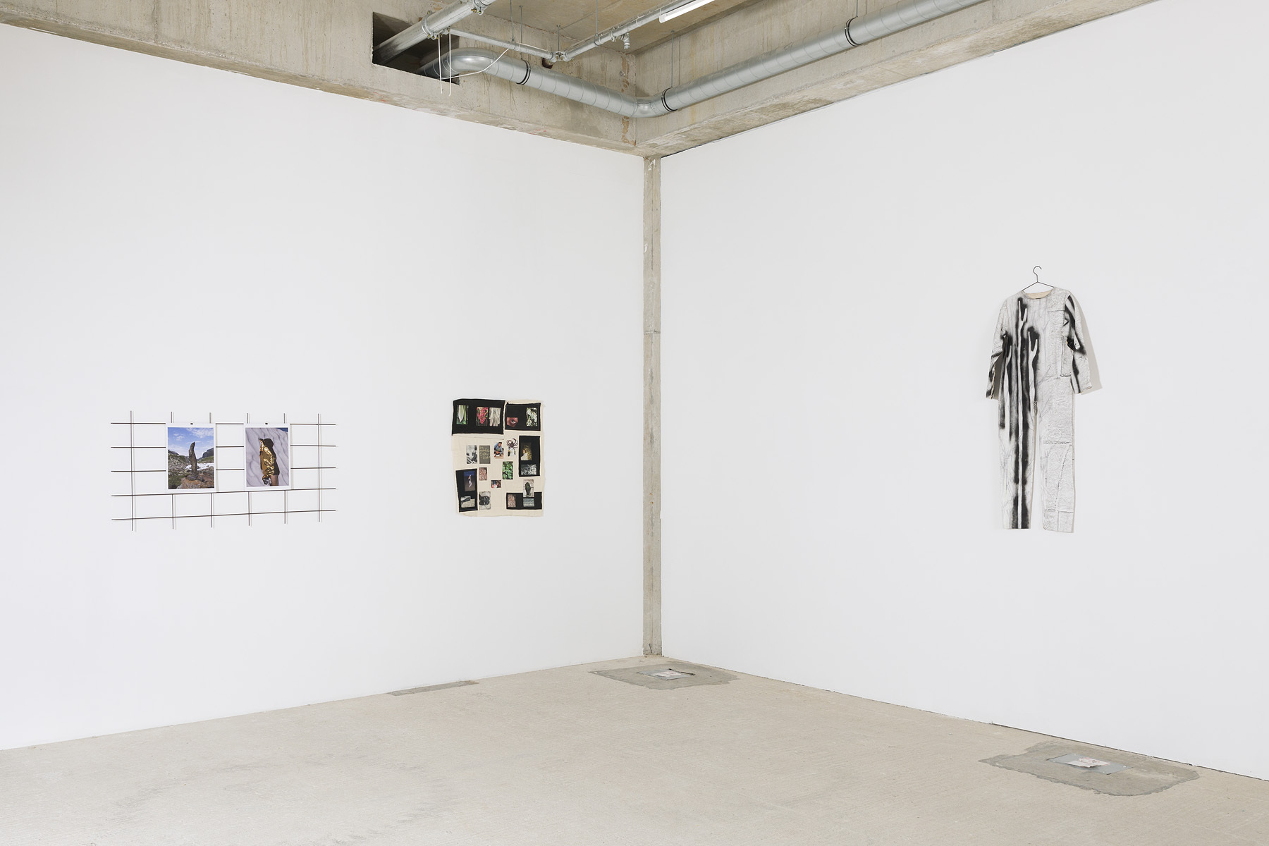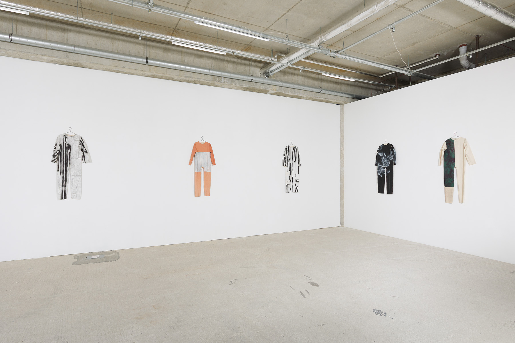 Im anschließenden Raum zeigt Luisa Heinz neben zwei mixed media-Fotoarbeiten die Reihe New Surrounding. Fünf ihrer „Bildkörper“, selbst genähte und anschließend bemalte Overalls aus Leinwandstoff, hängen an Drahtbügeln an der Wand. Die Farbgebung der einzelnen Arbeiten variiert, harte schwarz-weiß Kontraste wechseln sich mit sanftem Rosé ab. Auffällig sind die organischen Prints von Ästen oder Blattstrukturen, ein Einschreiben von Natur in Bild wie Kleidung, und der vor allem durch hippieske Mode konnotierte Batik-Look. Dank Heinz‘ künstlerischer Aktualisierung bekommen die Overalls einen Wiedererkennungswert, ein ökologisches branding. Dass die Stücke alle unisex, also keinen tradierten Maßen von Mann und Frau zuzuordnen sind, macht sie umso zeitgemäßer. Sie sind tragbare Kleidung und in ihrer