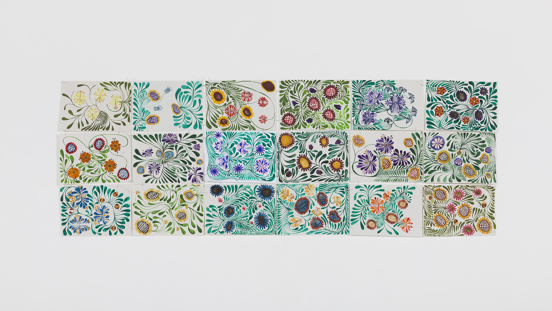 Dieser penibel ordnende, aber vor allem der Wiederholung verfallene Gestus findet sich in einer Reihe von 6x3 circa DIN A4 großen Zeichnungen mit dem Titel Etwas wissend noch ein Stück weitergetrieben. Blumen und Blätter in verschiedenen Farben und Variationen, doch wie aus einem Baukasten in der immer gleichen Form, ranken sich umeinander. Aus dem Gesamtzusammenhang isoliert, wirken die Pflanzen wie minutiöse, aber unaufgeregte Ornamentstudien, im Kontrast hierzu entwickeln die Bilder in ihrem Zusammenspiel jedoch das Unbehagen einer zwanghaften Wiederholung. Der Hinweis, dass die ausgestellten Werke im tiefsten Lockdown entstanden, lässt die fragilen Blumen und ihre Ranken im Licht von Bewältigungsstrategien tiefer Krisen erscheinen. Sozusagen eine Gleichzeitigkeit von Verinnerlichung und Ausbruch: das verwundete, auf sich selbst zurückgeworfene ICH äußert sich im Akt des Wiederholens, dem Zeichnen per se, und drängt dadurch an die Oberfläche. Die zeichnende Hand wird zum Vehikel therapeutischer Selbstversuche, einem Kampf gegen Einsamkeit und Verzweiflung. Der hier zum Ausdruck kommende Schmerz bleibt jedoch nicht bei der Person der Künstlerin stehen, sondern wird ein objektiver, den der Großteil der Besucher*innen wohl qua Pandemieerfahrungen nachvollziehen kann.