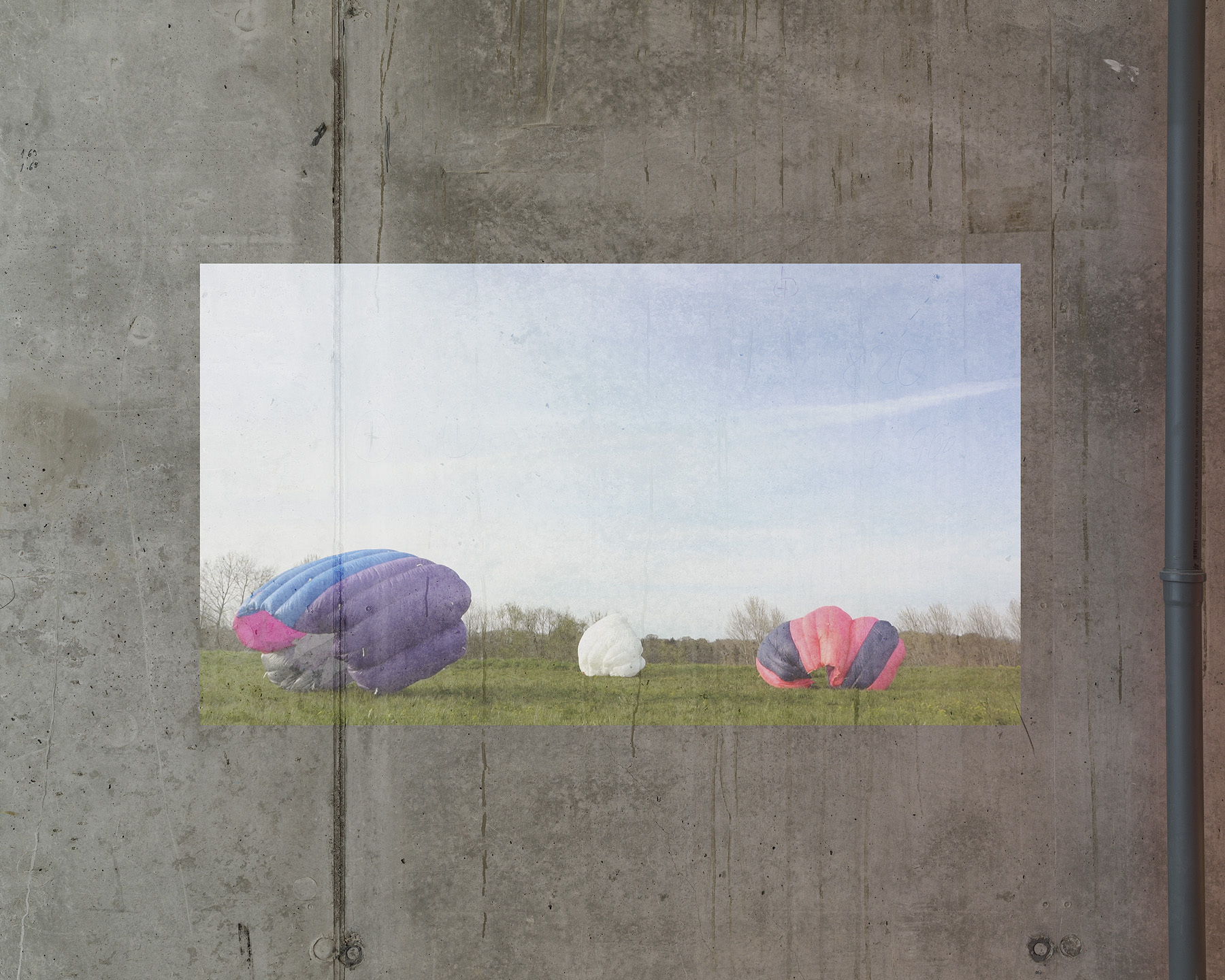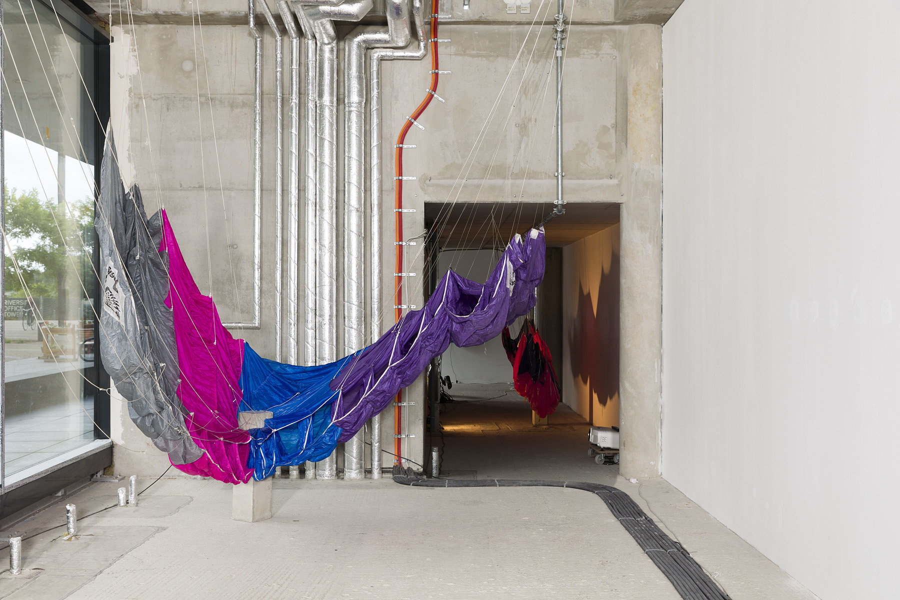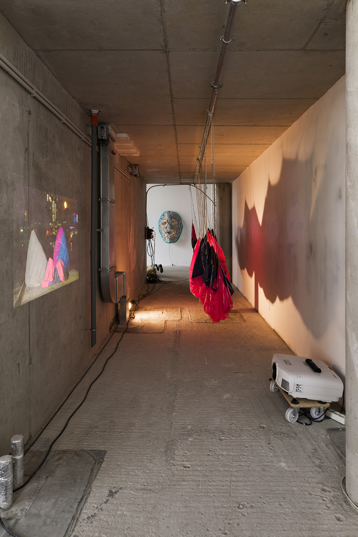 Daria Narazenkos Zugang zum offenen Themenkomplex Performance, Körper, Raum ist weniger an einen tatsächlichen Körper gebunden, wie das bei Patrizia Martsch der Fall ist. In dem durch einen einzelnen Spot beleuchteten Gang hängt ein pink-blauer Fallschirm (Flight Attempt 2) an seinen Schnüren an einem Rohr befestigt von der Decke, ein niedriger Betonpfeiler verhindert, dass dieser den Boden berührt. Durch den Spot entsteht ein wandfüllendes Schattenspiel, das dem ohnehin schon merkwürdig lebendig wirkenden Objekt etwas Einschüchterndes verleiht. Gegenüber der hybriden Gestalt ist ein Video an die Betonwand projiziert. Hierin zeigt Nazarenko in den Kontrasten von freier Natur und Urbanität eine am Urban Street Dance orientierte Performance mit den ausgestellten Fallschirmen. Auf einer Wiese unter blauem Himmel breiten sich die Stoffe durch den Wind zu asymmetrischen Formen aus oder blasen sich über den Performer*innen zu wulstigen Planen auf, die drohen wegzugleiten. Im Gegensatz dazu stehen die Bilder von zwei Performer*innen, die sich auf dem Kies eines Gleises gegenübersitzen, im Hintergrund die erleuchtete Großstadt. Ihre gesamten Körper sind vom Nylon der Schirme bedeckt, wie ein fragiler Schutz vor der Außenwelt. In der Bewegung zwischen Bodenhaftung und Fliegen werden Sehnsüchte nach