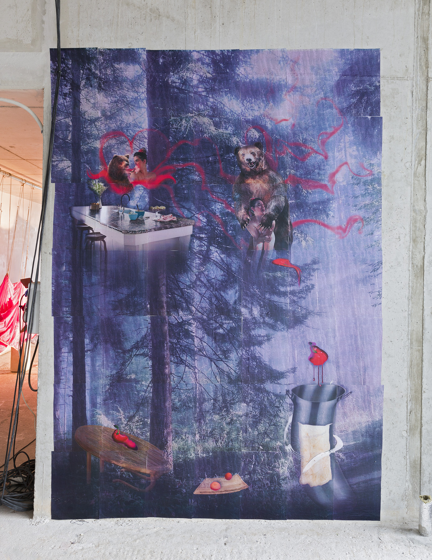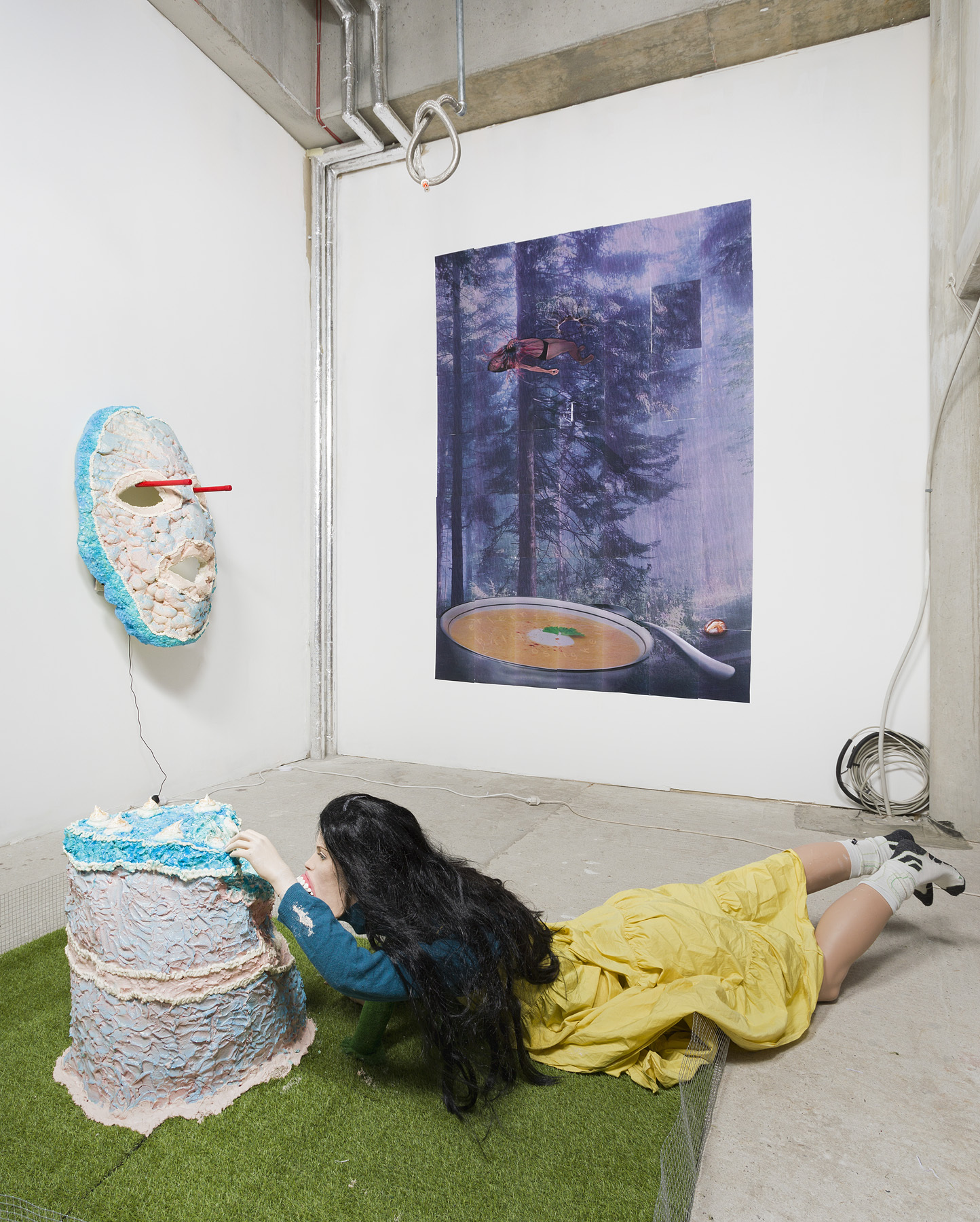 Vor allem die multimediale Installation Erlernte Hilflosigkeit von Patricia Martsch zieht durch das Fensterglas die irritierenden Blicke vorbeigehender Passant*innen auf sich. Ein lebensgroßes Mannequin, mit einer Perücke aus langem, schwarzem Haar, gelbem Rock, blauem Cardigan und Sportsocken bekleidet, liegt bäuchlings auf einem Stück eingezäuntem Zierrasen. Der tendenziell eher ausdruckslose Mund der Puppe wurde so zum bestialischen Schlund modifiziert, dass man meinen könnte, der Unterkiefer hänge sich gleich aus. Gleichzeitig starren die Augen der Puppe unbeteiligt in die Leere. Sie greift, von der eigenen Gier überwältigt, mit der bloßen Hand in eine kitschig-bunte mehrstöckige Torte, um sich buchstäblich das Maul zu stopfen. Die perverse Selbstbestrafung im zuckersüßen Gewand lässt die Puppe wie eine Schwester im Geiste der Protagonist*innen aus Ferreris Das große Fressen erscheinen, die sich standesgemäß dekadent im Kollektiv zu Tode fressen wollten. An der Wand gegenüber der Puppe hängt eine Maske, gleiches Material und Farbthema, durch zwei rote Stäbe befestigt, die sich durch die gespenstisch leeren Augenhöhlen bohren. Im Mund der Maske befindet sich ein Miniaturscreen, auf dem die Künstlerin verträumt im Gras liegend zu sehen ist; im gelben Kleid, Sportsocken, das schwarze Haar offen, ein Teddybär neben sich. Die Kleidung beider Protagonistinnen gibt sich als ein Code zu erkennen, als Verkleidung, dessen Schlüssel in den modernen Märchen des Disney Universums und seinen formelhaft dargestellten Prinzessinnen zu finden ist. Zwei großformatige Collagen auf denen ein dunkler Wald zum Hintergrund albtraumhaft-bizarrer, sexuell aufgeladener Elemente wird (die nackte Künstlerin vor einem ausgetopften Bären), rahmen die Installation räumlich wie konzeptuell. Der weiblich gelesene Körper wird in Martschs Installation zum Inszenierungsobjekt von