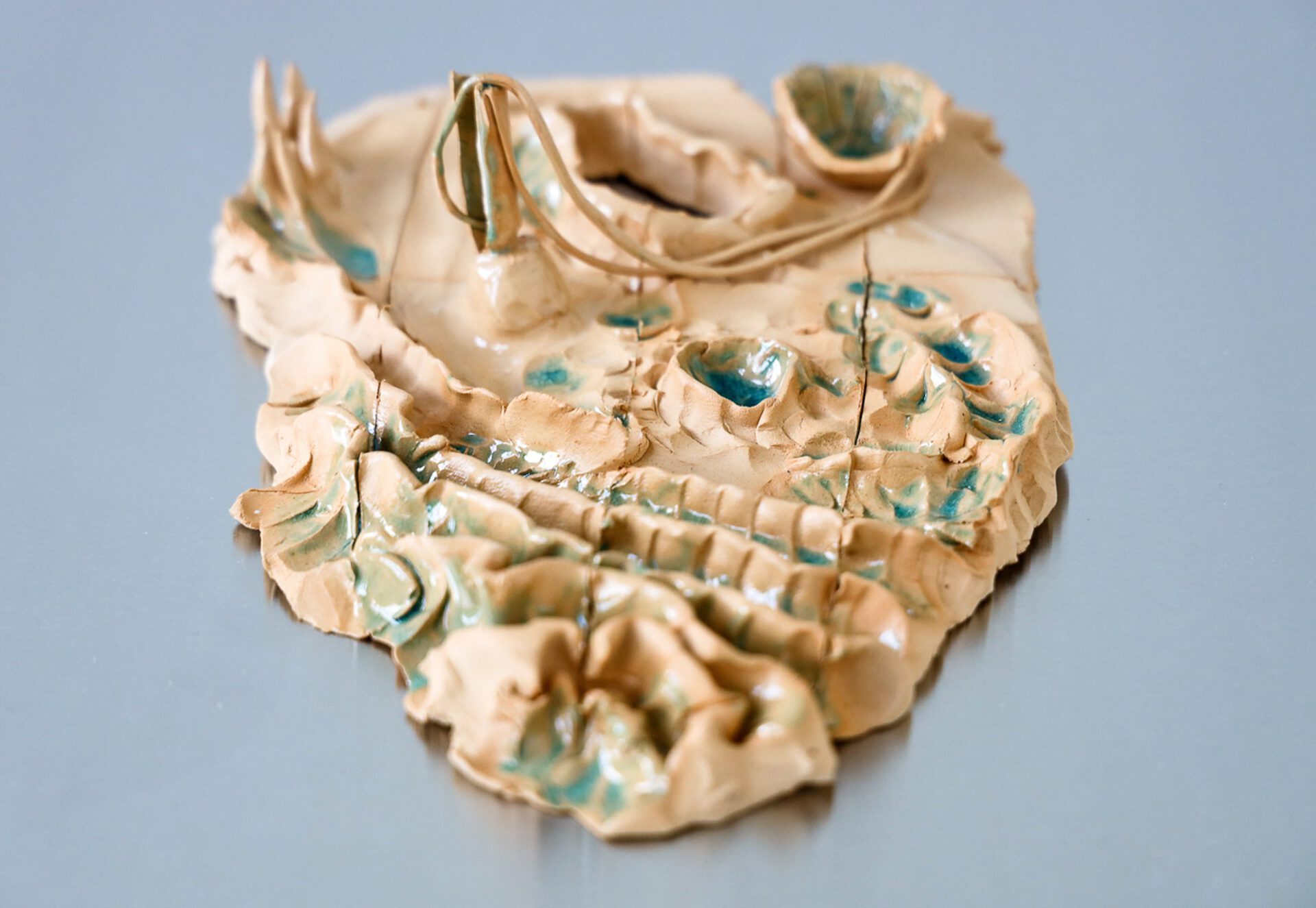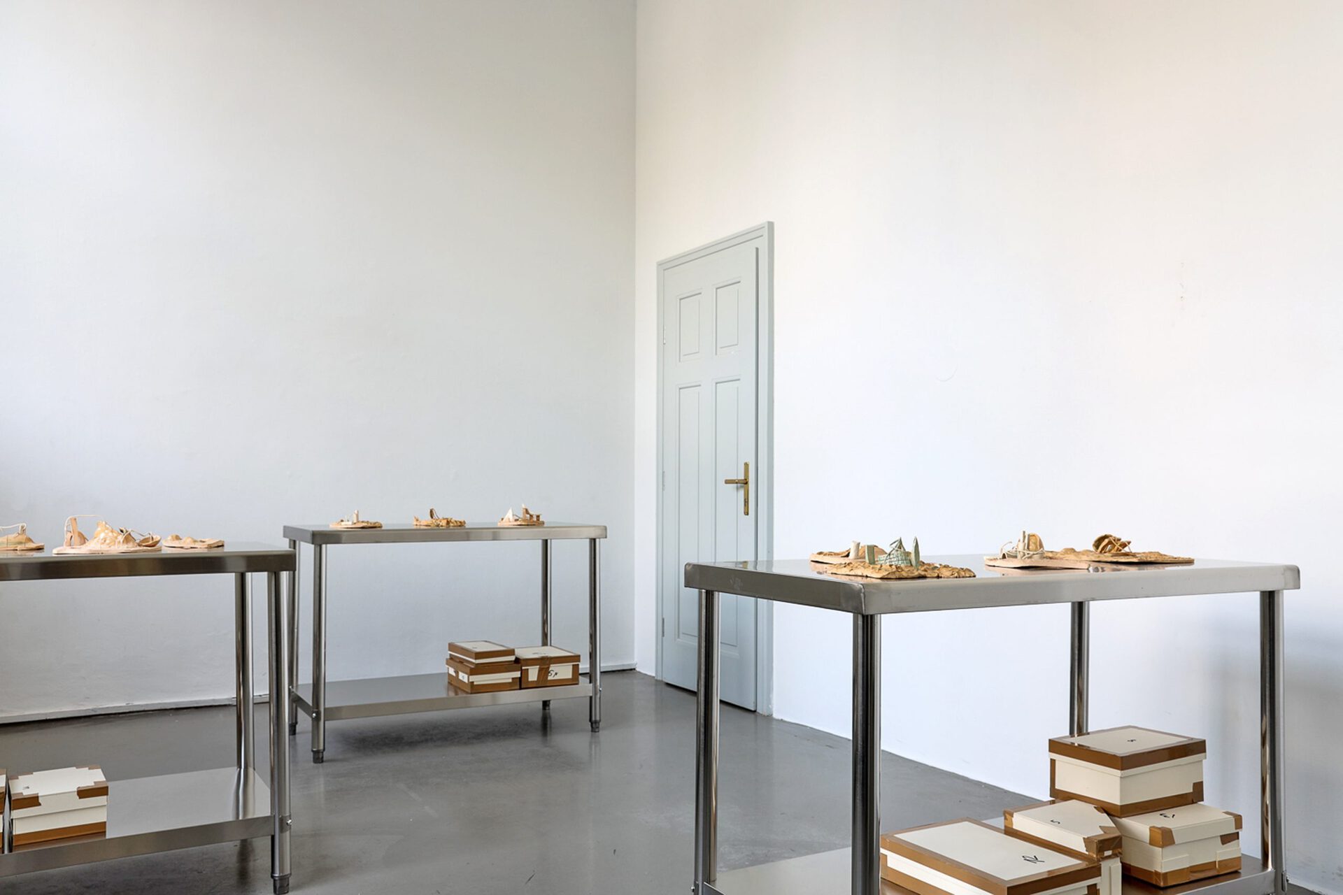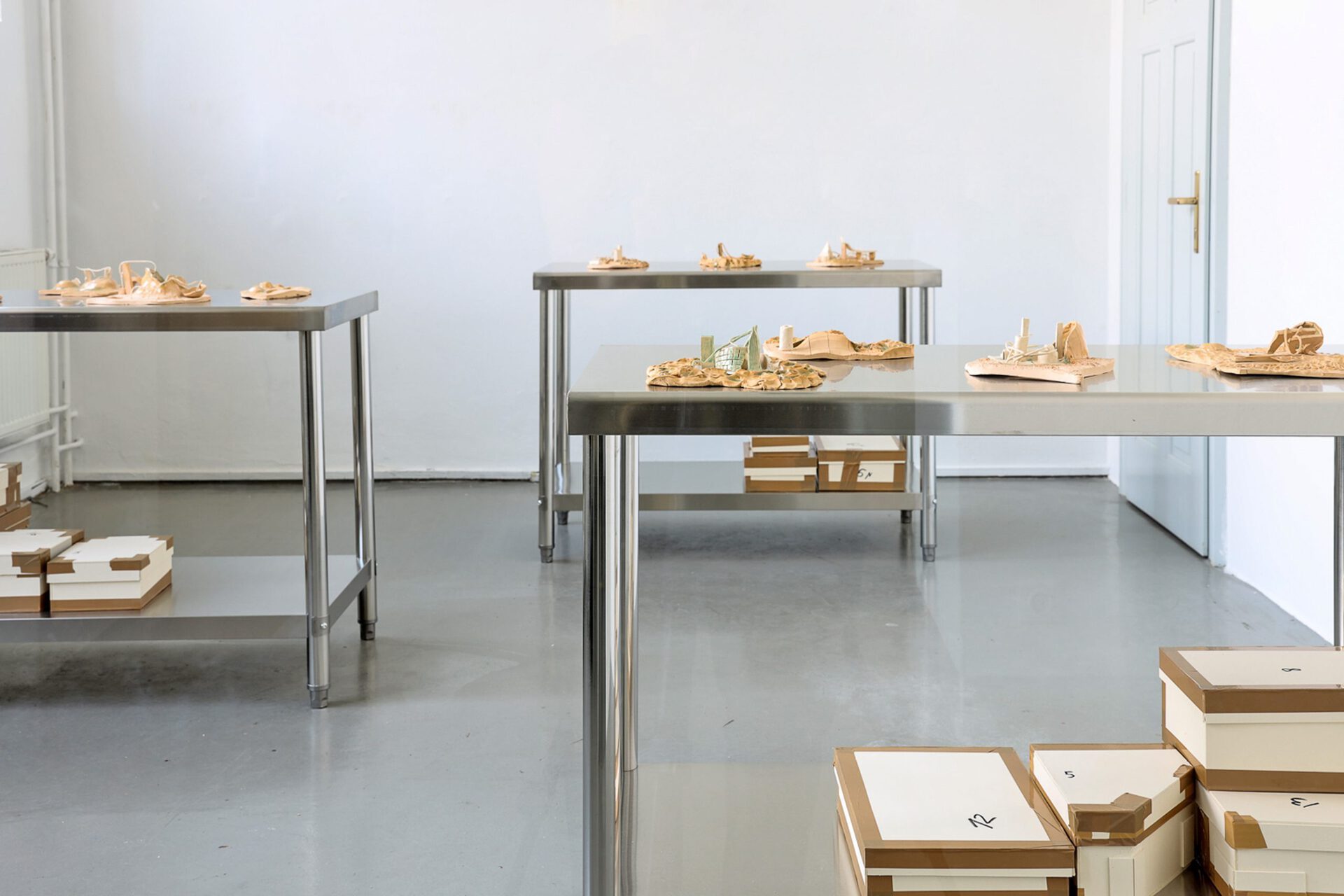 Spaces, Solo show by Anna Bochkova At Aquarium, Vienna From 14.06.2021 to 27.06.2021 Exibition text In the project 'Spaces' Anna Bochkova examines different concepts of infrastructural landscape. Through creating a performative laboratory of non-existing conceptual places and reflecting on the personal experiences and narratives of the artist, 'Spaces' presents us an alternative angle on the process of building an archive. The vision of ‘the future artifacts’ is very subtle, it dissolves in elements which remind us water, soil or stone, then it comes back in a ceramic wire which may give you the allusion of an usb-plug, or it might be the gigantic tube of an industrial site. So, in combining abstract organic form with precise industrial landscape fantasies, Anna Bochkova creates a space between bio- and technosphere in 14 pieces of the series ‘Spaces’. Her sculptures carry the potential of being parts of zoomed in google-earch site but also they keep their dystopian nature within them.Text
