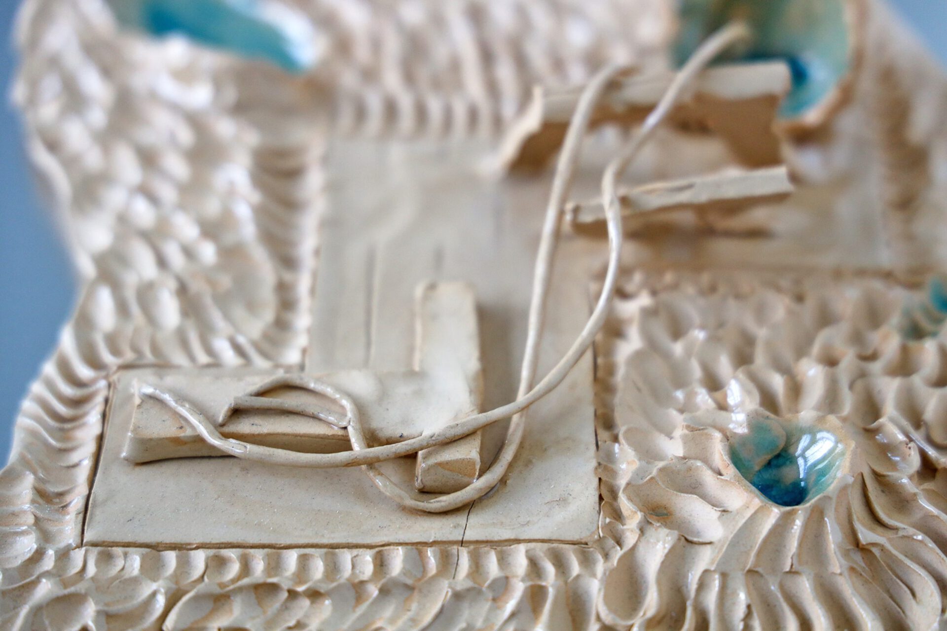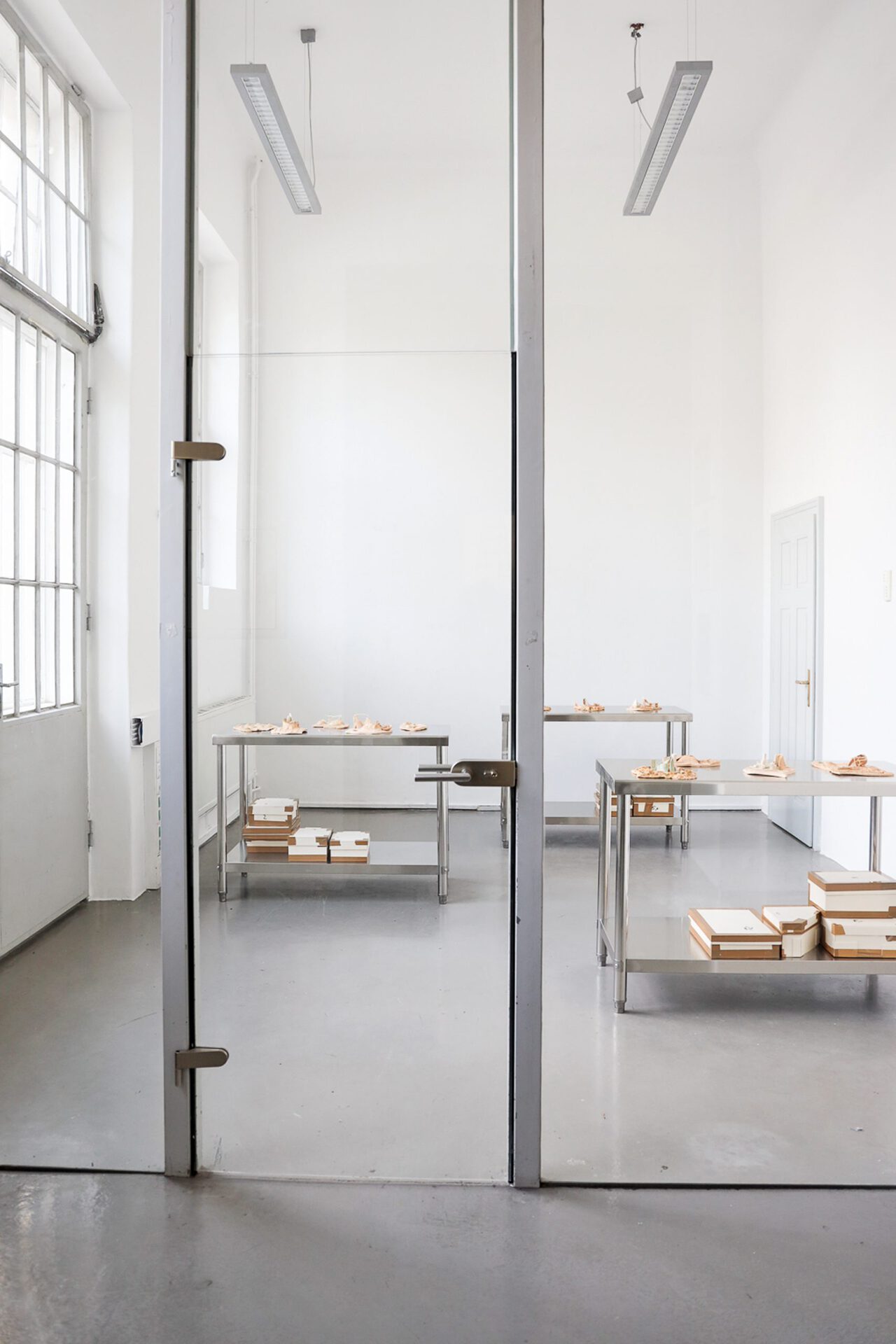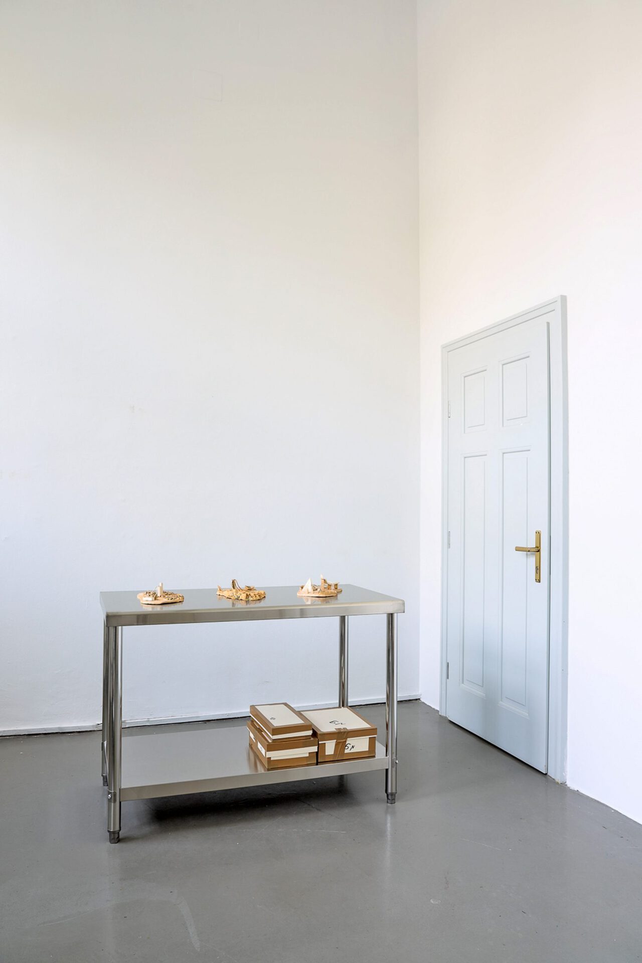 Spaces, Solo show by Anna Bochkova At Aquarium, Vienna From 14.06.2021 to 27.06.2021 Exibition text In the project 'Spaces' Anna Bochkova examines different concepts of infrastructural landscape. Through creating a performative laboratory of non-existing conceptual places and reflecting on the personal experiences and narratives of the artist, 'Spaces' presents us an alternative angle on the process of building an archive. The vision of ‘the future artifacts’ is very subtle, it dissolves in elements which remind us water, soil or stone, then it comes back in a ceramic wire which may give you the allusion of an usb-plug, or it might be the gigantic tube of an industrial site. So, in combining abstract organic form with precise industrial landscape fantasies, Anna Bochkova creates a space between bio- and technosphere in 14 pieces of the series ‘Spaces’. Her sculptures carry the potential of being parts of zoomed in google-earch site but also they keep their dystopian nature within them.Text