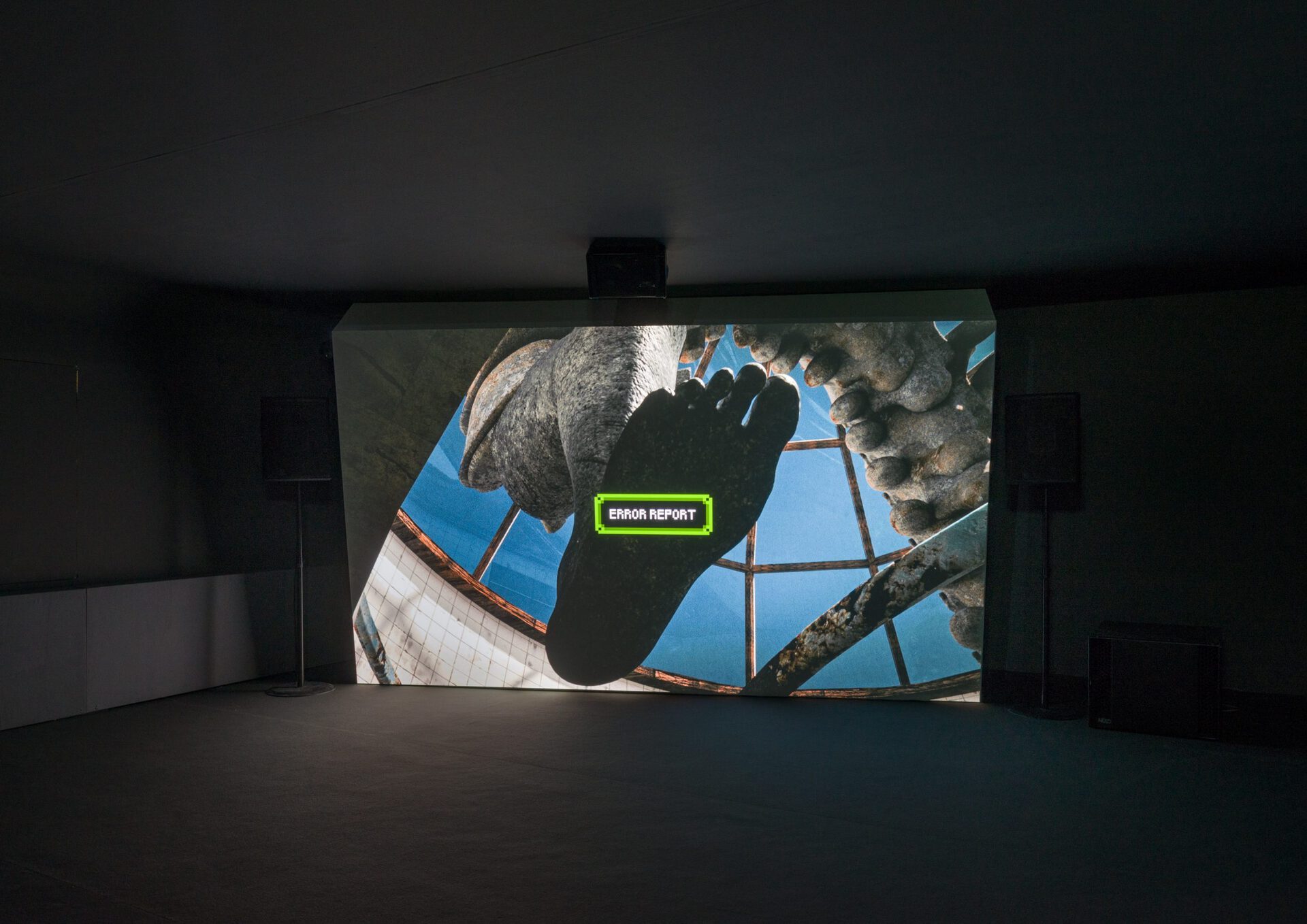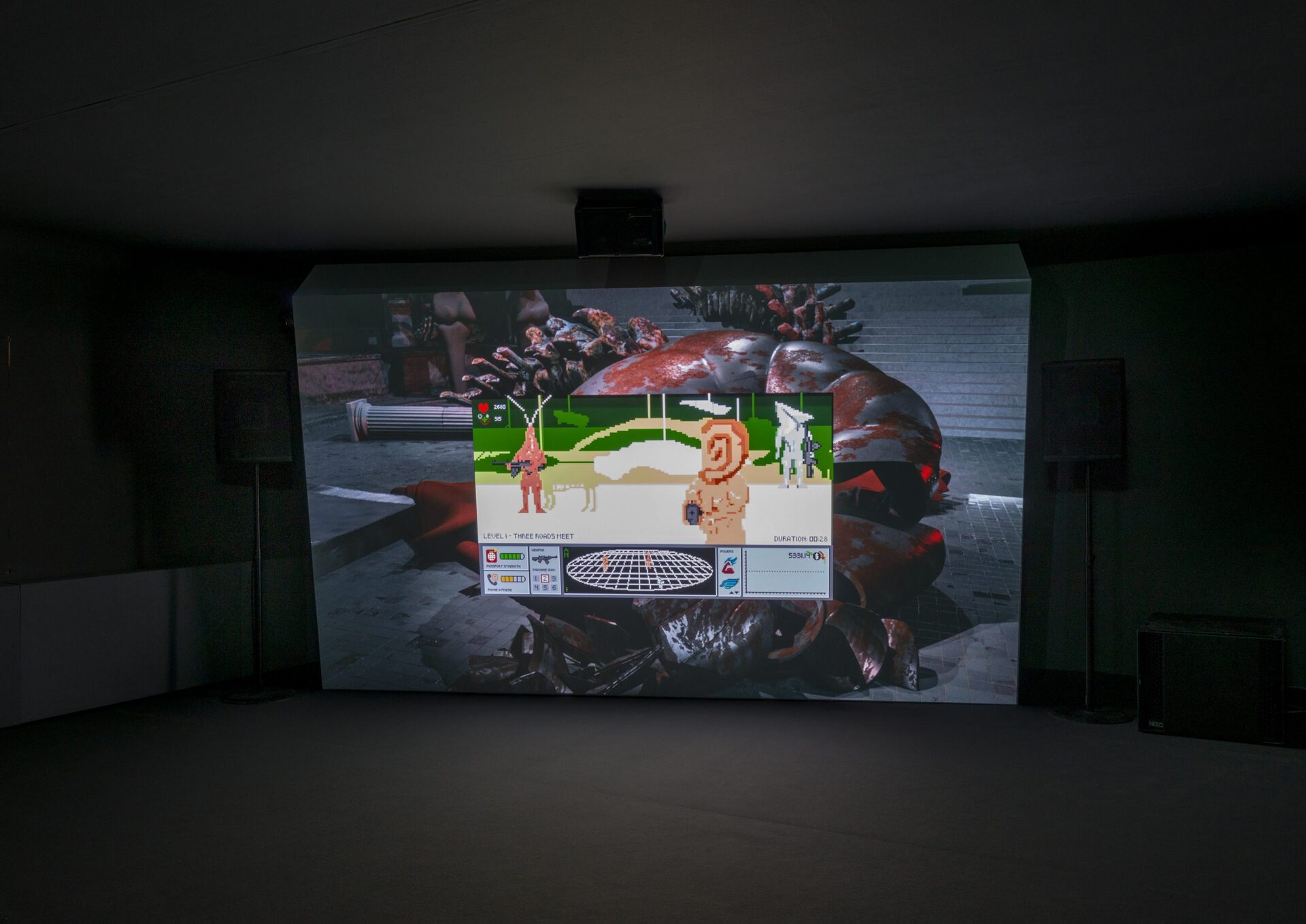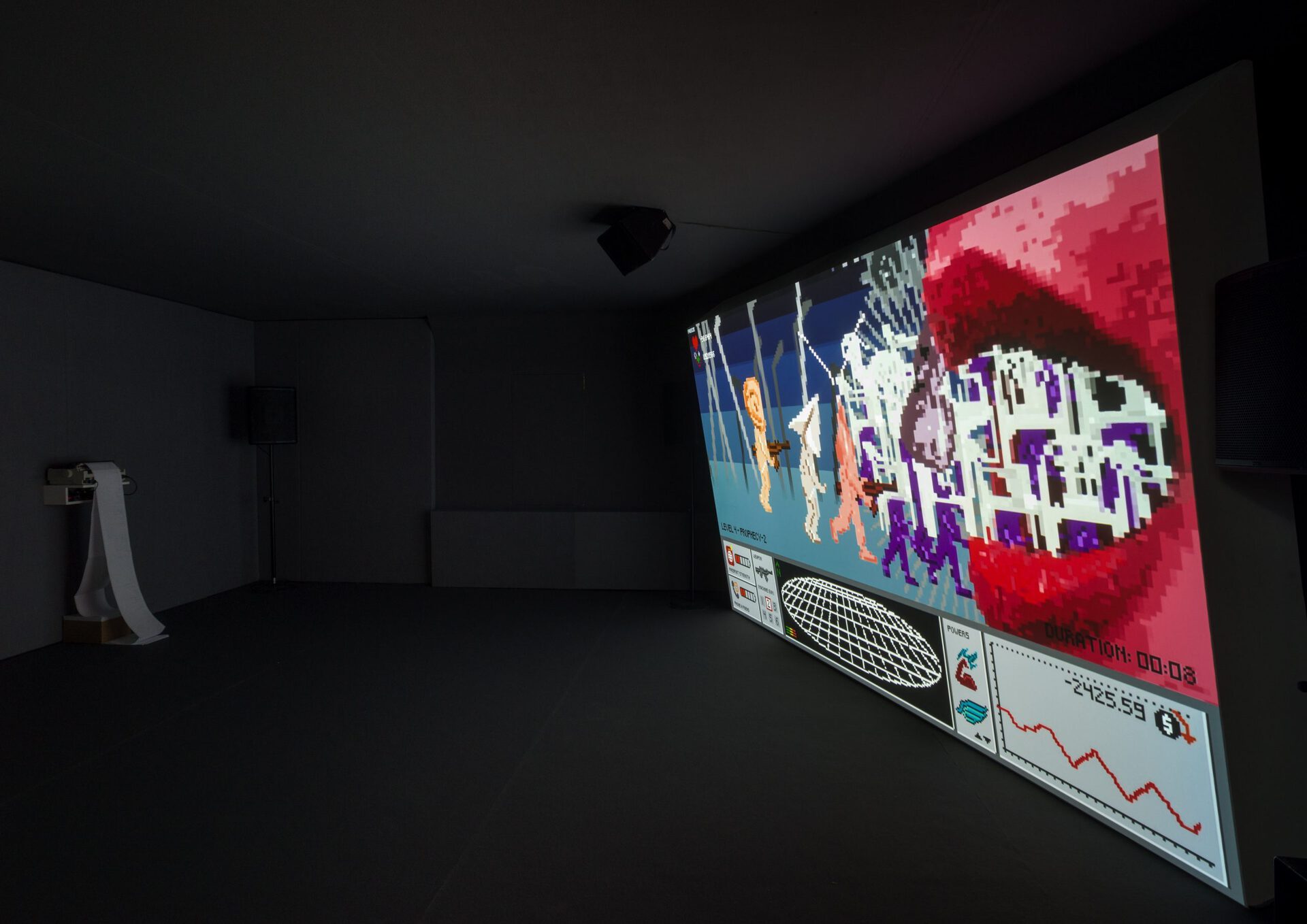 Nicht nur inhaltlich verhandelt Hamadehs Arbeit das Motiv des Bruchs, sondern integriert diesen auch in die eigene Form. Klaustrophobische 3D-Szenen wechseln und überschneiden sich mit der kruden 2D-Animation eines Computerspiels und werden mehrfach von dem theatralen Rezitieren des Texts, der zeitgleich live im Ausstellungsraum von einer beleuchteten Maschine gedruckt wird, unterbrochen. Hamadeh brilliert hier im Spiel mit Immersion und Distanz, mit der Verunsicherung von Grenzen: denen des Werkes, aber auch denen der Rezipient:innen. So zerschlägt die Arbeit mit dem zwischenzeitlichen Aussetzen des Videos bewusst den Sog der Projektion und lässt dagegen die Realität der Rezipient:innen einbrechen: Wenn plötzlich ein lautes Schellen erklingt, erscheint es im ersten Moment unklar, ob es nun „fiktiv“ ist oder sich in diesem Moment im Ausstellungsraum tatsächlich eine Katastrophe anbahnt. Das schlagartige Umschalten der Rezeptionsmodi, das Zurückgeworfen-Werden auf sich selbst und den Raum, der einen umgibt, trifft ins Mark. Immer wieder tut sich in Hamadehs Arbeit buchstäblich und im übertragenen Sinne der Boden auf und einmal mehr wird deutlich: Wir alle stehen auf brüchigem Grund, also: „Run, baby, run!“