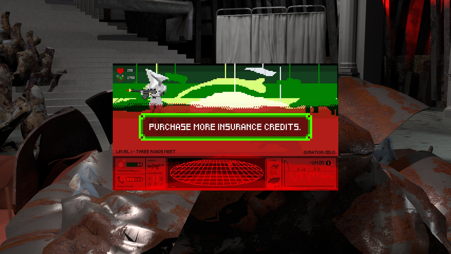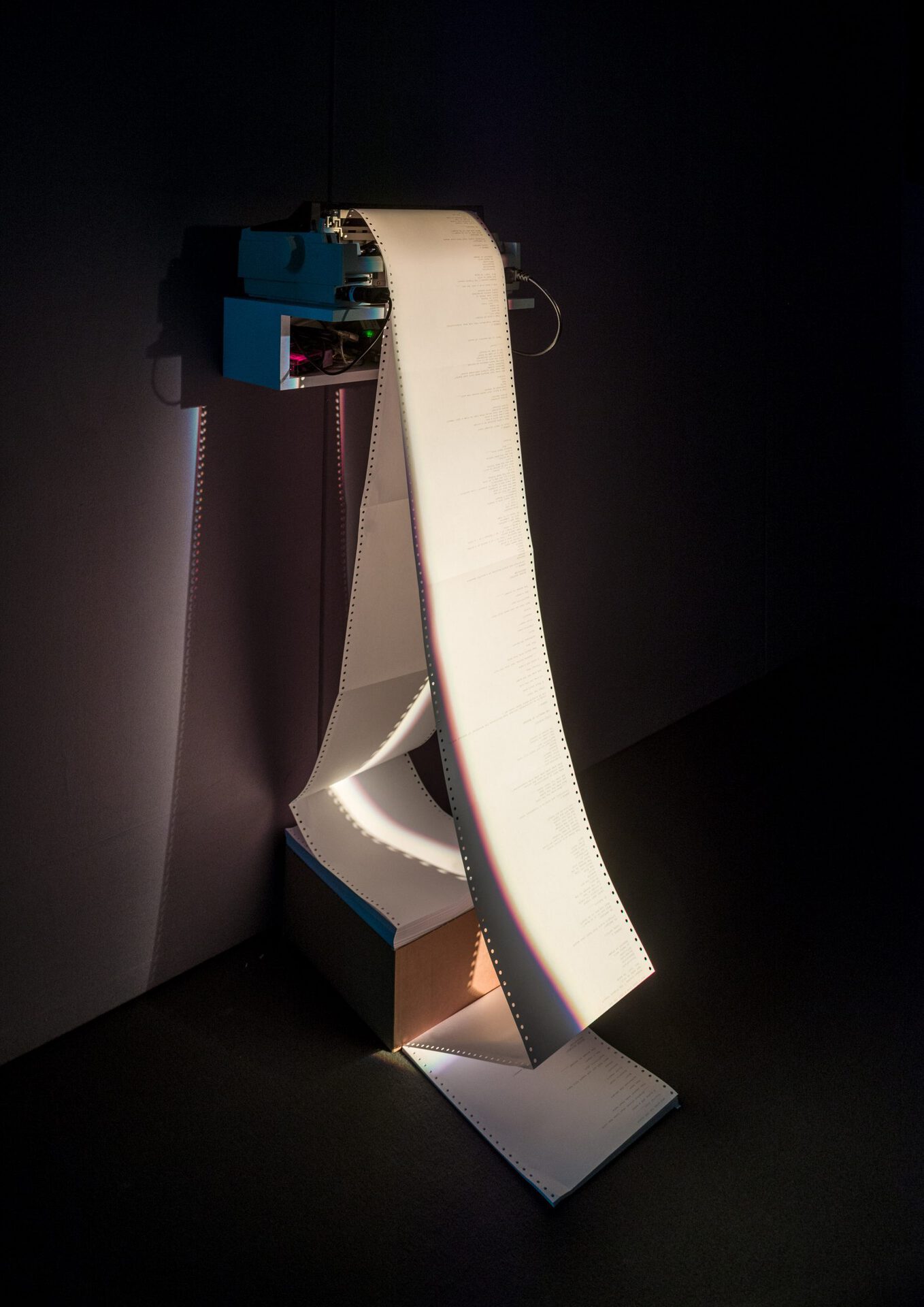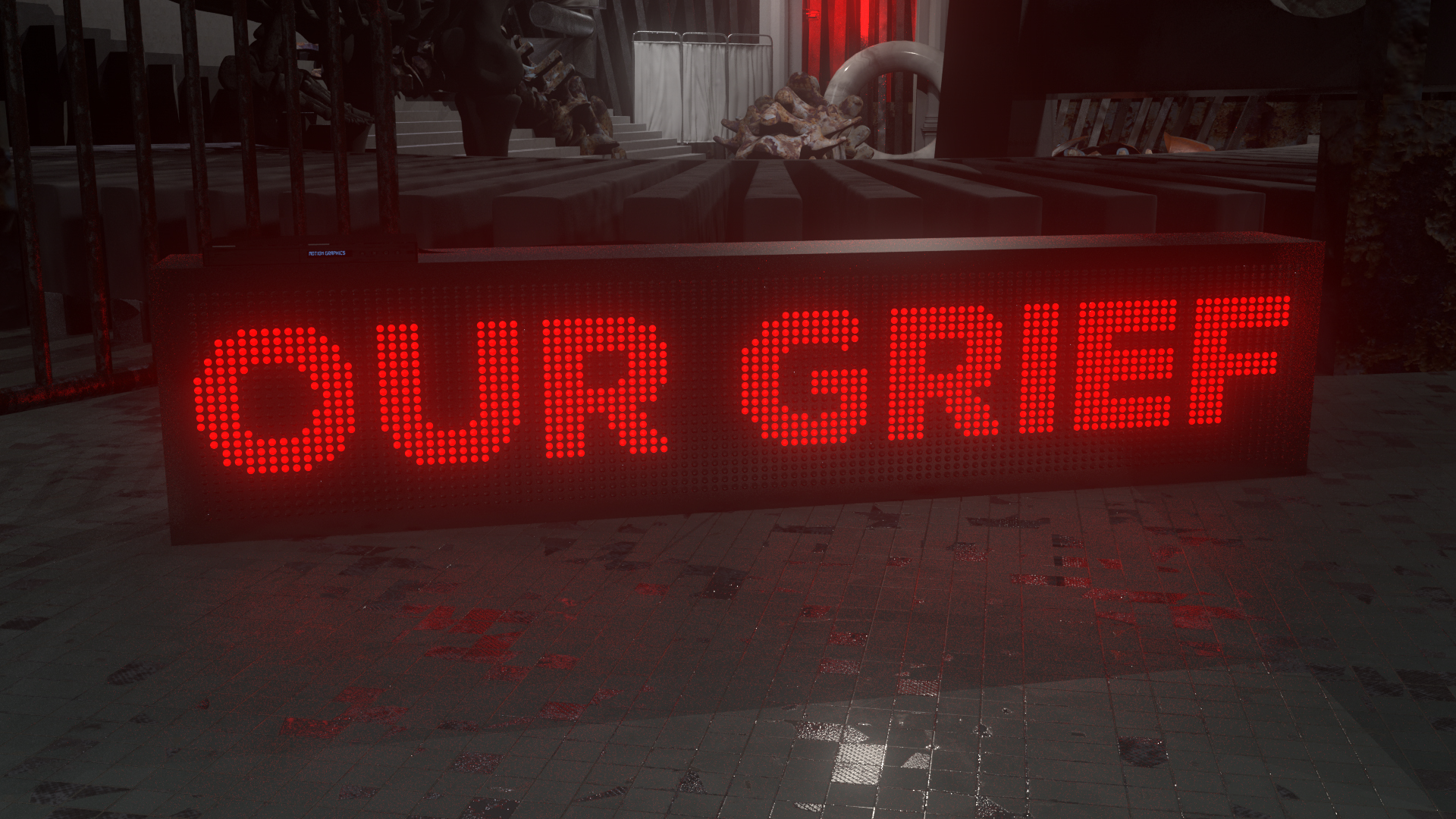 Nicht nur inhaltlich verhandelt Hamadehs Arbeit das Motiv des Bruchs, sondern integriert diesen auch in die eigene Form. Klaustrophobische 3D-Szenen wechseln und überschneiden sich mit der kruden 2D-Animation eines Computerspiels und werden mehrfach von dem theatralen Rezitieren des Texts, der zeitgleich live im Ausstellungsraum von einer beleuchteten Maschine gedruckt wird, unterbrochen. Hamadeh brilliert hier im Spiel mit Immersion und Distanz, mit der Verunsicherung von Grenzen: denen des Werkes, aber auch denen der Rezipient:innen. So zerschlägt die Arbeit mit dem zwischenzeitlichen Aussetzen des Videos bewusst den Sog der Projektion und lässt dagegen die Realität der Rezipient:innen einbrechen: Wenn plötzlich ein lautes Schellen erklingt, erscheint es im ersten Moment unklar, ob es nun „fiktiv“ ist oder sich in diesem Moment im Ausstellungsraum tatsächlich eine Katastrophe anbahnt. Das schlagartige Umschalten der Rezeptionsmodi, das Zurückgeworfen-Werden auf sich selbst und den Raum, der einen umgibt, trifft ins Mark. Immer wieder tut sich in Hamadehs Arbeit buchstäblich und im übertragenen Sinne der Boden auf und einmal mehr wird deutlich: Wir alle stehen auf brüchigem Grund, also: „Run, baby, run!“
