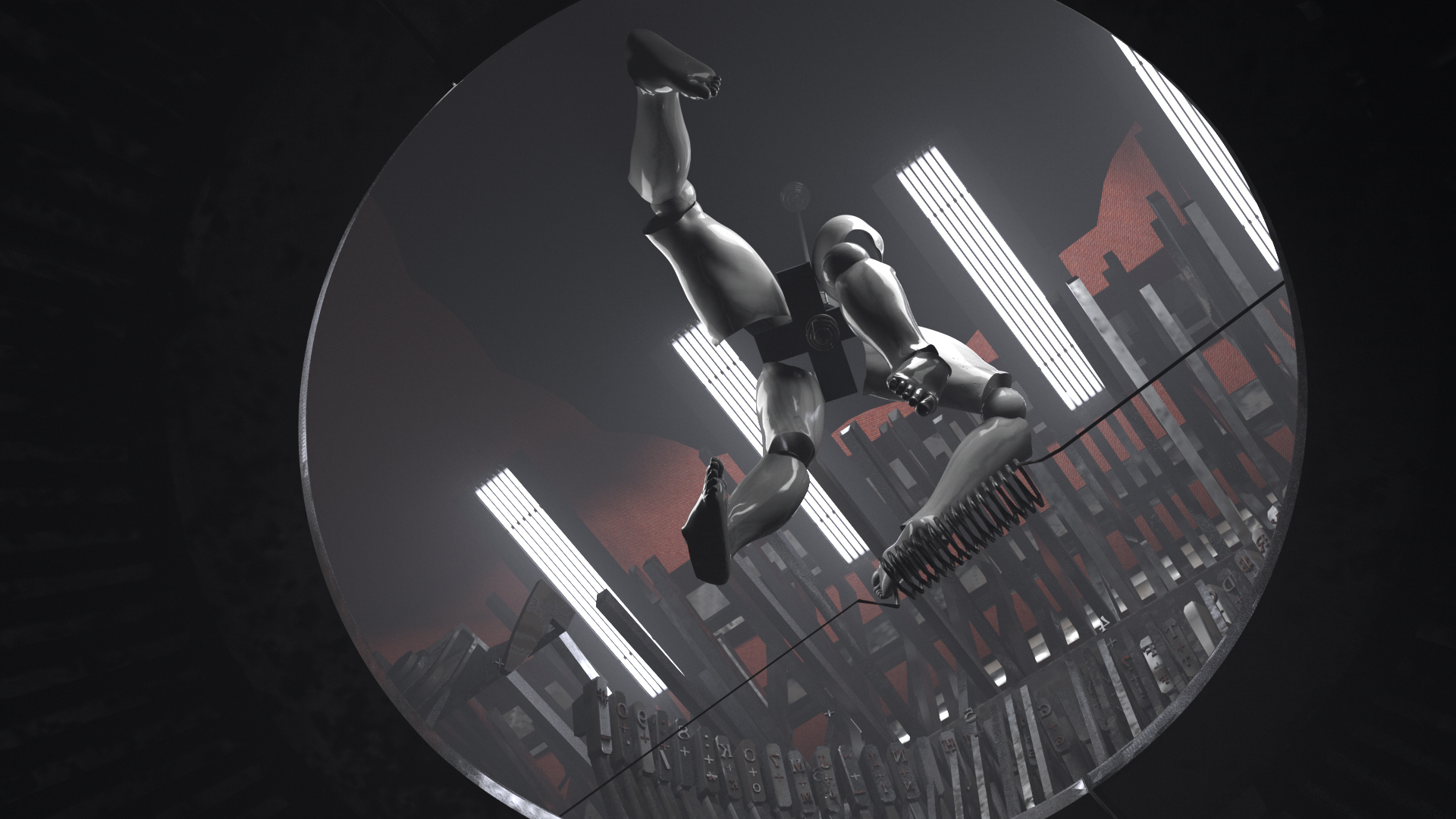 „Run, baby, run“ ruft eine keuchende Stimme, begleitet von katastrophischen Szenen, kollabierender Architektur, schallendem Alarm: ERROR, ERROR. Und immer wieder das Motiv des Rennens, des Kreisens, der Flucht: Avatare, die von Level zu Level durch eine pixelige Computerspiel-Welt hetzen oder eine animierte Armee von Skeletten, die in einer kultisch anmutenden Zeremonie im Kreis marschiert. Dabei schwillt das Geschehen akustisch wie visuell an und ab, verdichtet sich, wird laut, schnell, eng, bis der Druck kaum mehr auszuhalten ist. „Run, baby, run“: Aber wohin denn, wohin?