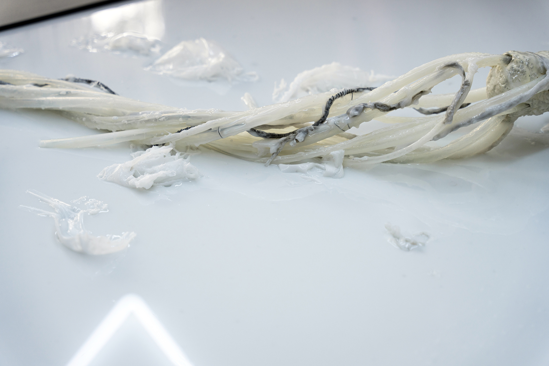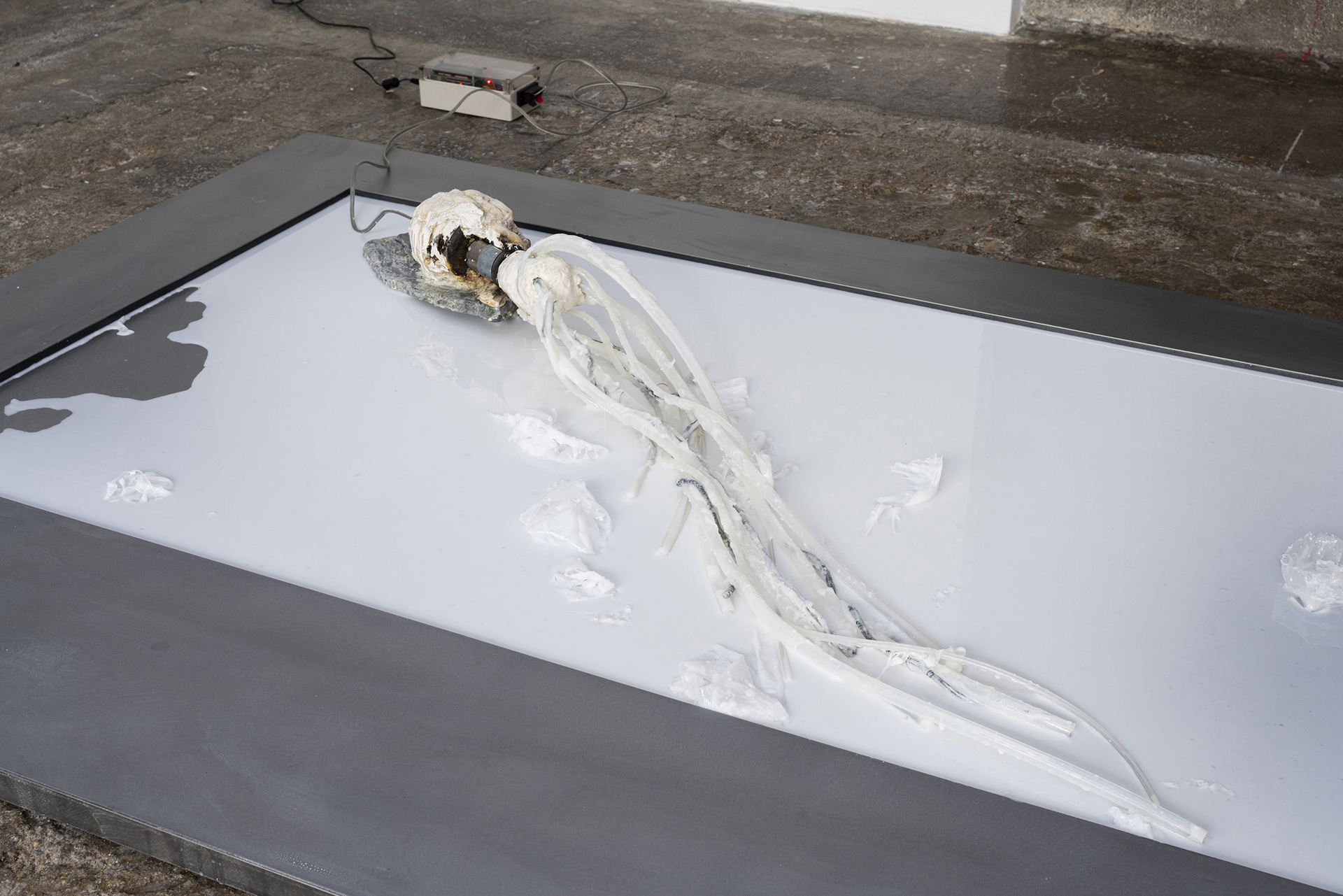 From nascent stages Mire Lee has tested the limits of materials and mechanization, developing an alternative medium that escapes the standards of traditional sculpture. Her practice enters a realm in which the repetition of actions performed by machines paradoxically refuses to generate the same results, reflecting the artist’s conflicted domination-submission relationship with her materials which include PVC hoses, silicone, lubricants, grease and steel rods. Often employing minimal technologies such as electric motors and pumps, her hypnotic creations manifest in a deluge of constricted, mesmerizing convulsions packed with dread and anticipation. Viscous, impulsive and violent, Lee’s apparatuses simulate raw and unruly effects, triggering responses that delude the barriers between nausea and arousal.