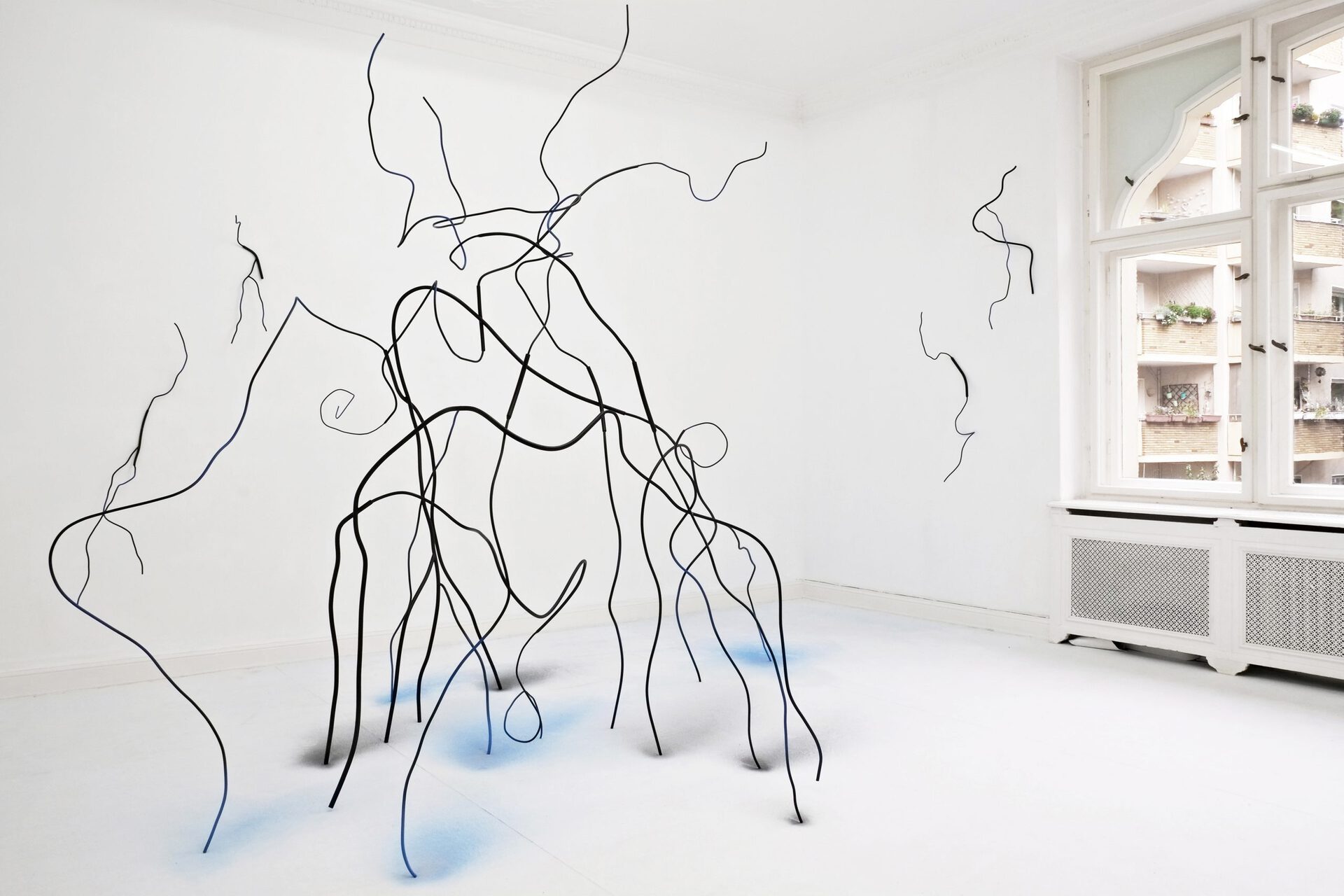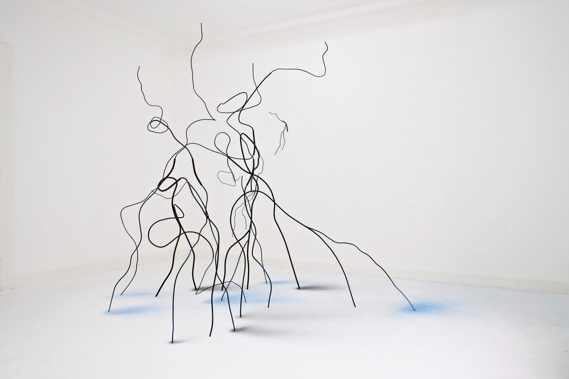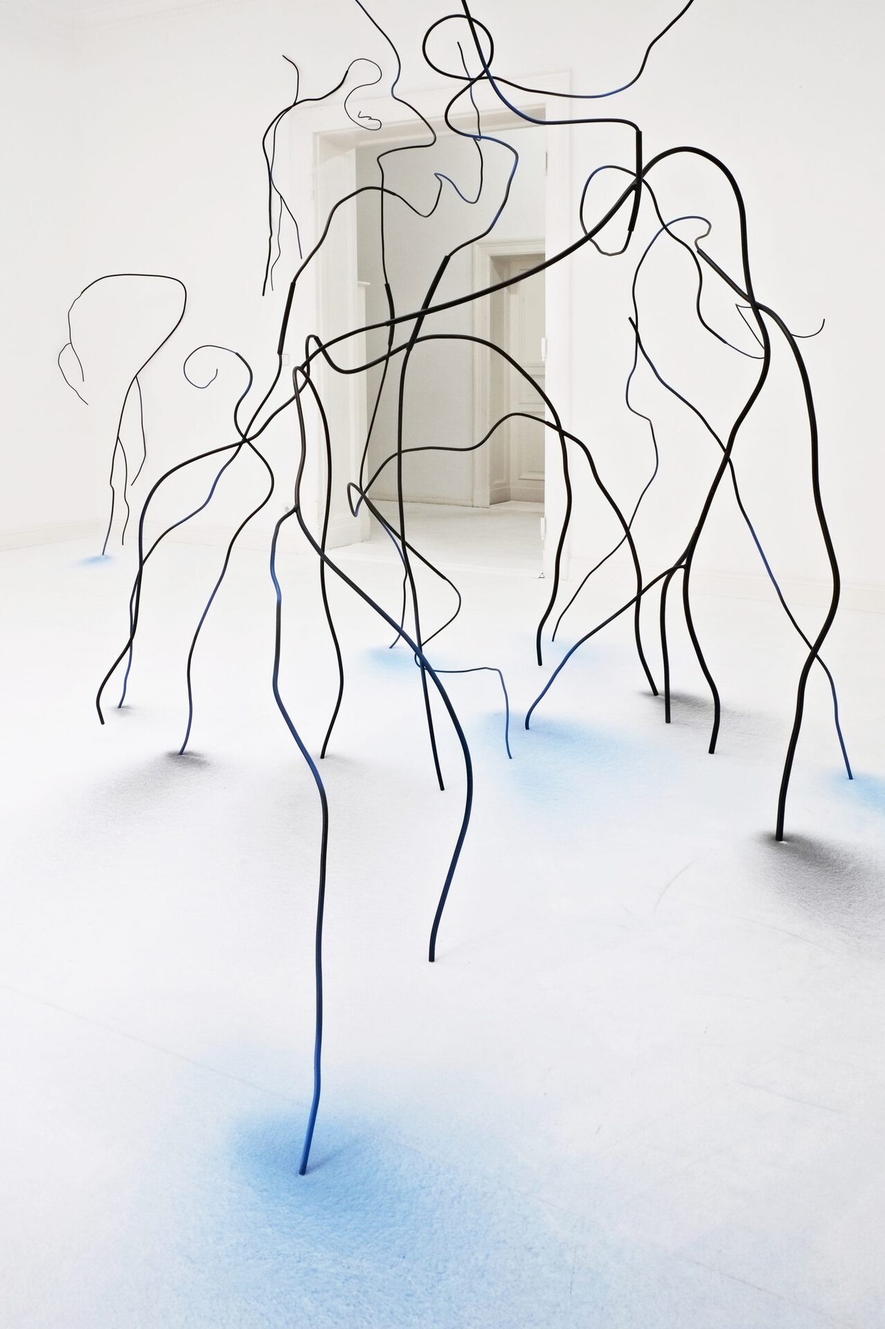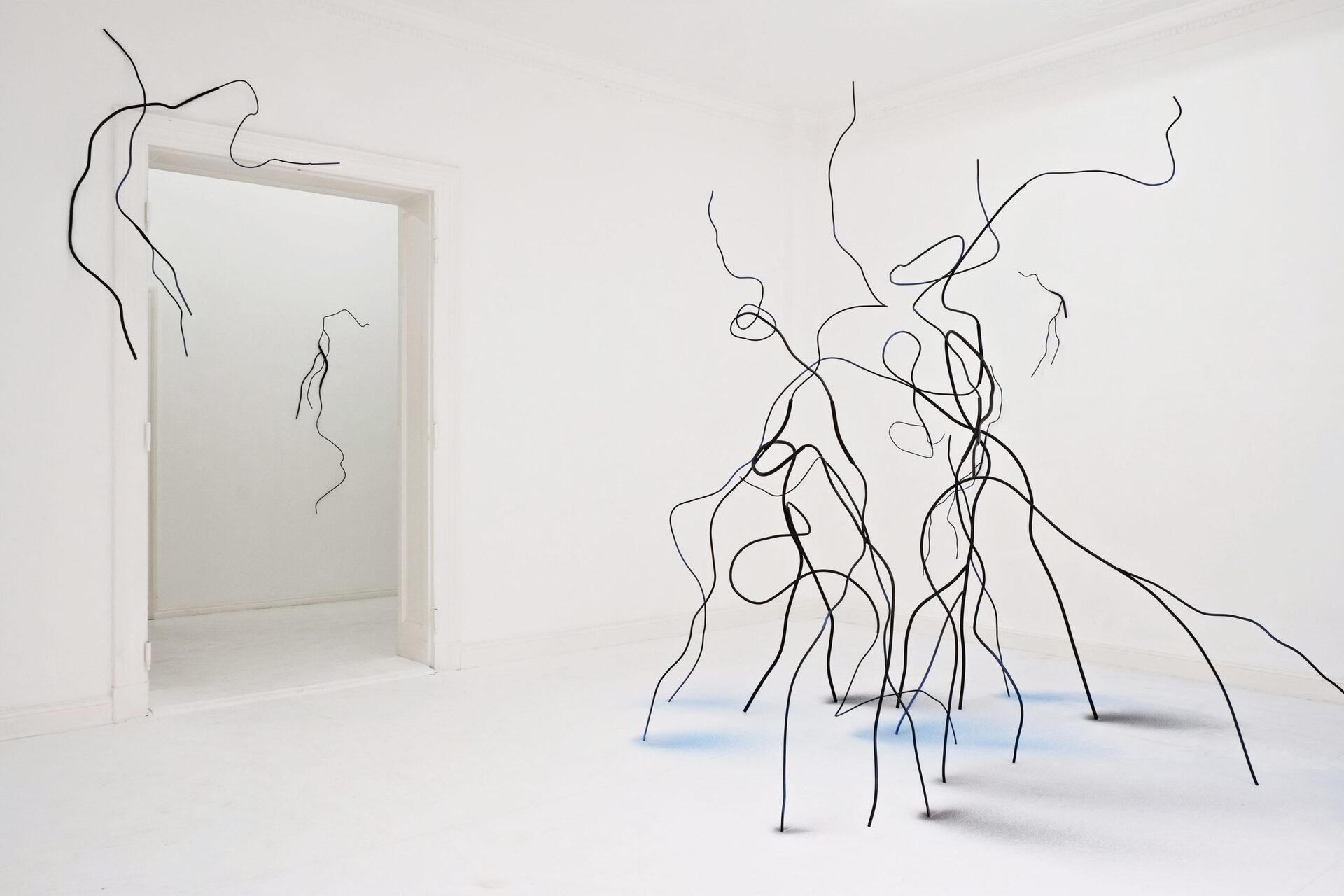 And then suddenly there are these strange metal structures. Filigree lightning rods, bending—perhaps already a little melted under the load of the electromagnetic mass. They waft gently through the room like marsh plants under water. They zap through the air like scintillation made visible. They are there and yet intangible.
