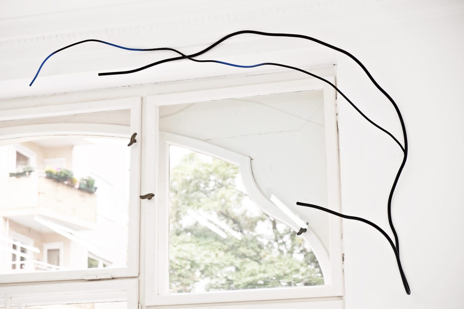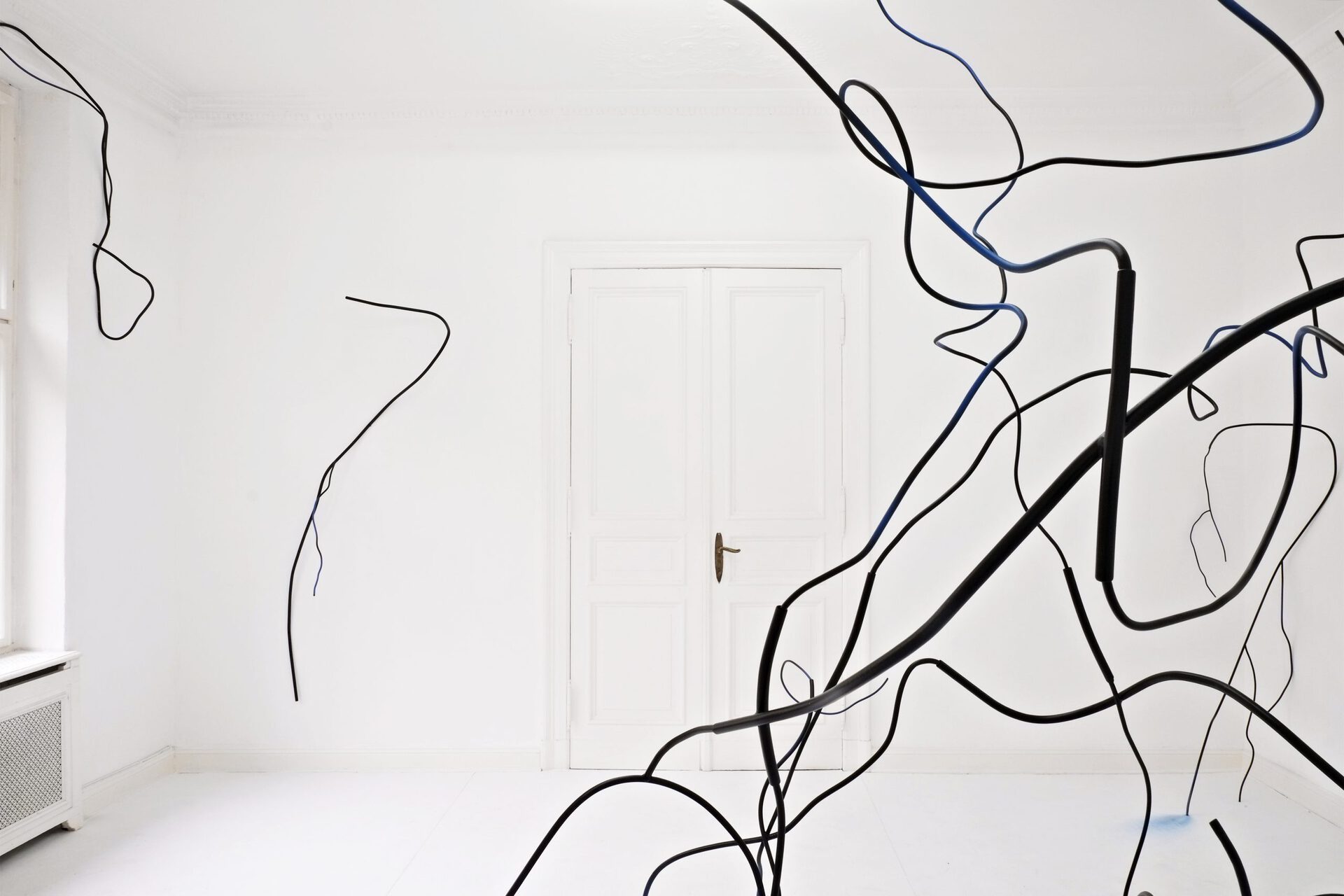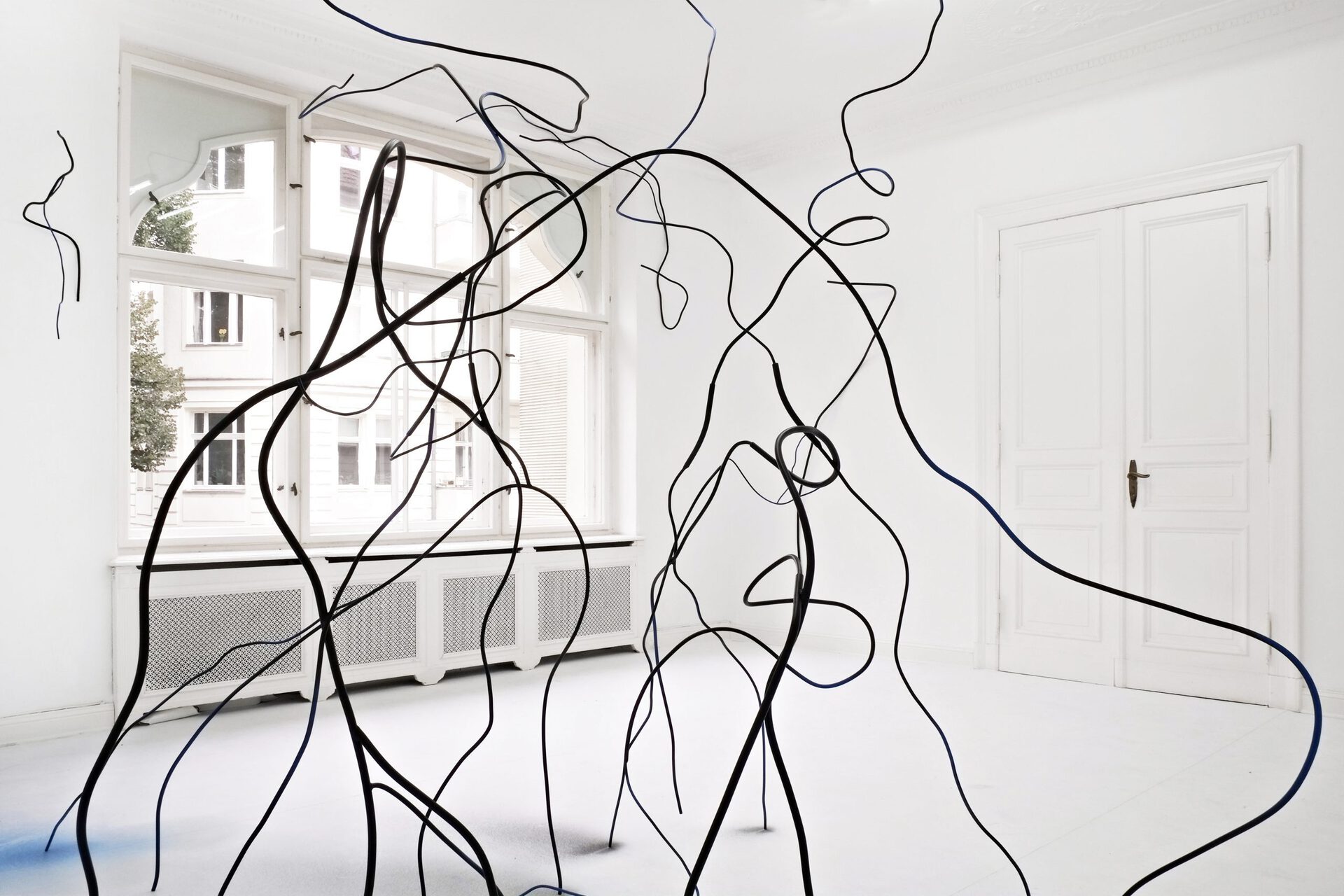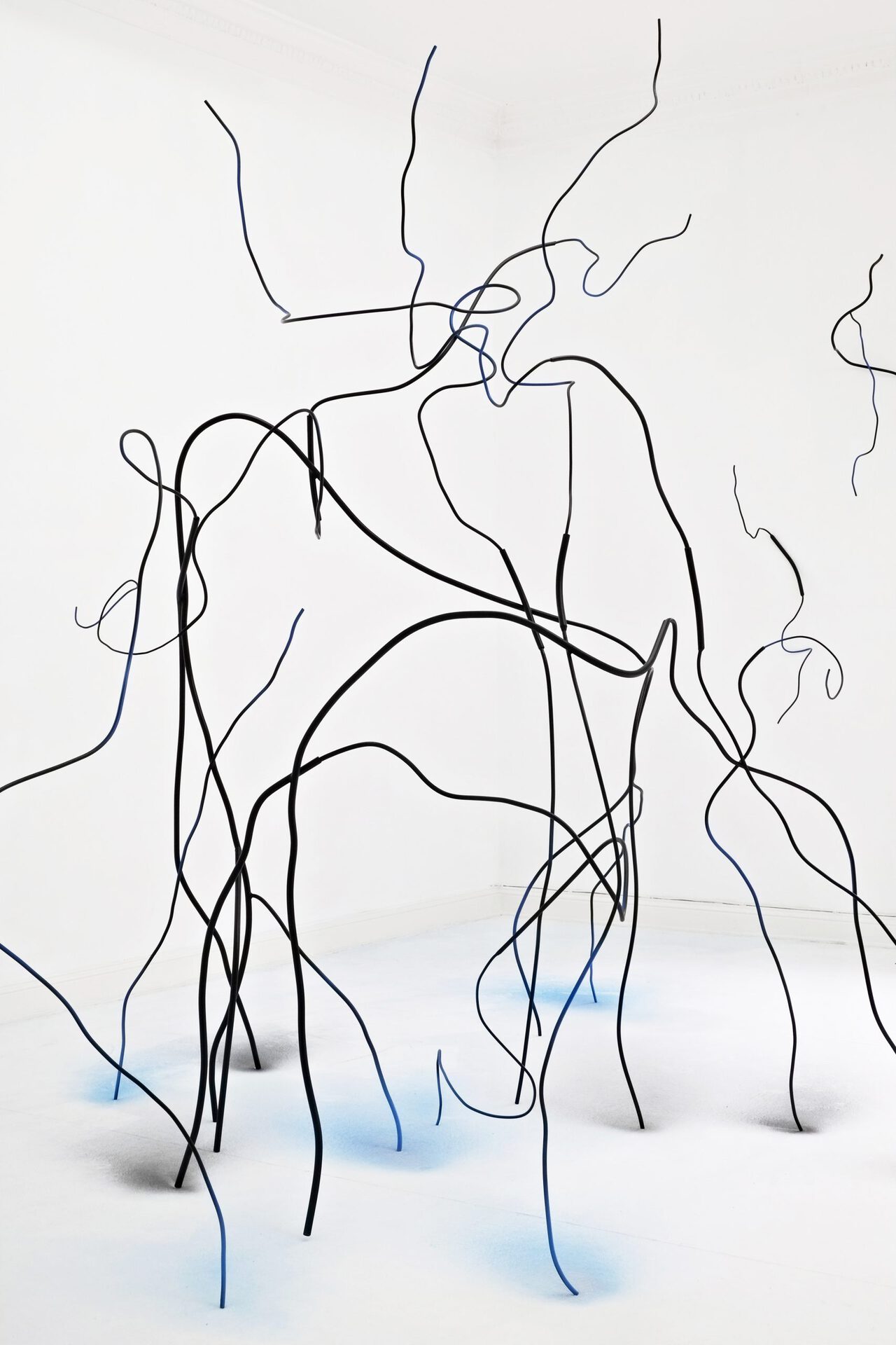 And then suddenly there are these strange metal structures. Filigree lightning rods, bending—perhaps already a little melted under the load of the electromagnetic mass. They waft gently through the room like marsh plants under water. They zap through the air like scintillation made visible. They are there and yet intangible.