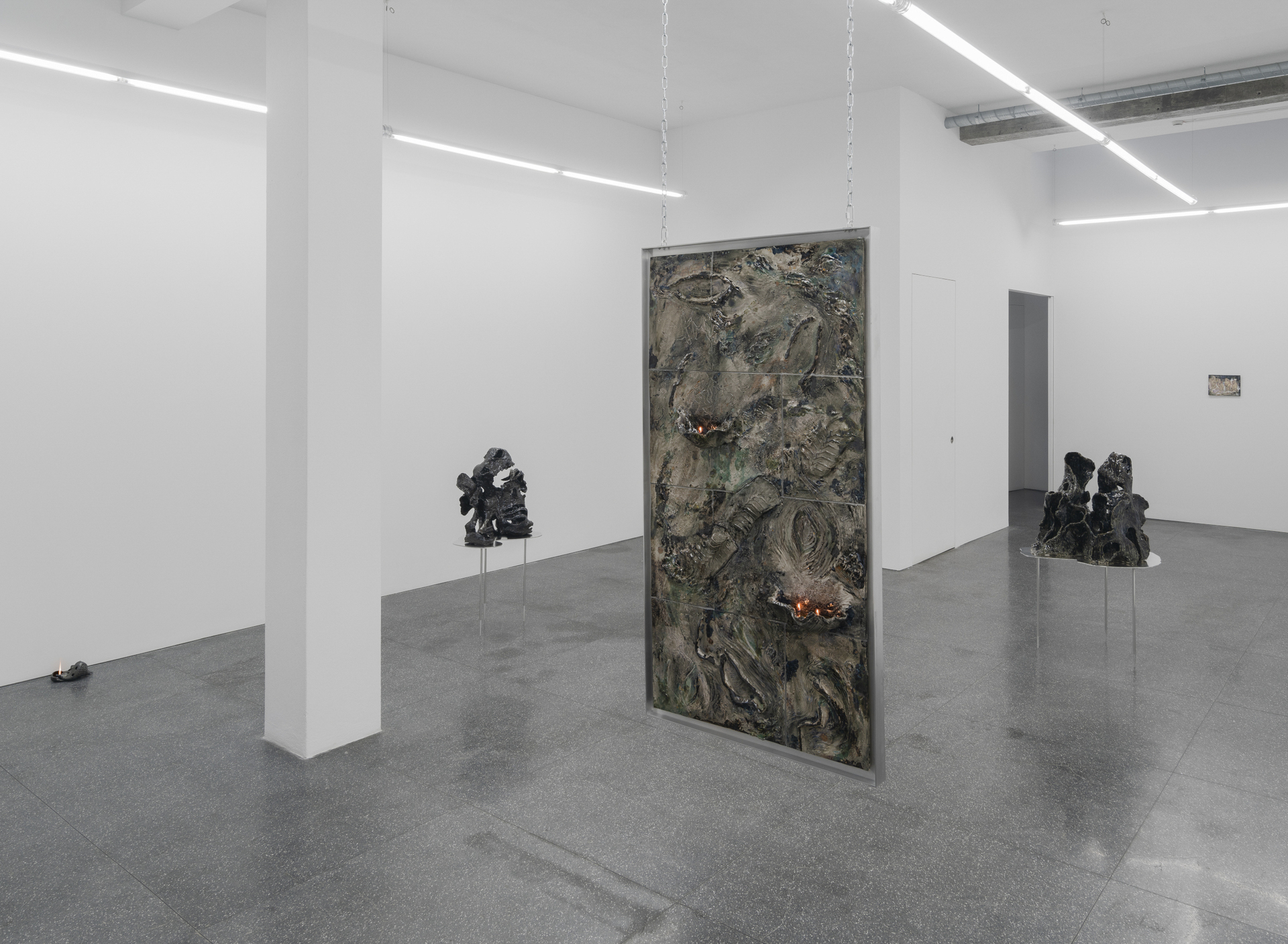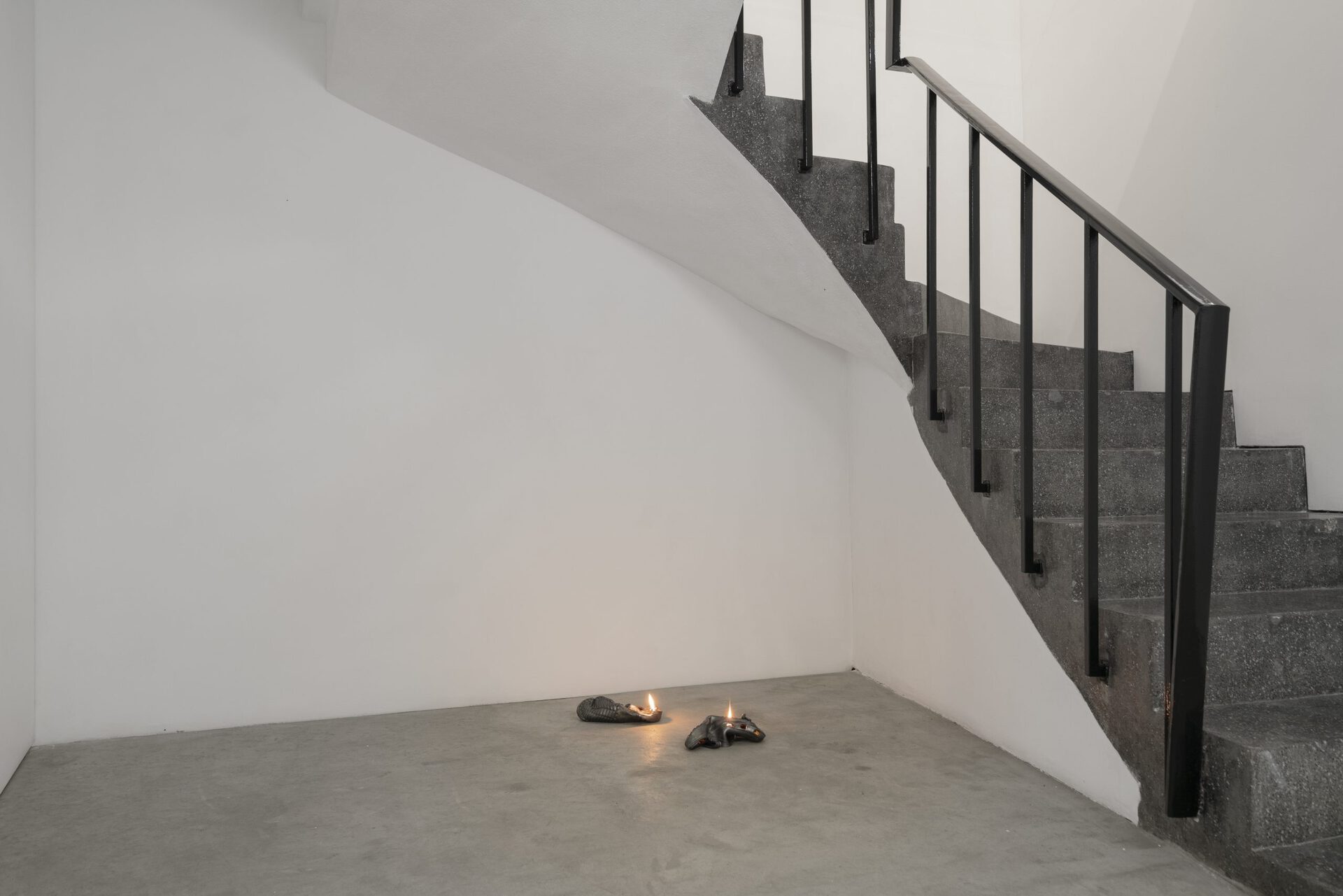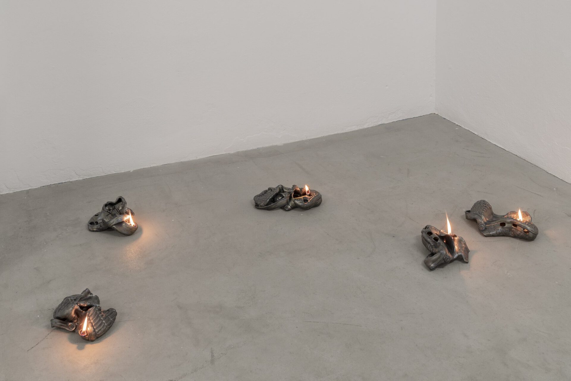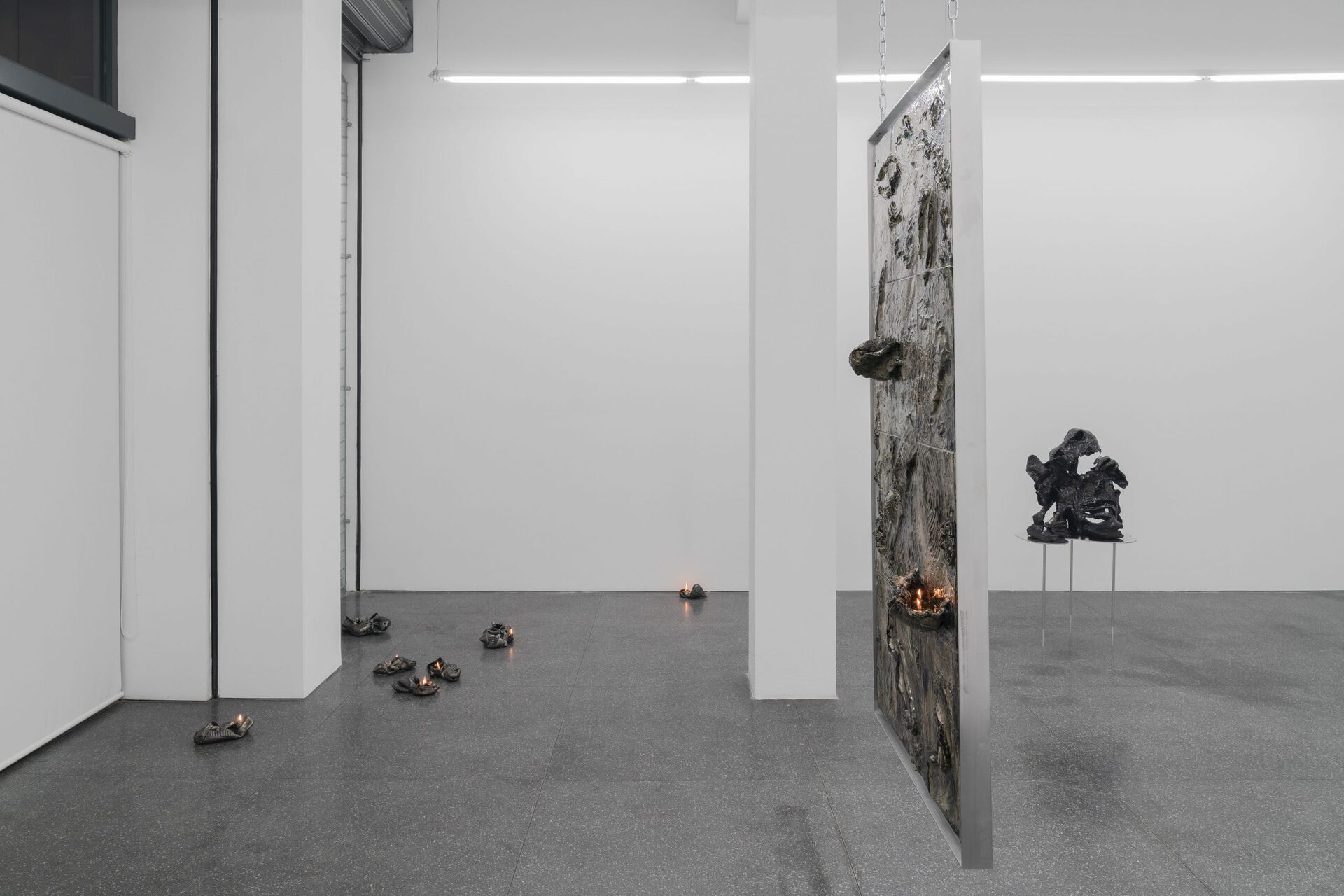 Burned against the rear fender, Monika Grabuschnigg’s first solo show in Portugal, continues her investigations into bodily and cerebral desire; into the ravaging force of fire and intensifying heat across the planet; into what the inexorable melding of cognition and code means for what it is to be conscious.