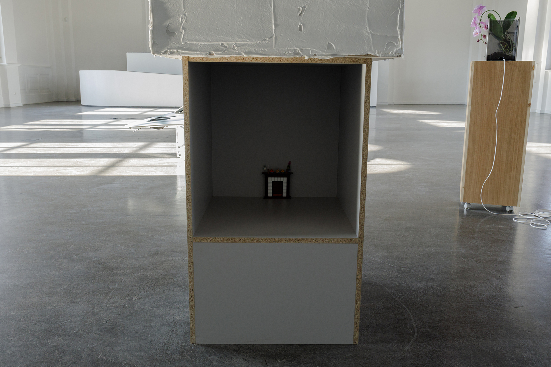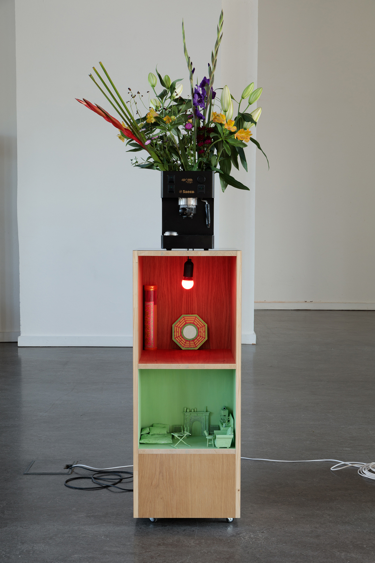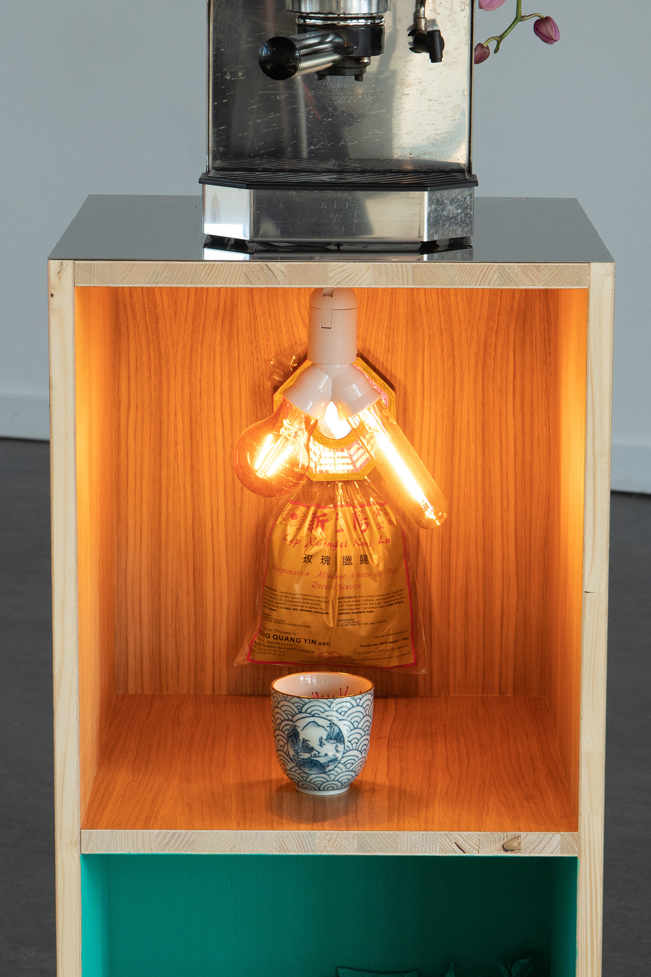 The exhibition deals with the paradoxes, hovering around the spheres of consumer goods, desire for individuality, and projected role models. Her drawing on Vietnamese Buddhism directs attention towards the seemingly insurmountable gap, laying between the belief in the accumulation of goods and the understanding of life as a condition leading from birth to death. The exhibition consists of two groups of sculptures and a video, working with a seemingly private everyday aesthetic of trivial self-stylization.Text
