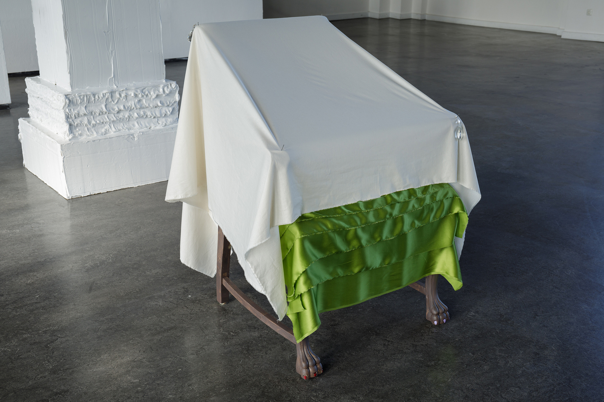 new groups of sculptures. The empire-style furniture wrapped in banana leaves and sheets