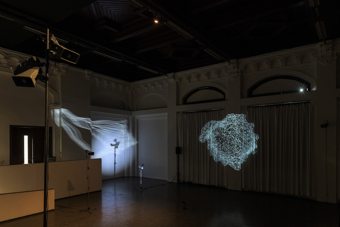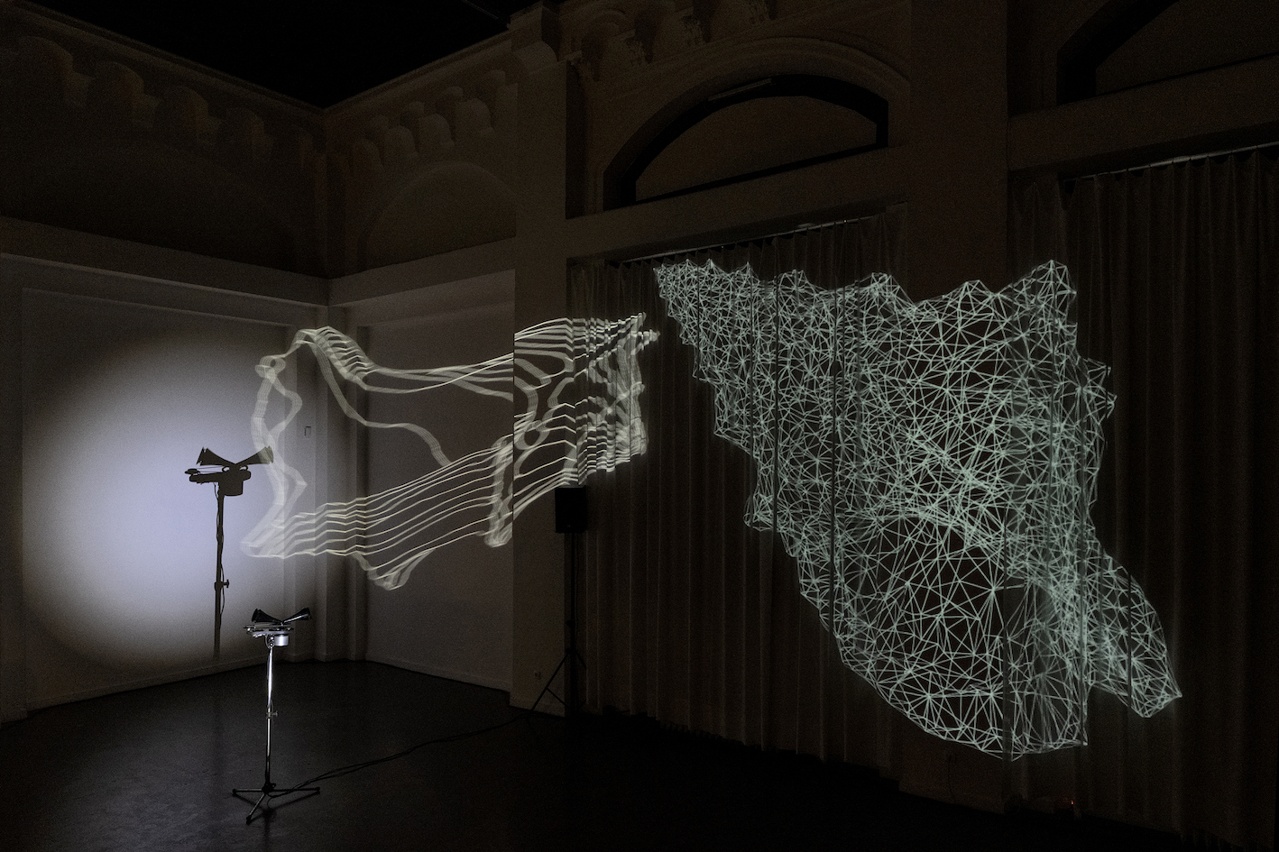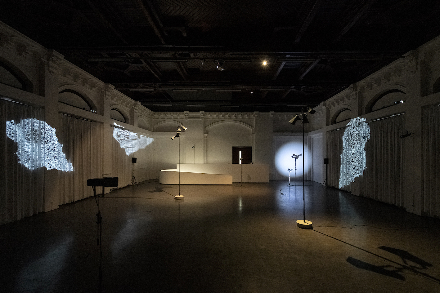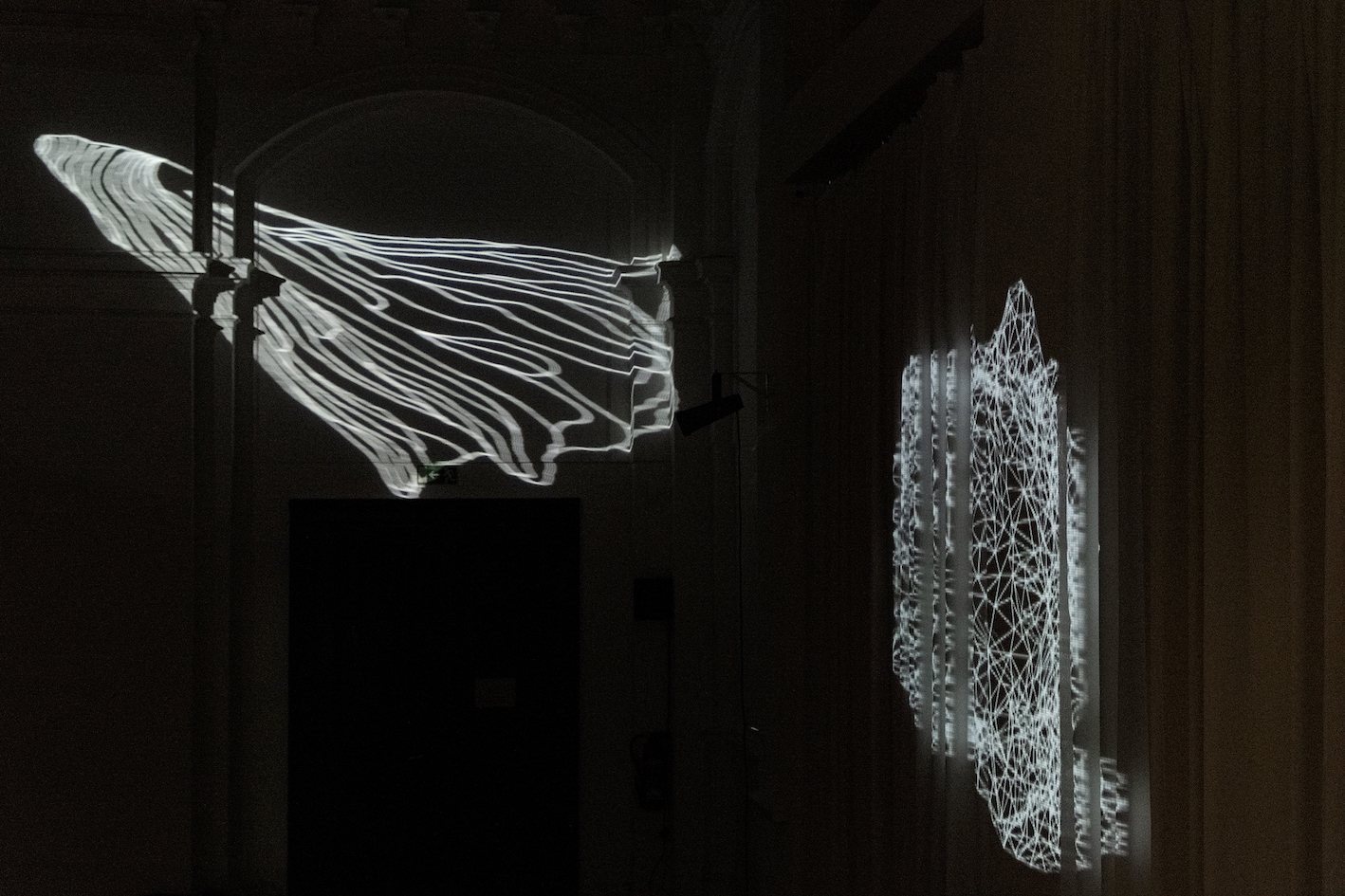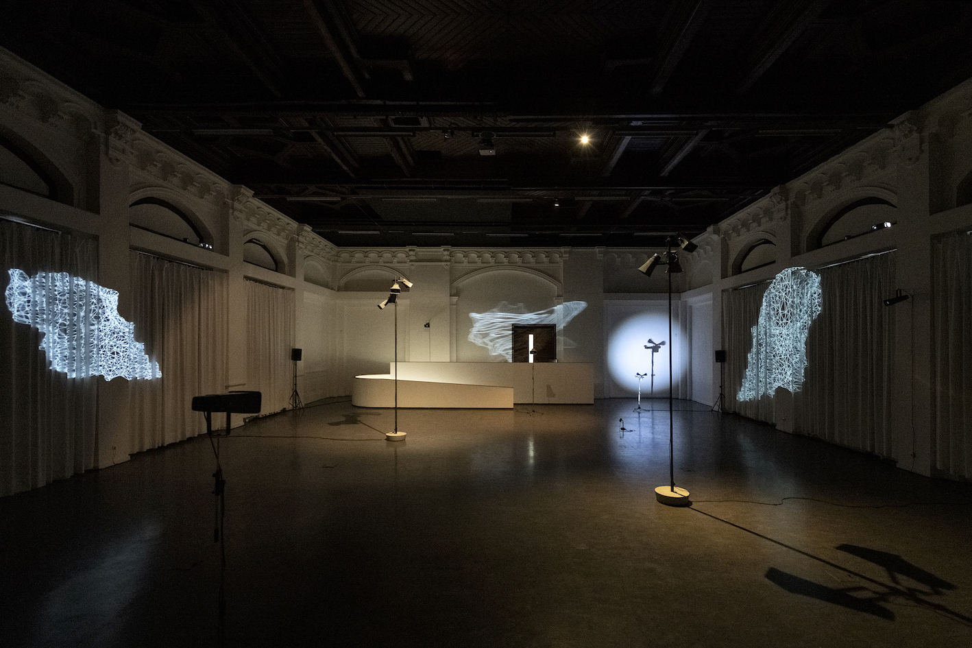 The projection of a shell drawing traces the concrete space of the waiting room while at the same