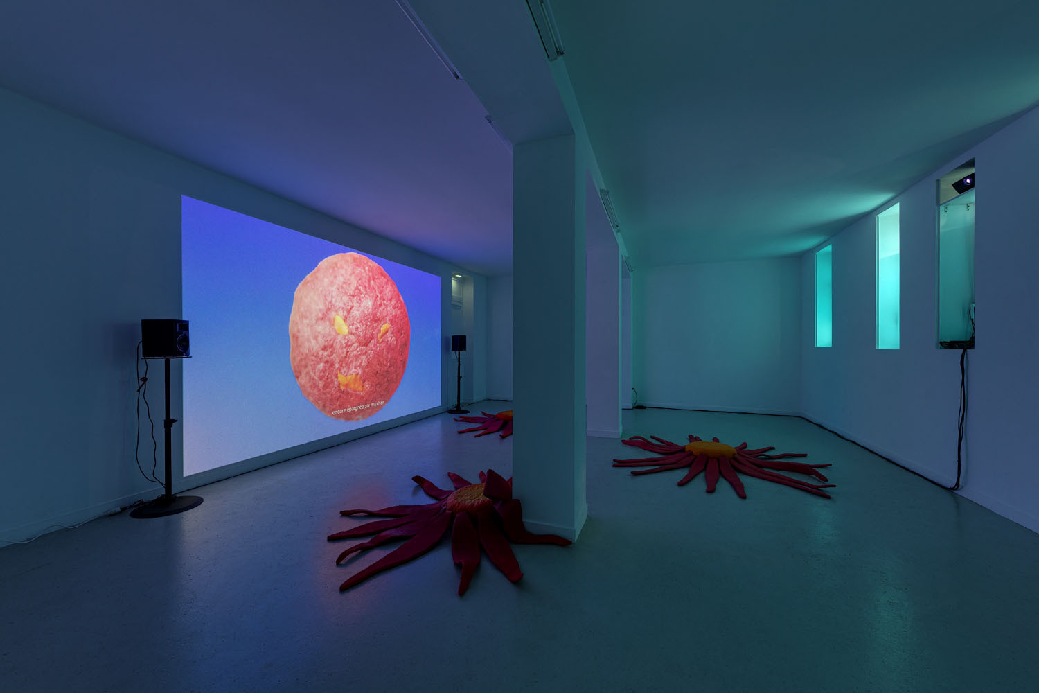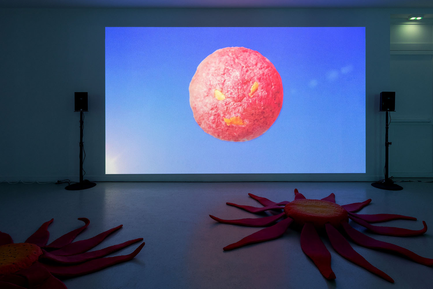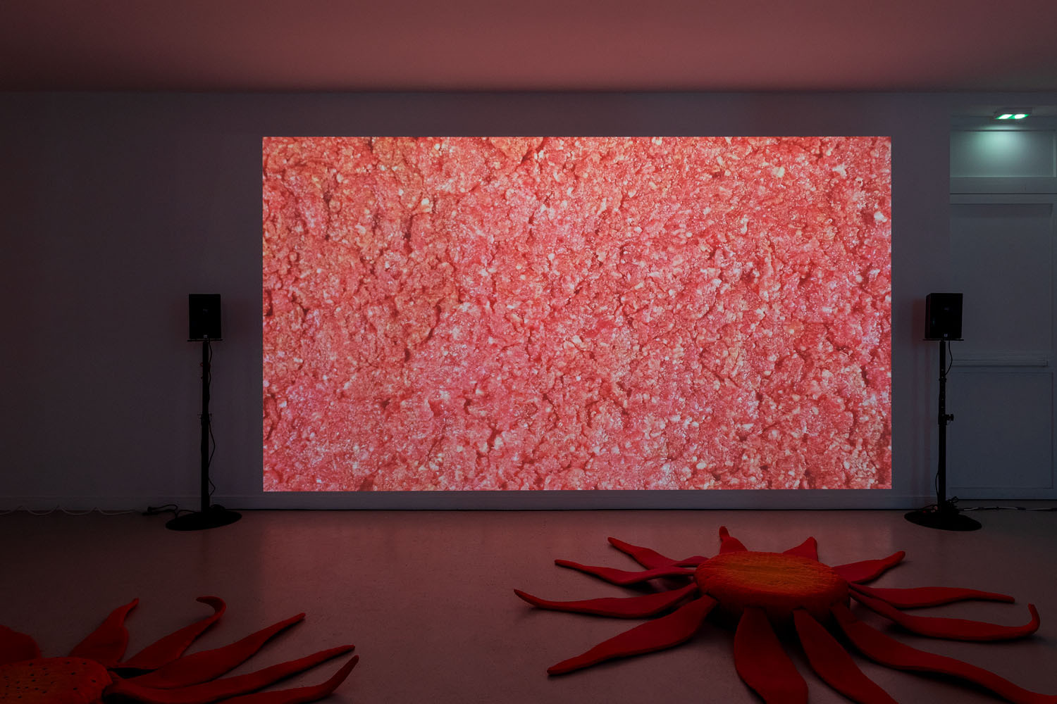 Its effigy, the open mouth, characterizes Agony, who is prey to a silent scream in the film SUGAR FREE, the first three chapters of which are being screened at Les Bains-Douches. This odyssey shows the ecological devastation inflicted on planet earth that is caused by a kind of engulfing blob, HD Steak, born of genetic manipulations originating in synthetic meat. Beneath the regular stripes of industrial post-animal meat, the character Agony takes shape : a donut with an anthropomorphic shape saved from the disasters of a meat deluge thanks to their plastic packaging, which proves especially resistant. HD Steak is the seminal character in this 2D animated story and since 2013 has reccured in the artist’s work, but today it is ceding that position to another entity, Agony. This newcomer springs from crayon drawings that have been extended to include sculptures in a range of sizes that are made from matress foam, covered with natural latex. Then, they are manipulated in front of a greenscreen and animated on computor. In their design and realization, the films are long-term projects, reflecting the time Malgat has spent experimenting in the studio and living with these objects, whose uses transcend their mere display in the usual white cube space.