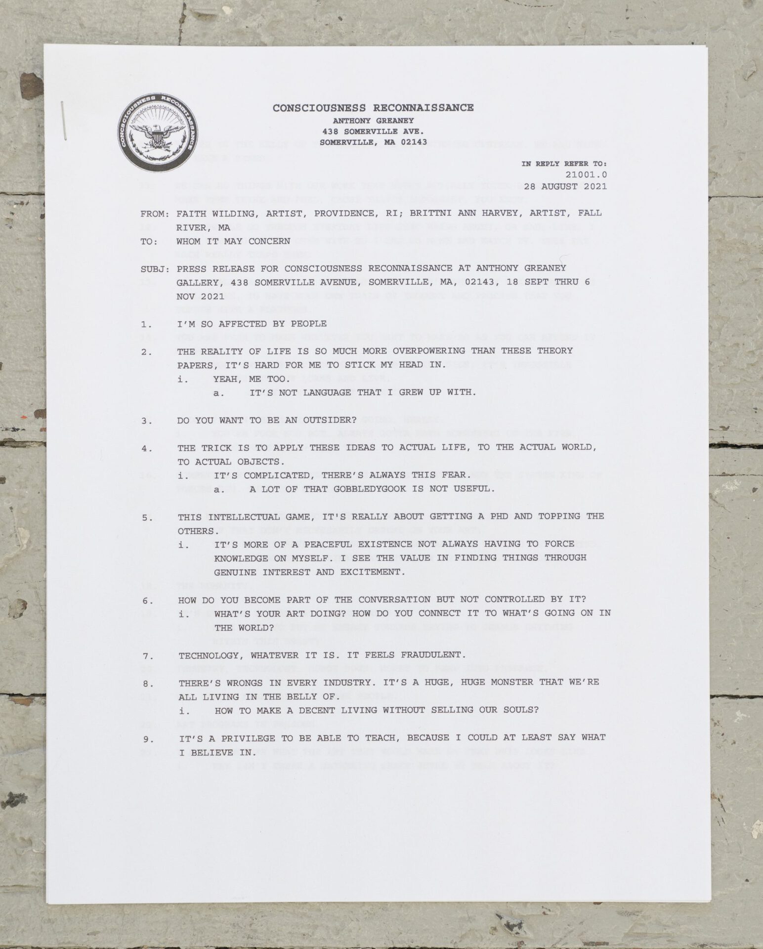 Brittni Ann Harvey "Consciousness Reconnaissance" with an accompoanying text by Faith Wilding at Anthony Greaney Somerville, MA. USA Through November 6Text