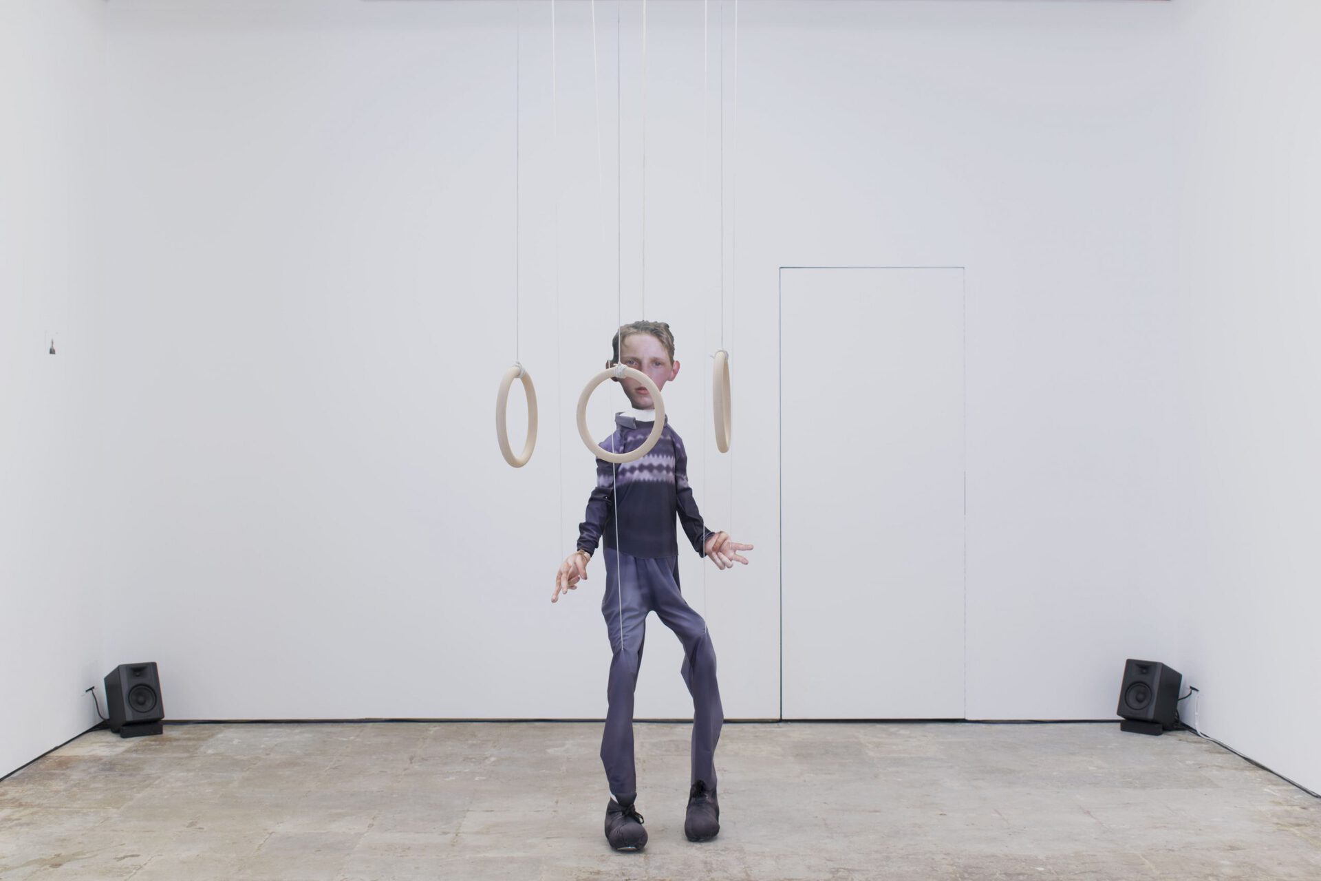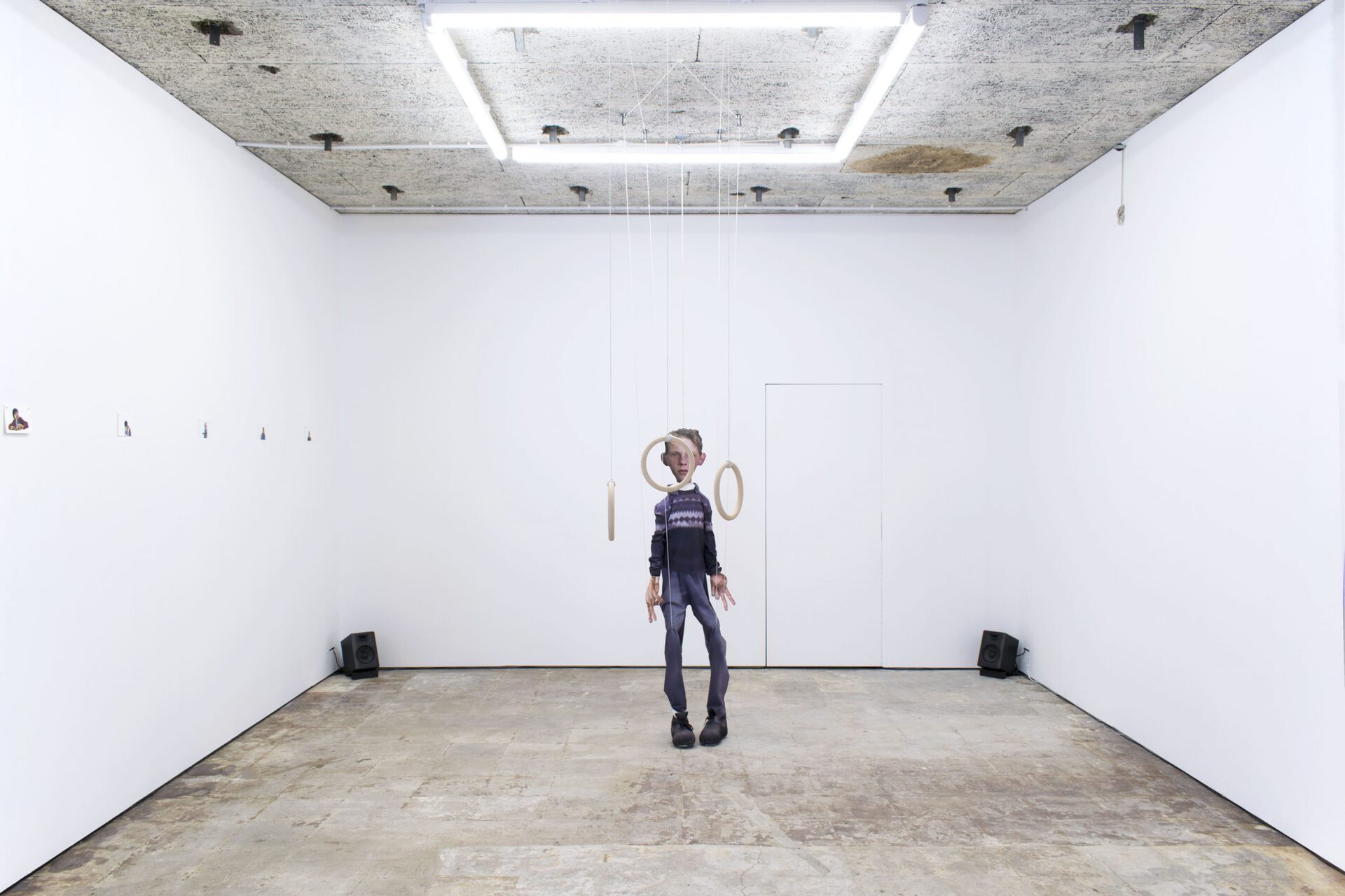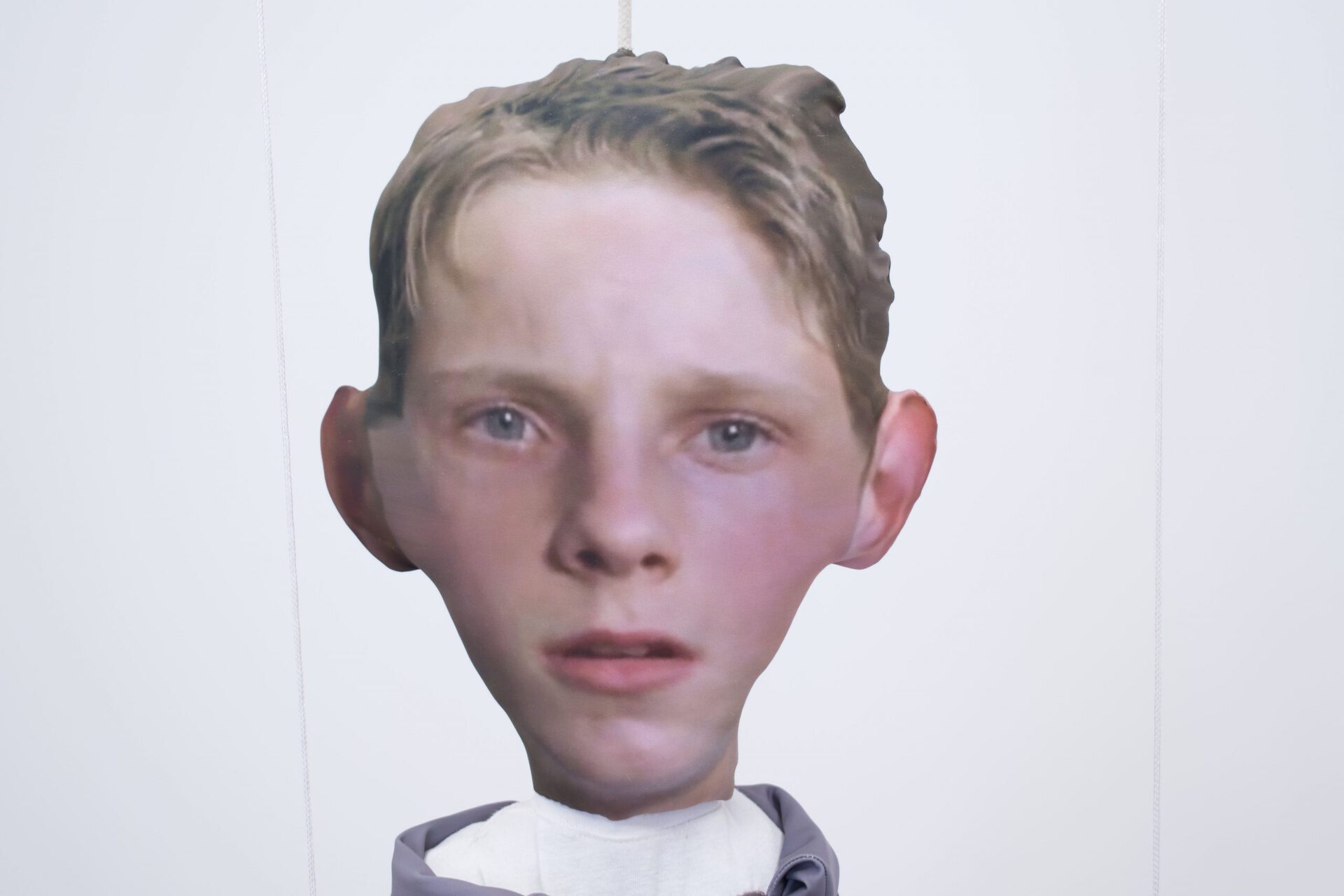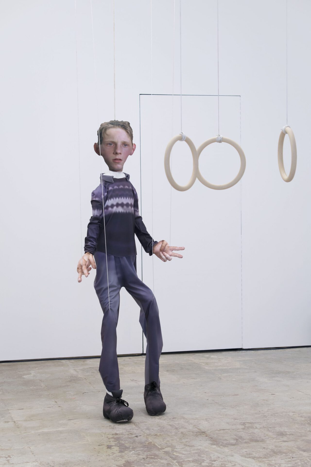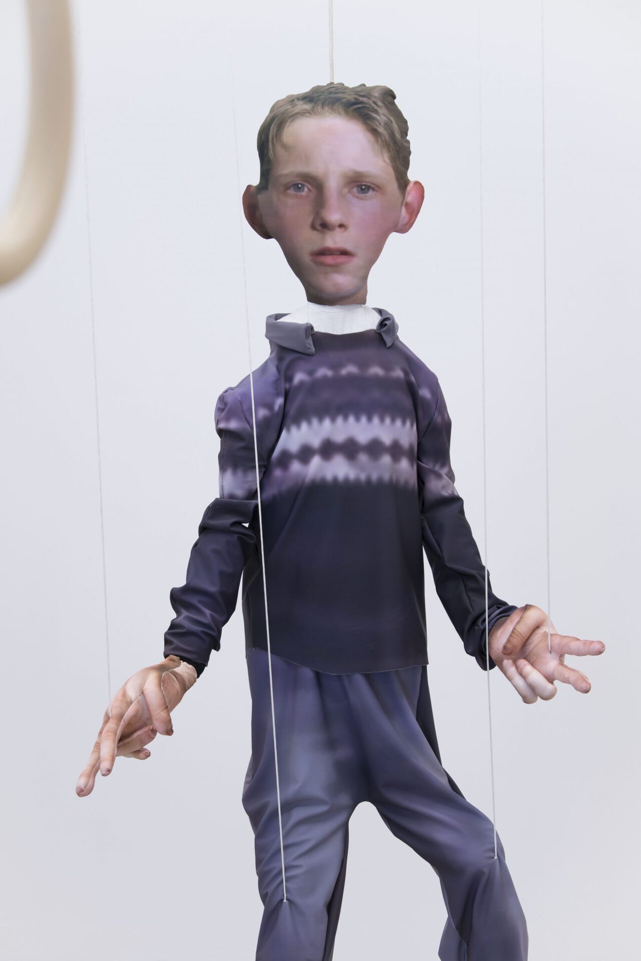 In the centre of the space is Billy (2022) a lifesize puppet of young Billy Elliot taken from the eponymous film from 2000. The sculpture is taken from the scene with the aspiring dancer dancing on the roof, clicking his heels together, shoving two fingers up to the world as his brother watches from behind their net curtains. Finding the ultimate escapism through dance.