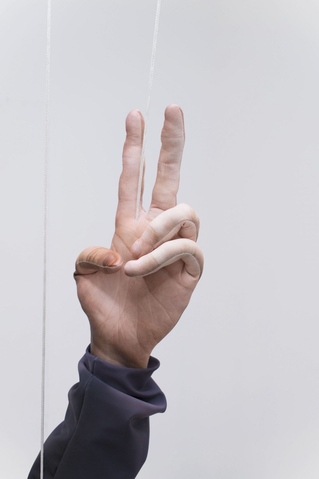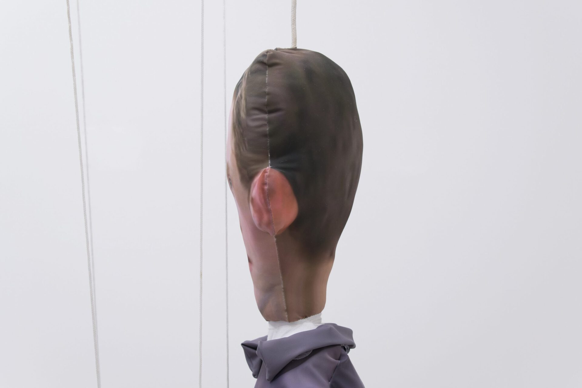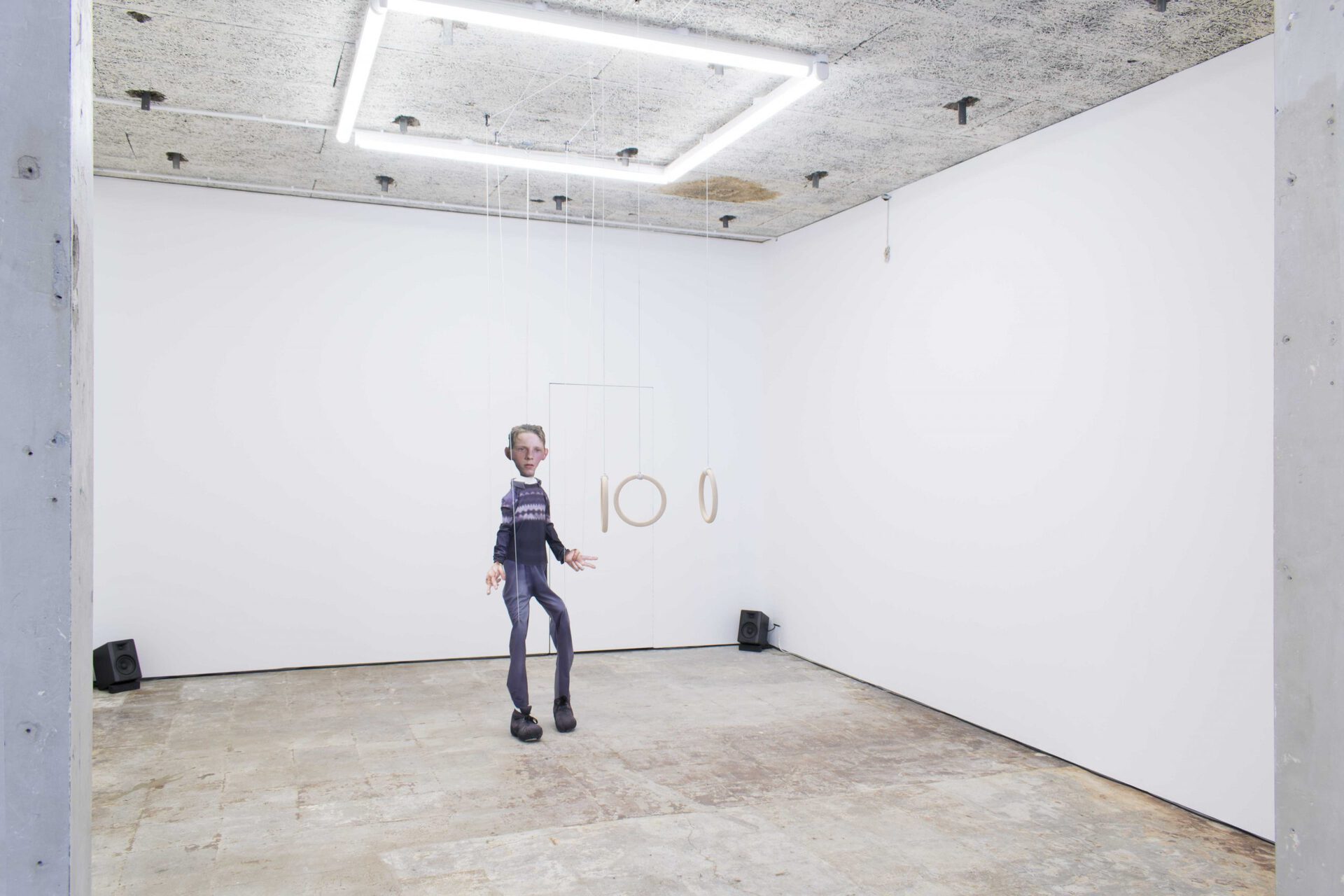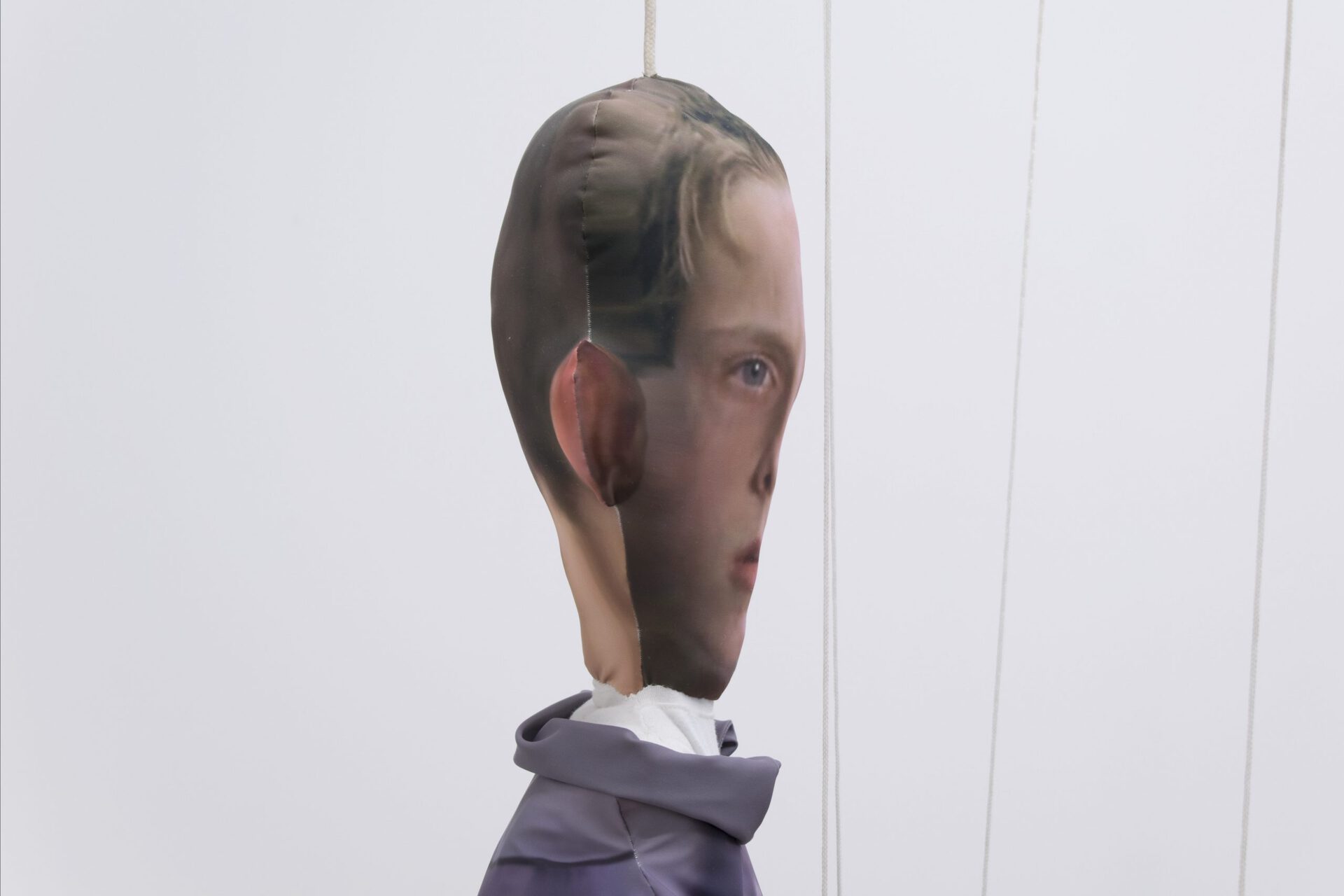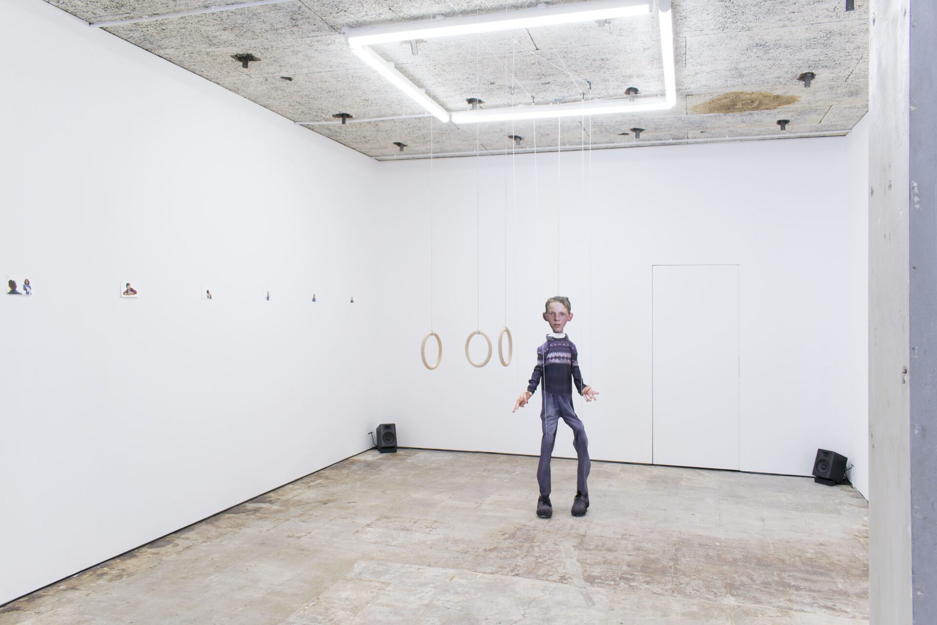 In the centre of the space is Billy (2022) a lifesize puppet of young Billy Elliot taken from the eponymous film from 2000. The sculpture is taken from the scene with the aspiring dancer dancing on the roof, clicking his heels together, shoving two fingers up to the world as his brother watches from behind their net curtains. Finding the ultimate escapism through dance.