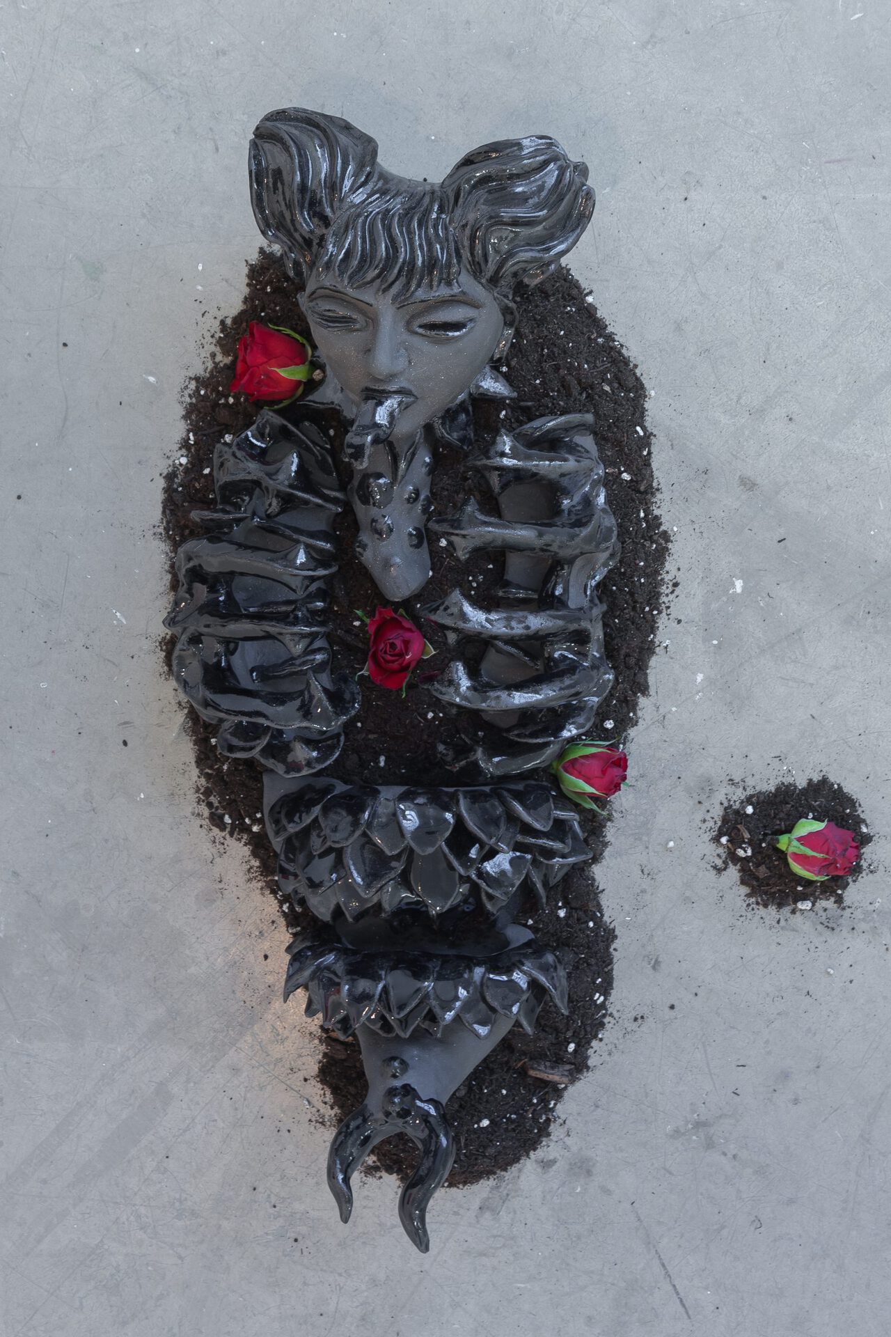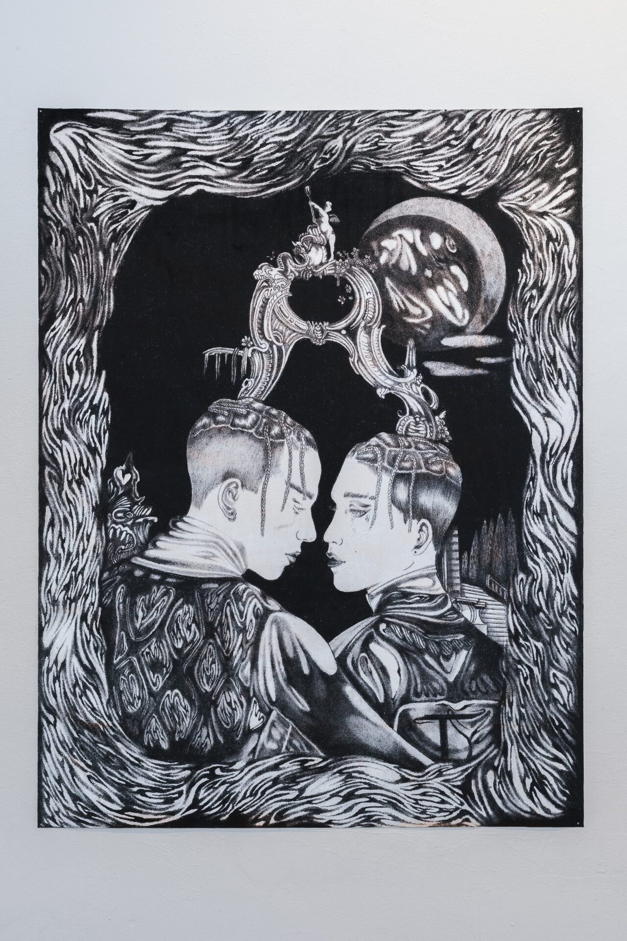 The undead man, who has been succumbed to the seductive powers of a singing enchantress – the daughter of the sea, waits for the divine hermaphrodite in hope, that they/-them will restore his soul. How many years have already passed? The Siren is dead and buried peacefully between roses. Once upon a time, he had made a memetic object for her – a magic mirror, that trades shadows and hearts for material wealth; but she died a poor woman, exposed to an evil spell she couldn’t break. And the mirror? Stolen by a mighty queen; and wasted for vanity and greed. The undead man believes that his story is above the sublime. Therefore, he shall not be found by the brothers.