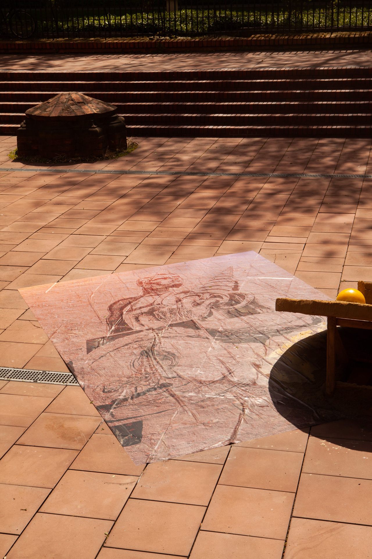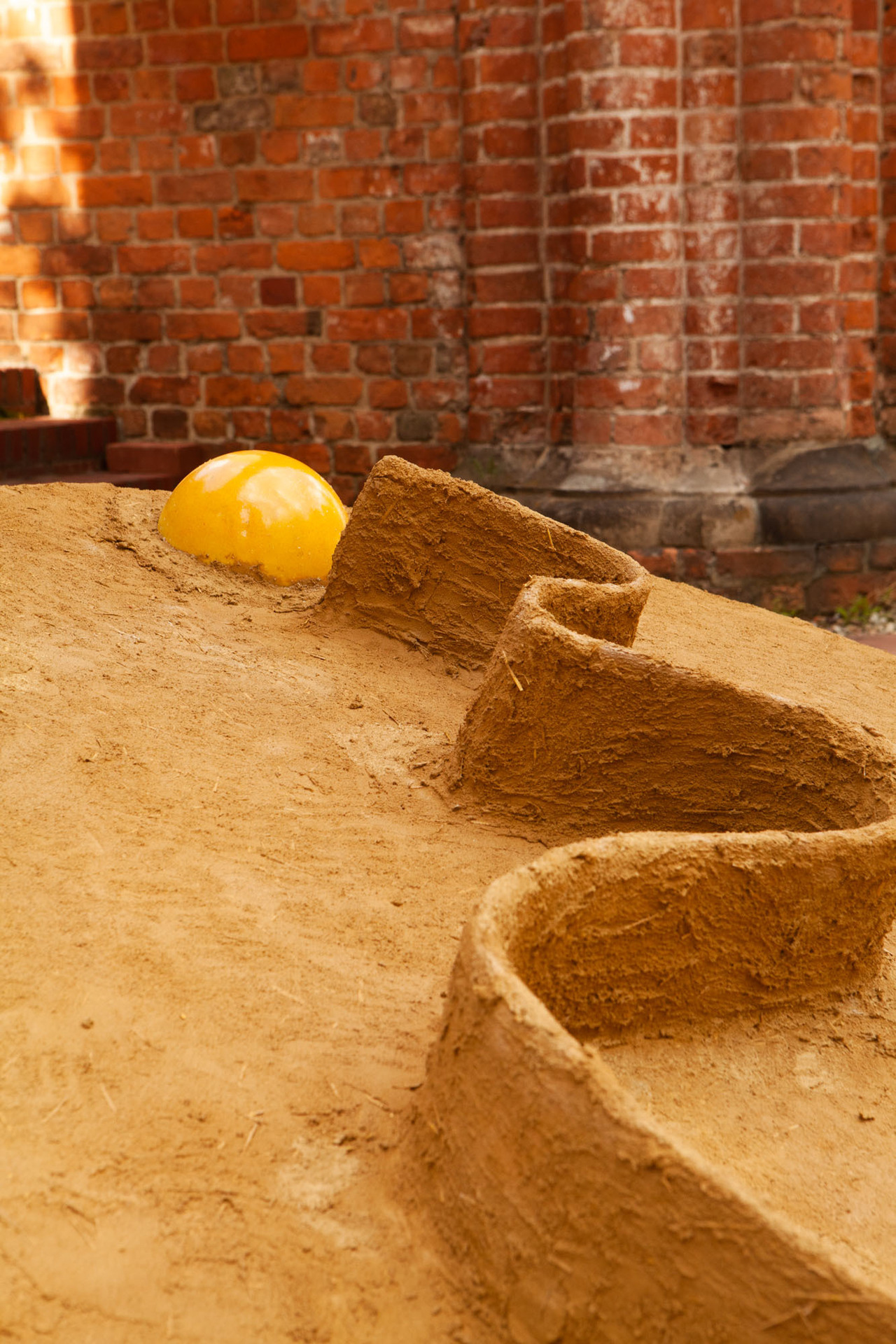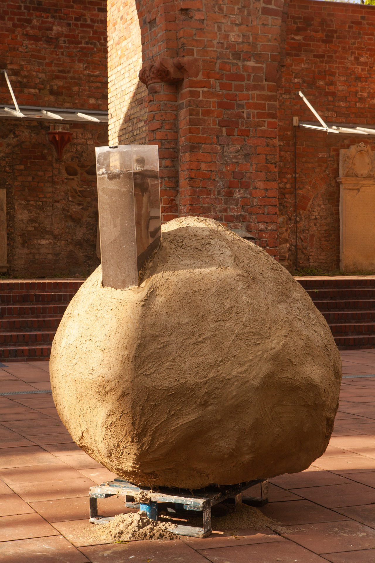Much like an astrolabe, the exhibition explores three worlds: our physical reality,the domain of the internet and its underworld - thedark web. Built byhard-working ants and populated by avatars with visions of violence and fetish, this cosmos formed from mud and literally stamped out of the ground of the monastery ruins is forever on the brink of collapse.Text