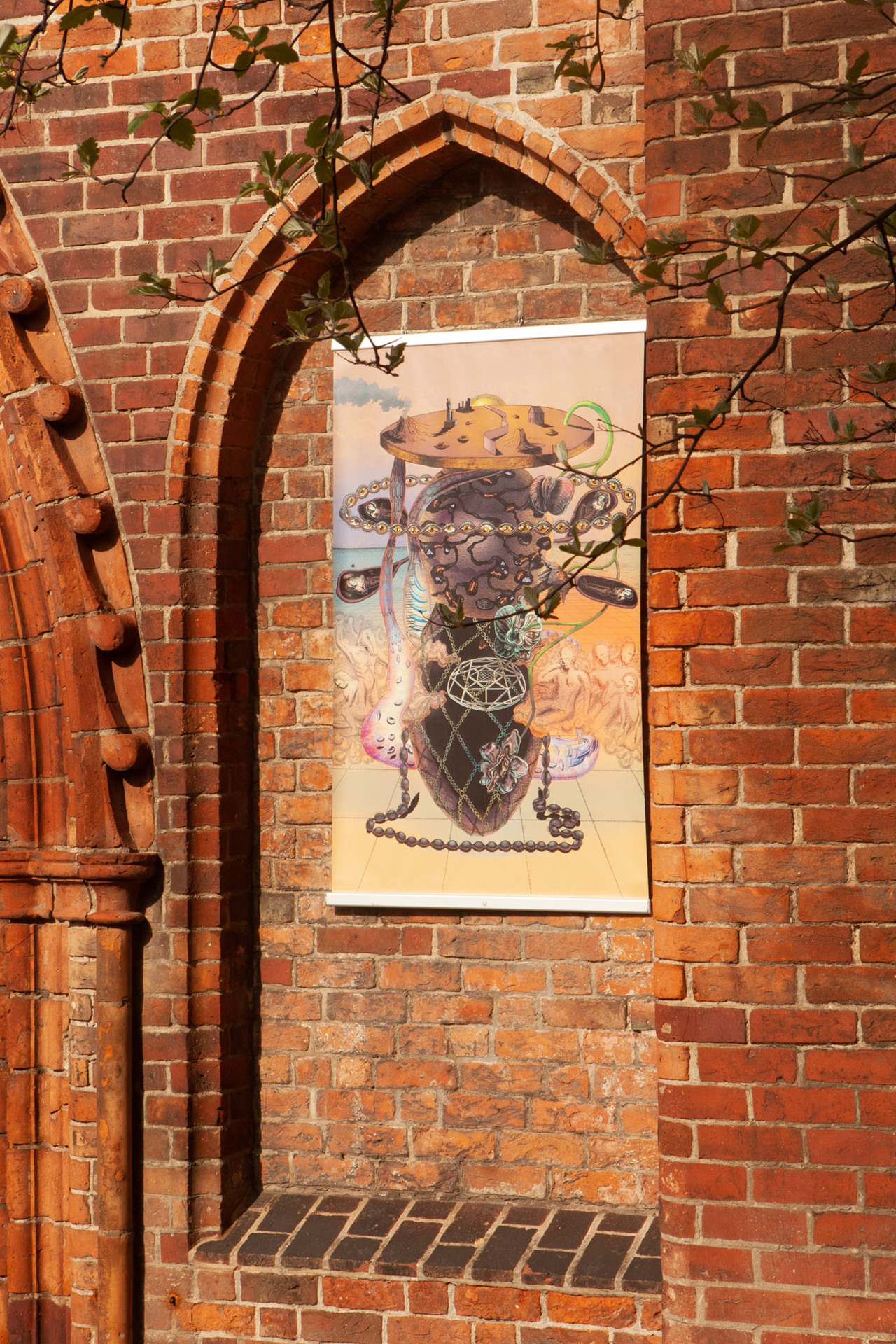Providing a sort of legend to the entire exhibition, Szaflarski has installed a large reproduction of a drawing next to the front gate of Klosterruine. The drawing offers an almost cosmological vision of a world, or better, of three connected worlds, the analog world (hello, flat earther), the internet and the darknet, all mapped onto a virtual plane. The three worlds are arranged hierarchical and are yet connected through various circuits and loops, an anachronistic infrastructure consisting of analog and digital, human and non-human elements, in equal parts science-fiction, “psychobuilding” and paganist icon, evoking a future that never was.