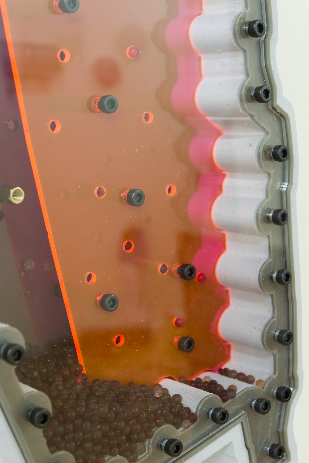 As a saline solution drips, like beads of sweat, from within an hourglass-shaped sculpture, we are challenged to face the double labor of passing time and the production of salt crystallizing before our eyes. Mounted on the walls, loaves of brass and aluminum bread are twice baked—once from the flour mixed with the salt of his sweat and baked a second time from the digital scan of that bread—the product of a cross-border traffic of objects at a time when humans could not make the same journey. Does the derivative product of the labor of man-made salt in doubly baked bread (the giving of salt and bread being a traditional show of Greek hospitality) allow us to transgress contemporary restrictions of in-person exchange? Or might our cultural values be transformed through a reflection of the human condition, for example, in Stempfer’s response to Benvenuto Cellini’s Saliera (or “salt cellar”) which reappropriates a gilded cosmological throne of a precious global commodity of the 16th century back to a 21st century digitally printed reproduction of GPS data from the spatialized “runs” of a single man’s physical sweat?
