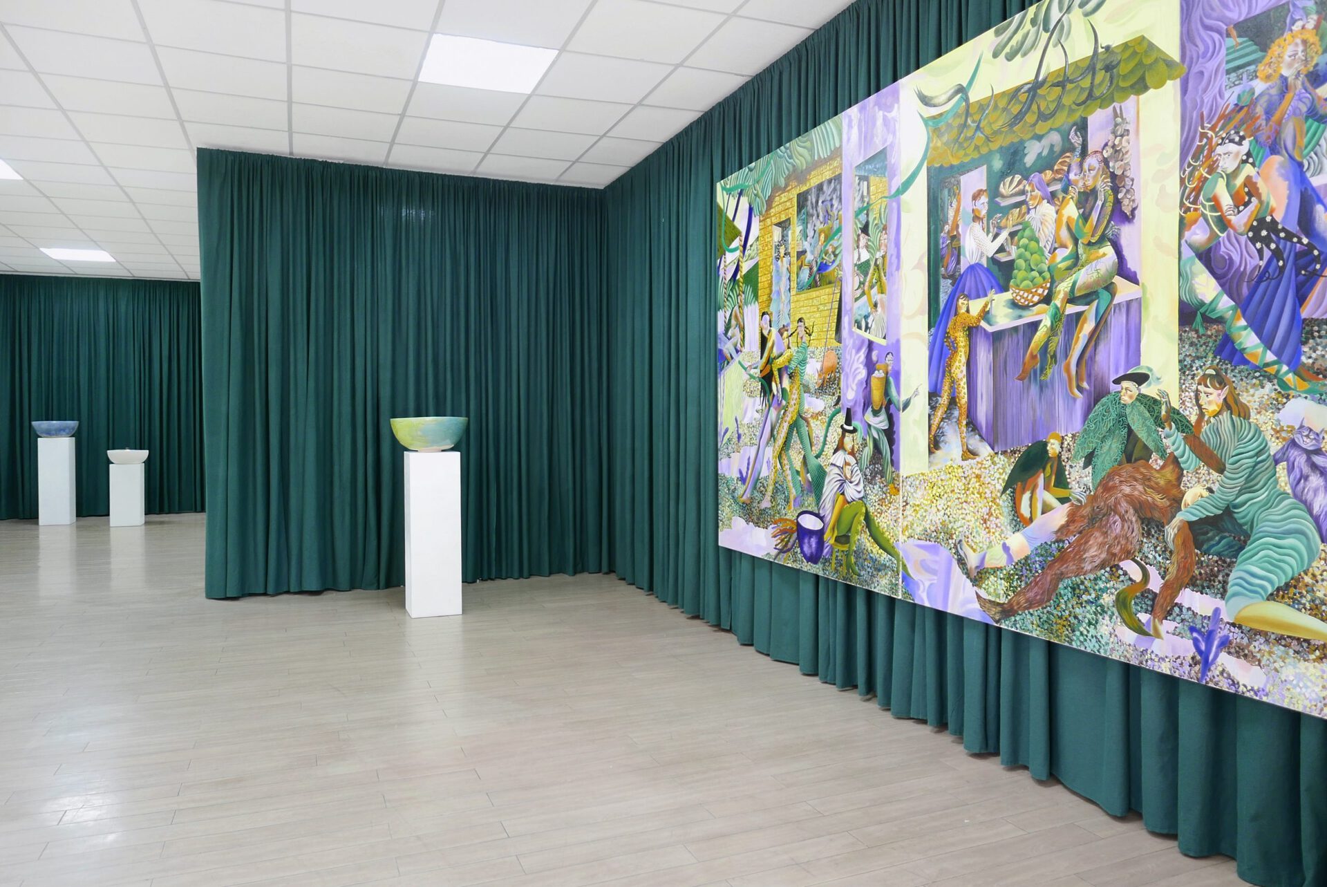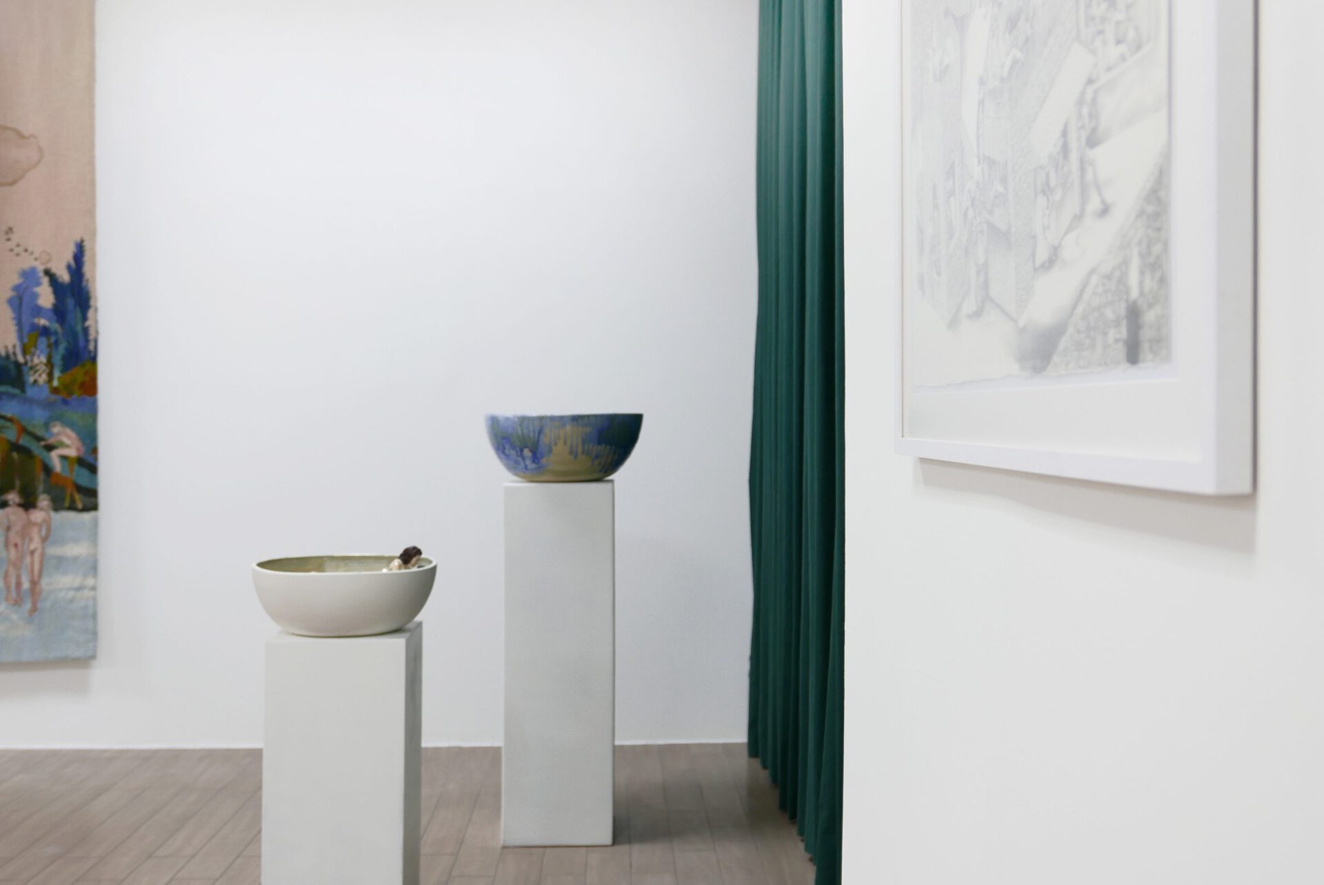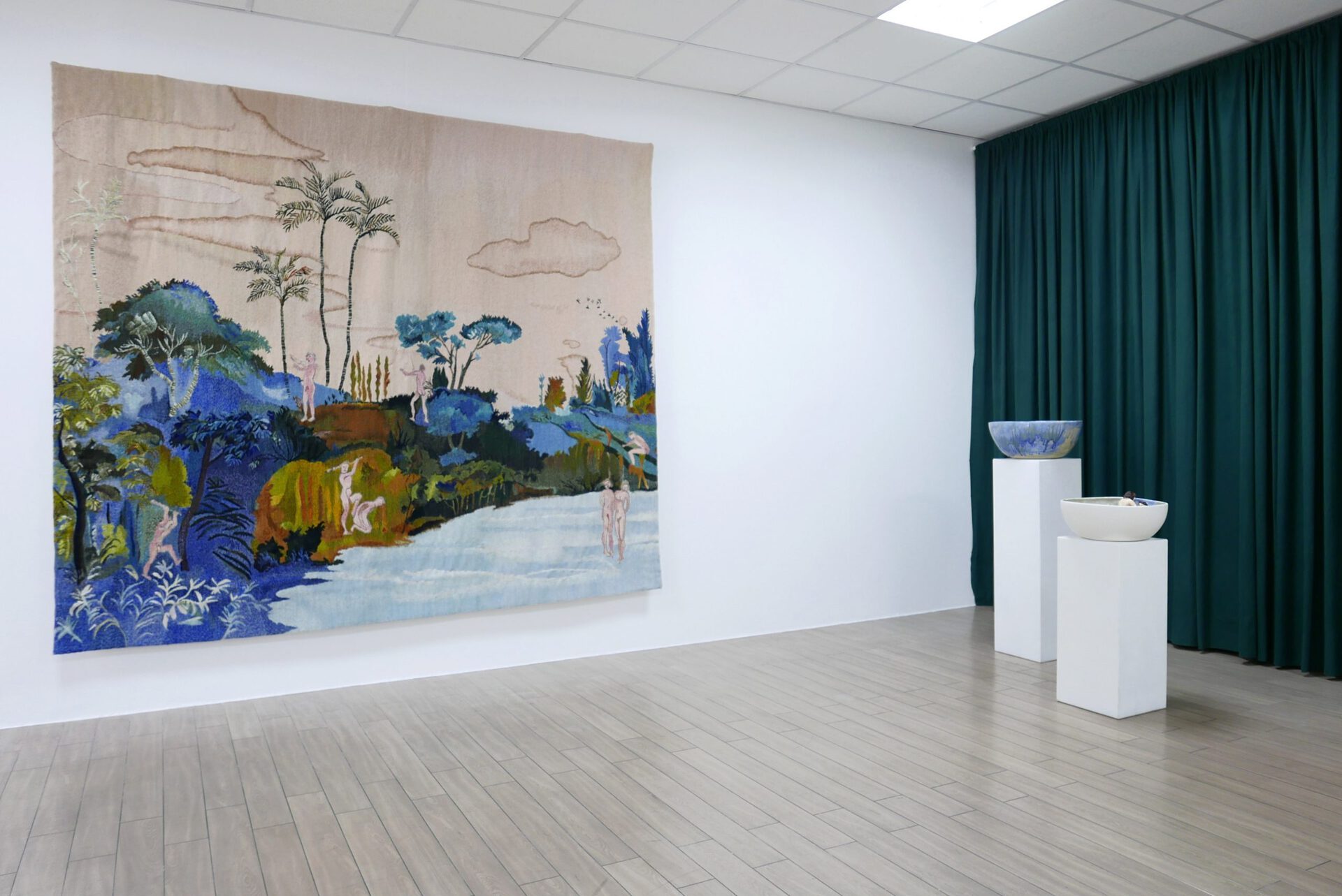 The work of the three artists in the exhibition – Sanam Khatibi, Jessie Makinson, and Urara Tsuchiya – precisely explores the wider power dynamics underlying such accusations through an exploration of violence and sensuality across human and animal species. Filled with humour and antagonism, the artists’ paintings, tapestries and ceramics reflect the ambivalence in more-than-human behaviour. As cruelty and care become interchangeable, the scenes present a kind of lust shaped by a constant negotiation between desire and repulsion.