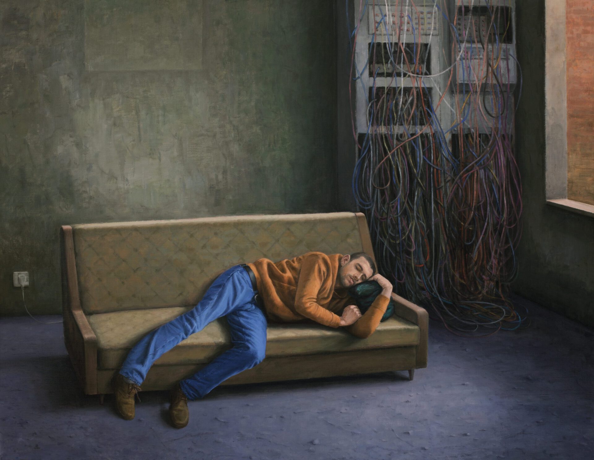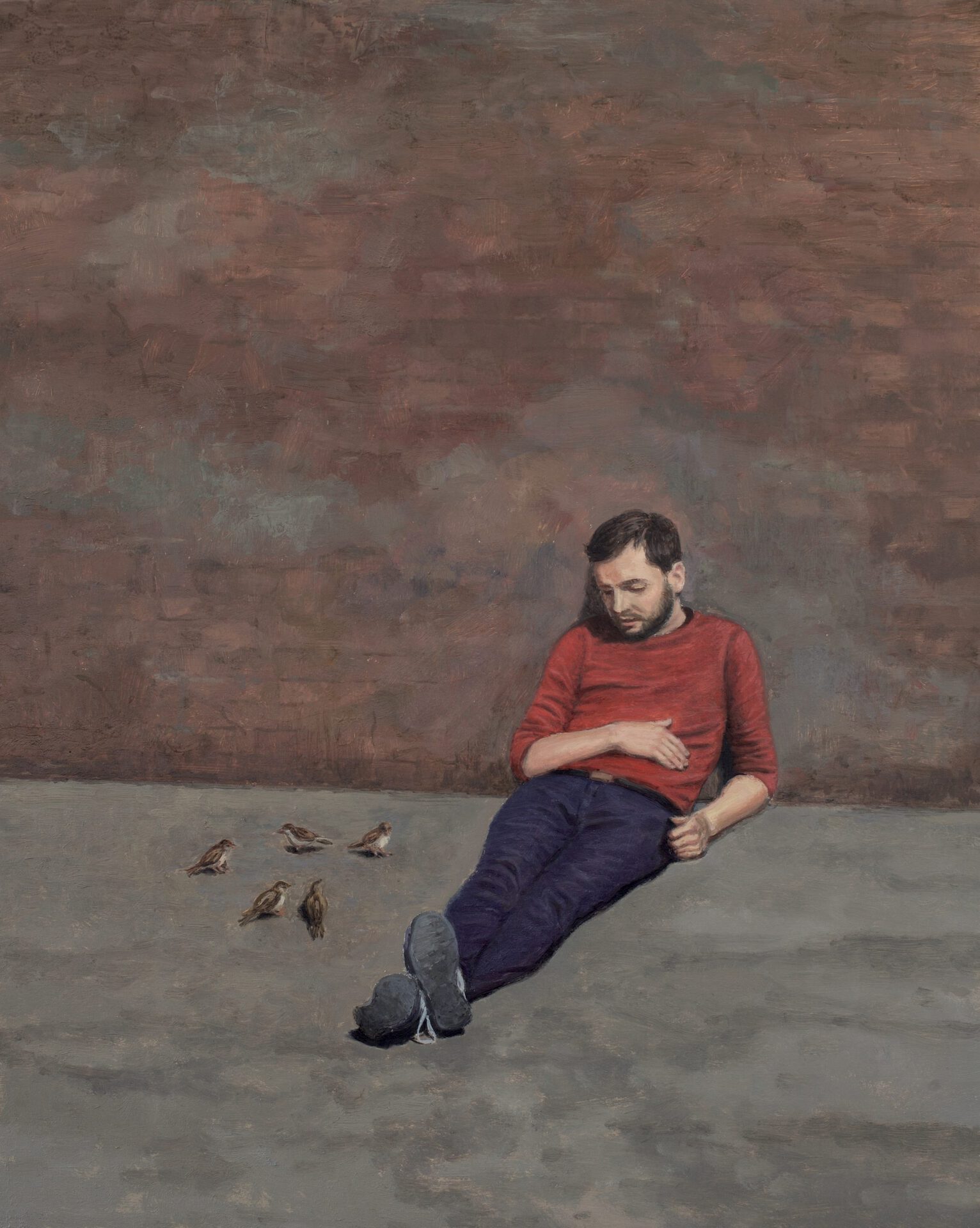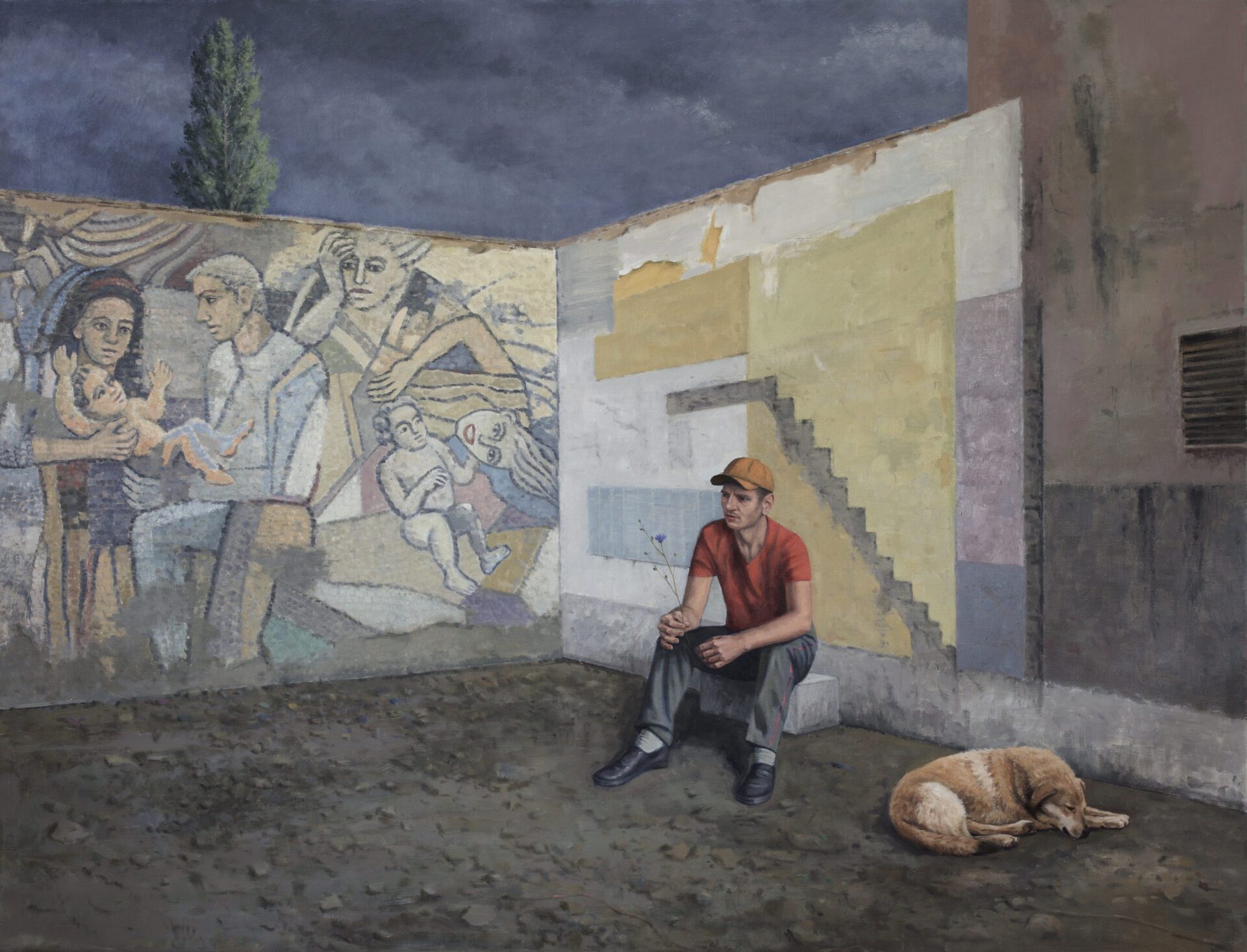 The rhythm of life of the figures in Şerban Savu’s paintings is marked by work and rest, though it does sometimes happen that their lives are devoid of structure. Then the gap is filled by waiting for a meeting that never arrives. Or it could be that the (almost exclusively male) figures in the works by this Romanian artist have given up waiting for anything. They have closed up in their internal problems, they are indifferent to politics or the ongoing modernization of the country that has caused their misery. If they do work, it is without conviction, not of their own initiative, they are hired by foreign capital. They fall asleep in the sun. The weather is generally fine, like in paintings of the Quattrocento, and if the sky is clouded over, it is to reflect a mental state, emotions, melancholy, or regret.