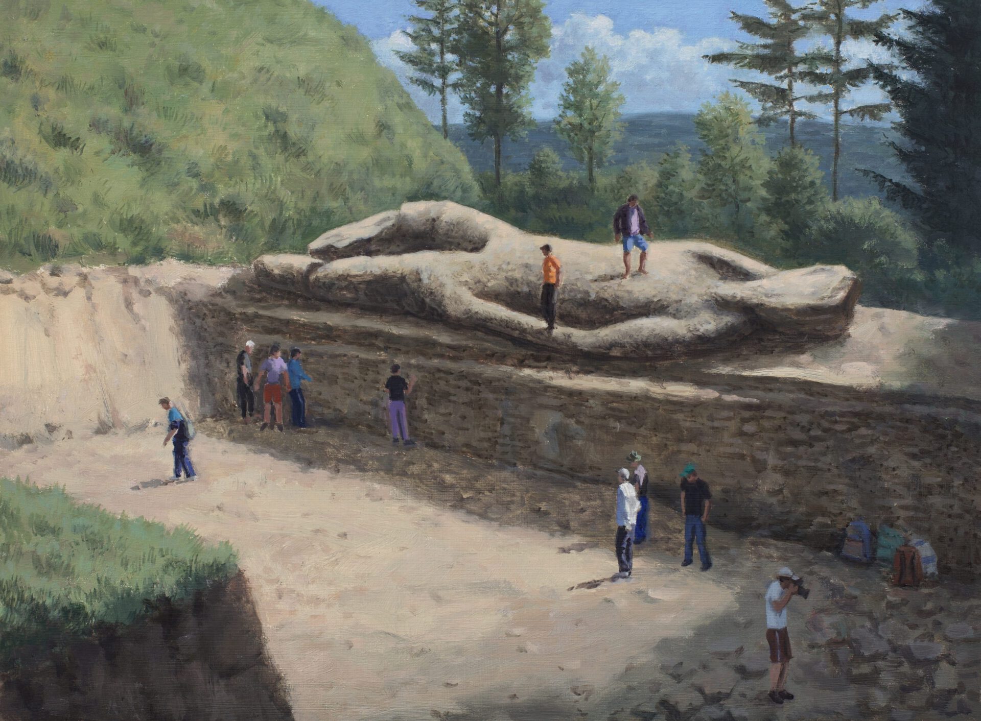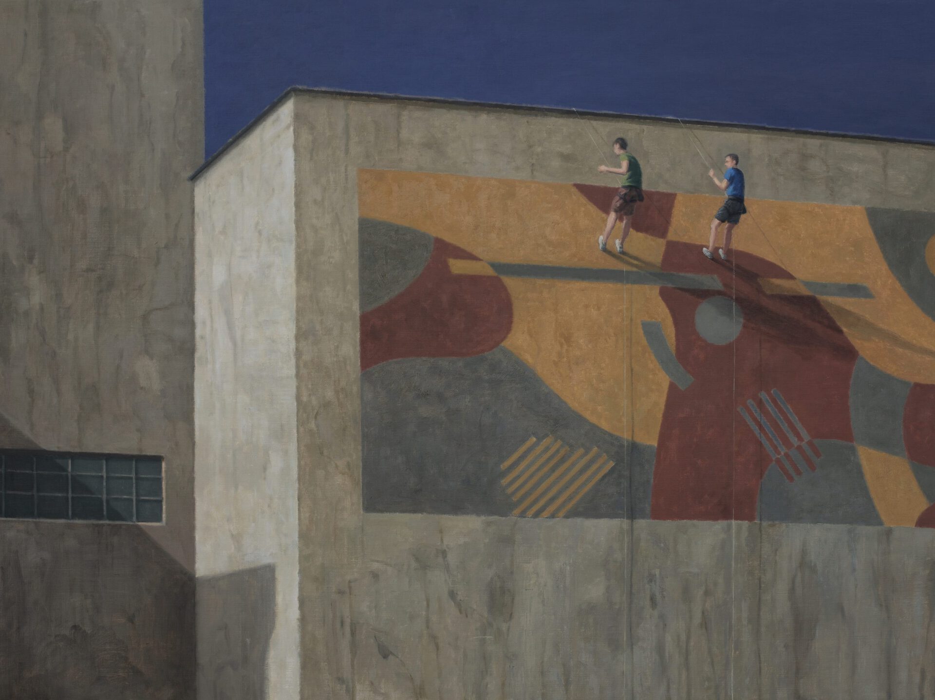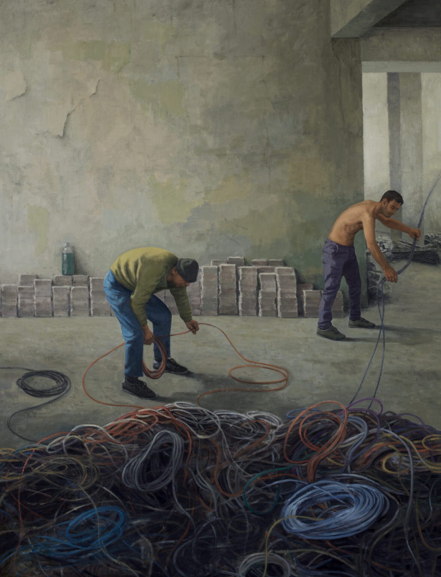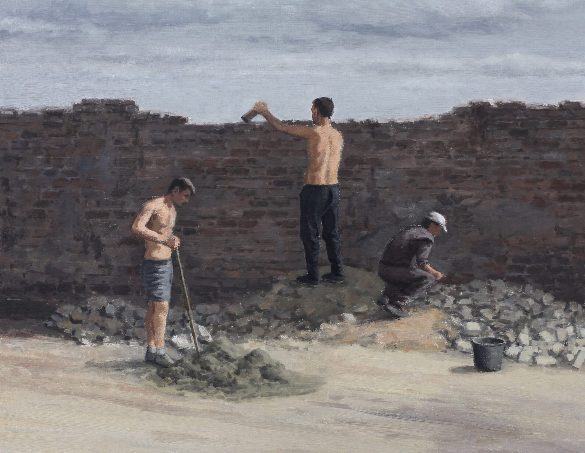 The rhythm of life of the figures in Şerban Savu’s paintings is marked by work and rest, though it does sometimes happen that their lives are devoid of structure. Then the gap is filled by waiting for a meeting that never arrives. Or it could be that the (almost exclusively male) figures in the works by this Romanian artist have given up waiting for anything. They have closed up in their internal problems, they are indifferent to politics or the ongoing modernization of the country that has caused their misery. If they do work, it is without conviction, not of their own initiative, they are hired by foreign capital. They fall asleep in the sun. The weather is generally fine, like in paintings of the Quattrocento, and if the sky is clouded over, it is to reflect a mental state, emotions, melancholy, or regret.