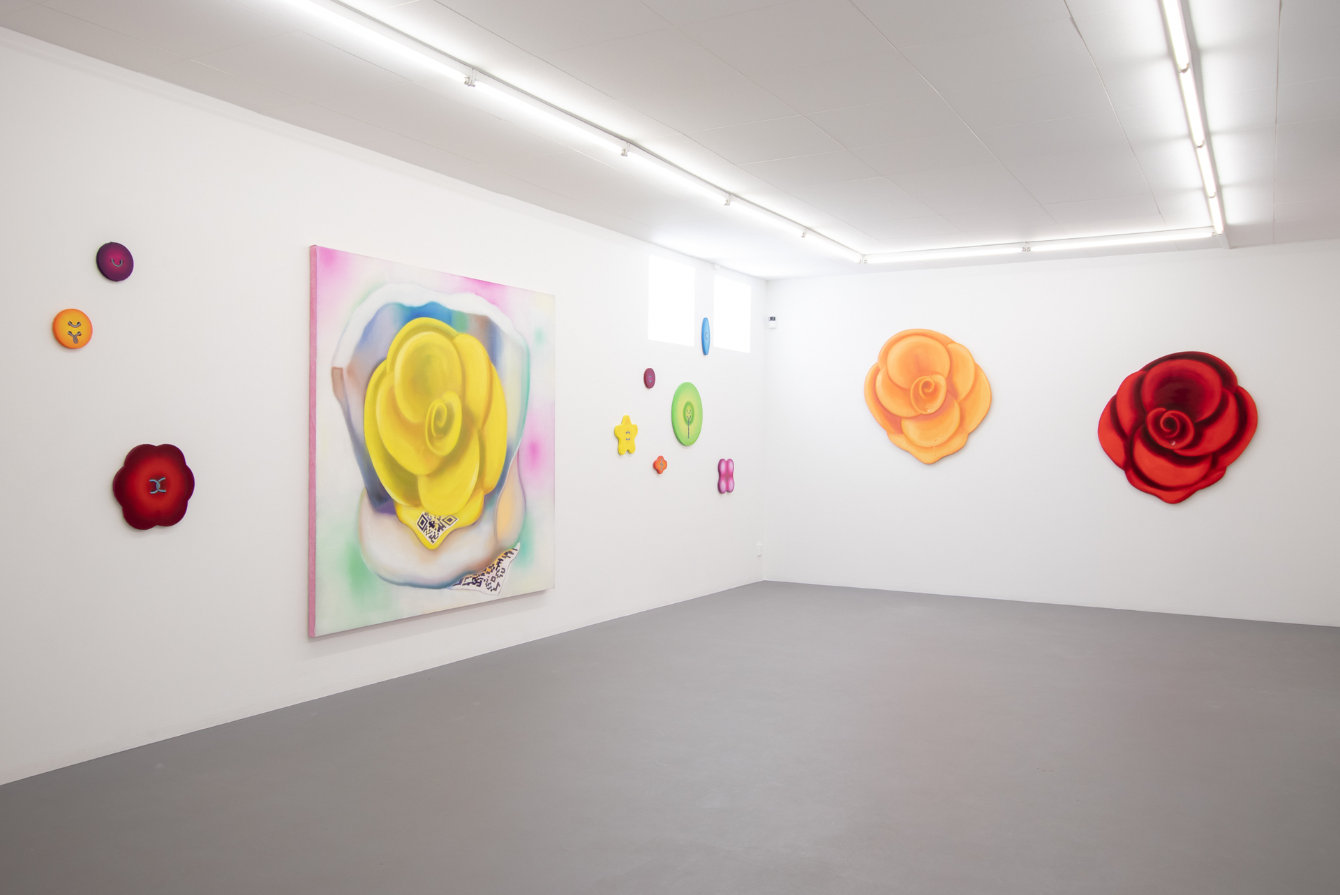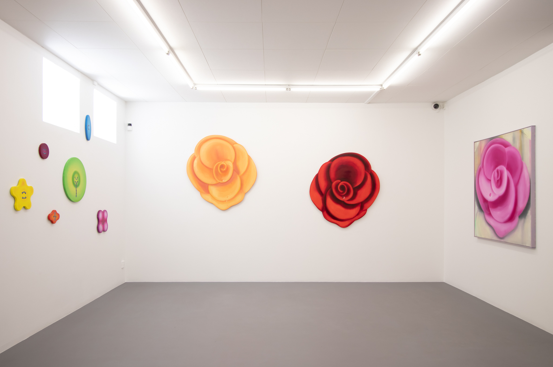 One can understand that the kaleidoscopic flowers of the American artist Judy Chicago have inspired Nylander. And just like the flowers of Georgia O’Keeffe, also American, the size and magnification of everyday small things has become important to Nylander. It may not just be a coincidence that the new paintings, those of the roses, now require space. Extensive space next to the buttons. Intrusively large. The roses turn their outcast, enlarged faces straight onto the viewer. For us humans the meaning of the rose is associated with love, gratitude and friendship. In literature, the rose has a given place. The most famous literary rose quote is “A rose is a rose is a rose” which Gertrude Stein states in her poem Sacred Emily in 1913, an explanation that everything is just the way it is. To me, Nylander’s roses belong to the same wave of thought. They are what they are, even if they are absurd. They are seductive and stylized, peculiarly vibrant and far from the stiff marzipan flower of the common birthday cake. It shines with obvious love, an individually coloured rose for each and every one of us.