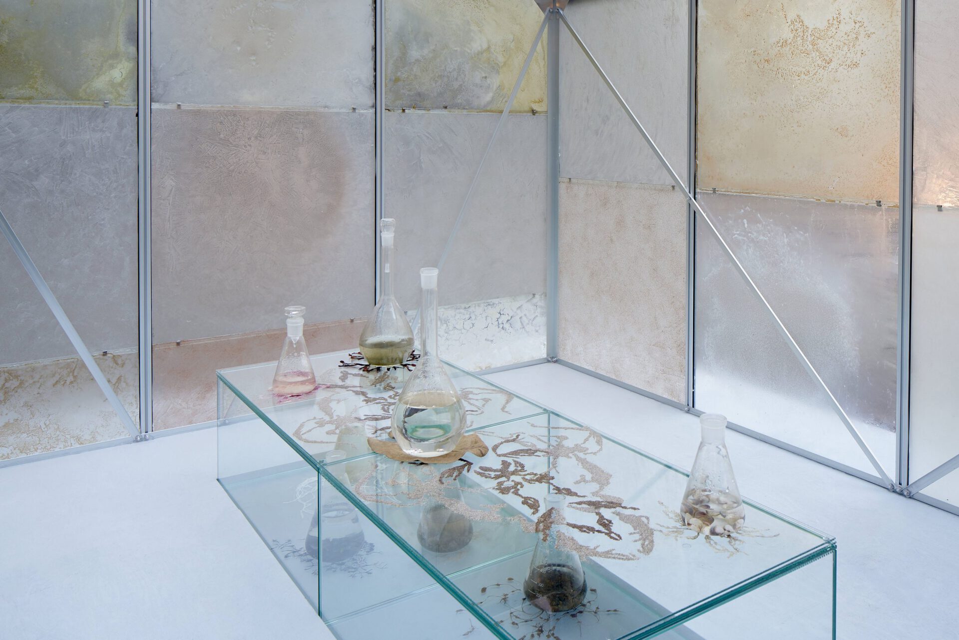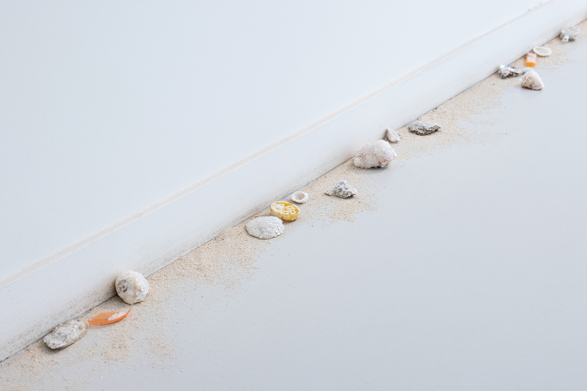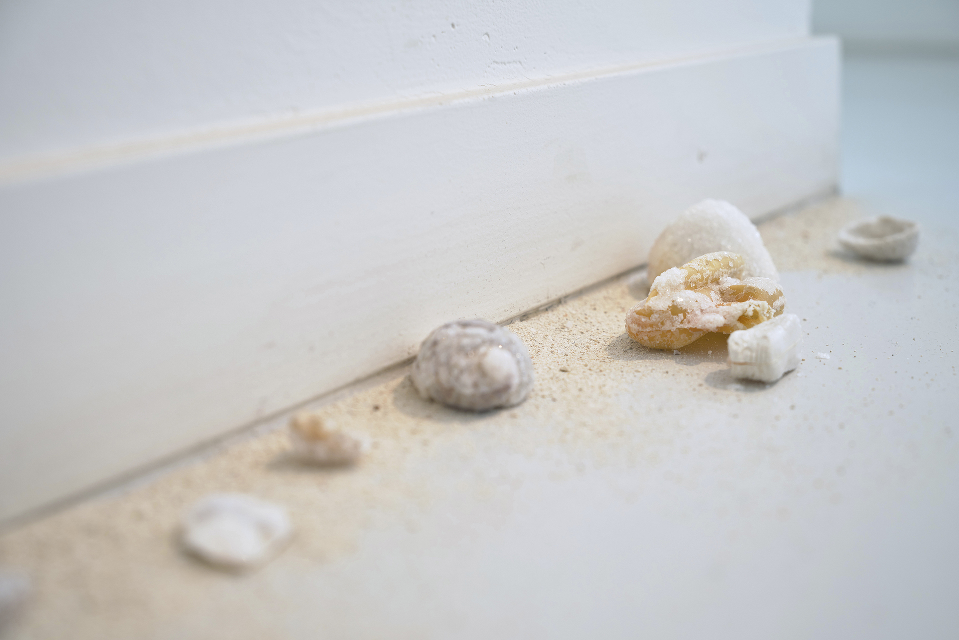 All the colour pigments of the exhibition have been gathered by Salonen from various natural sites around the world. She has made colours by cooking algae and aquatic plants, as well as grinding seashells, plastic debris and pieces of dead corals drifted ashore.Text