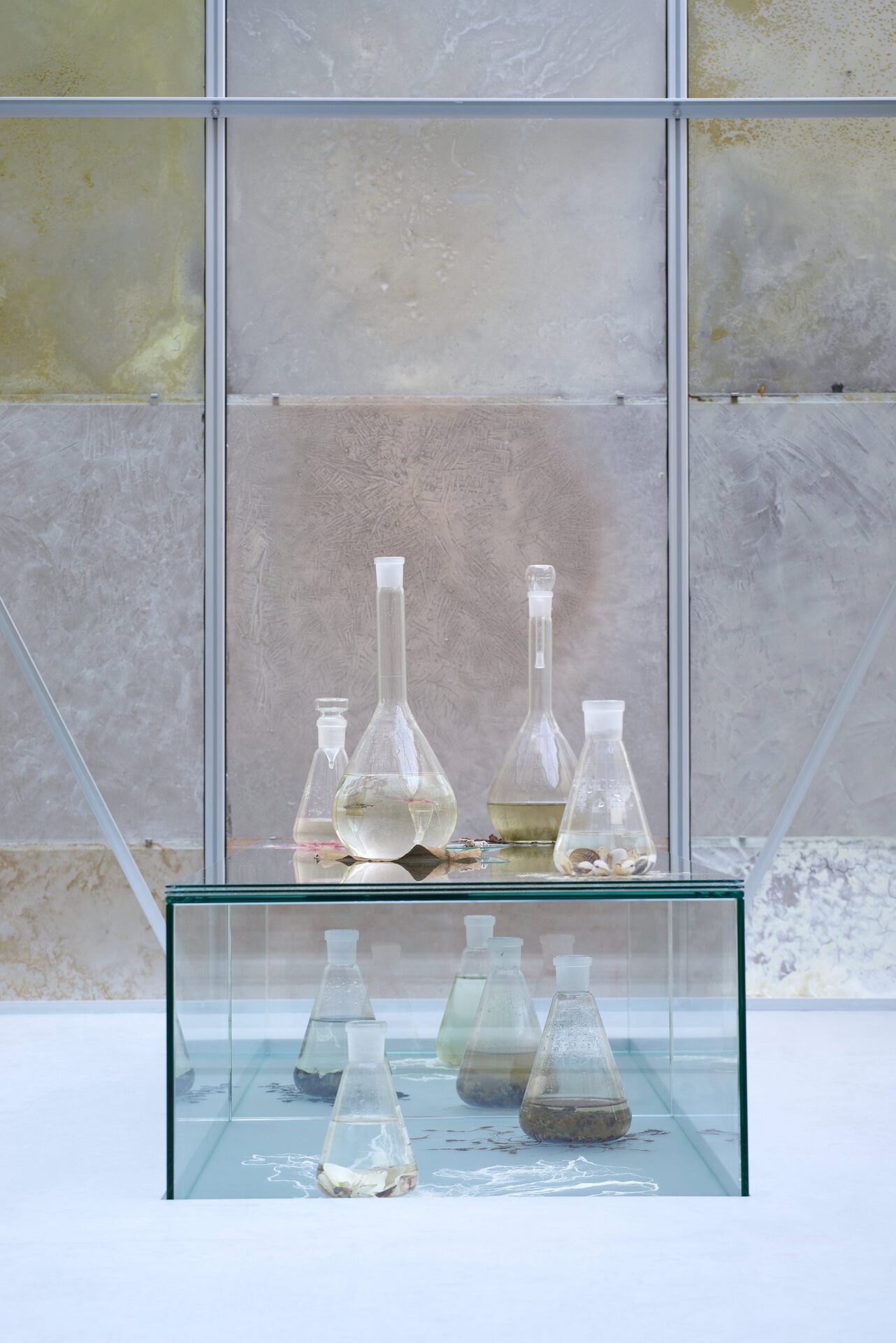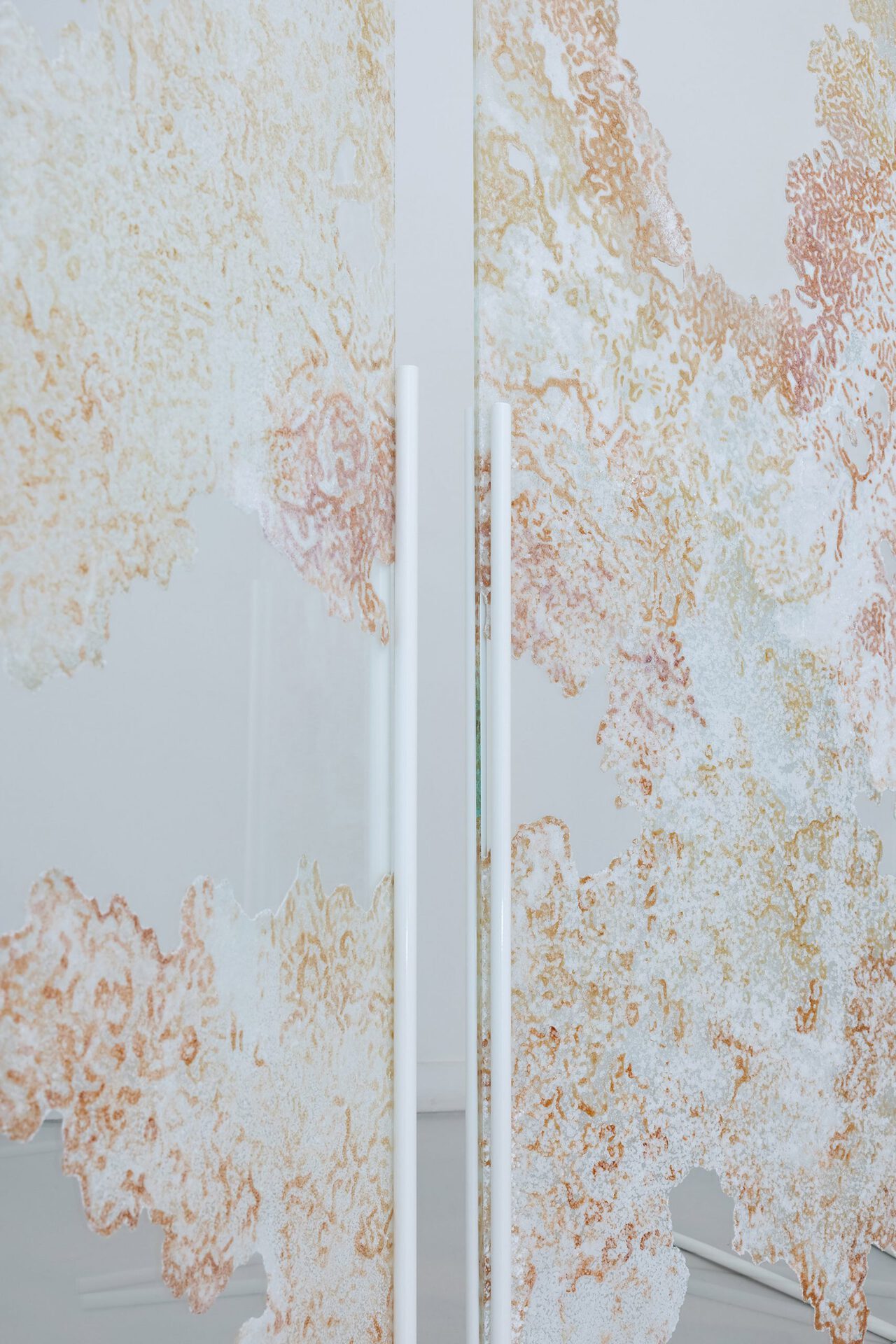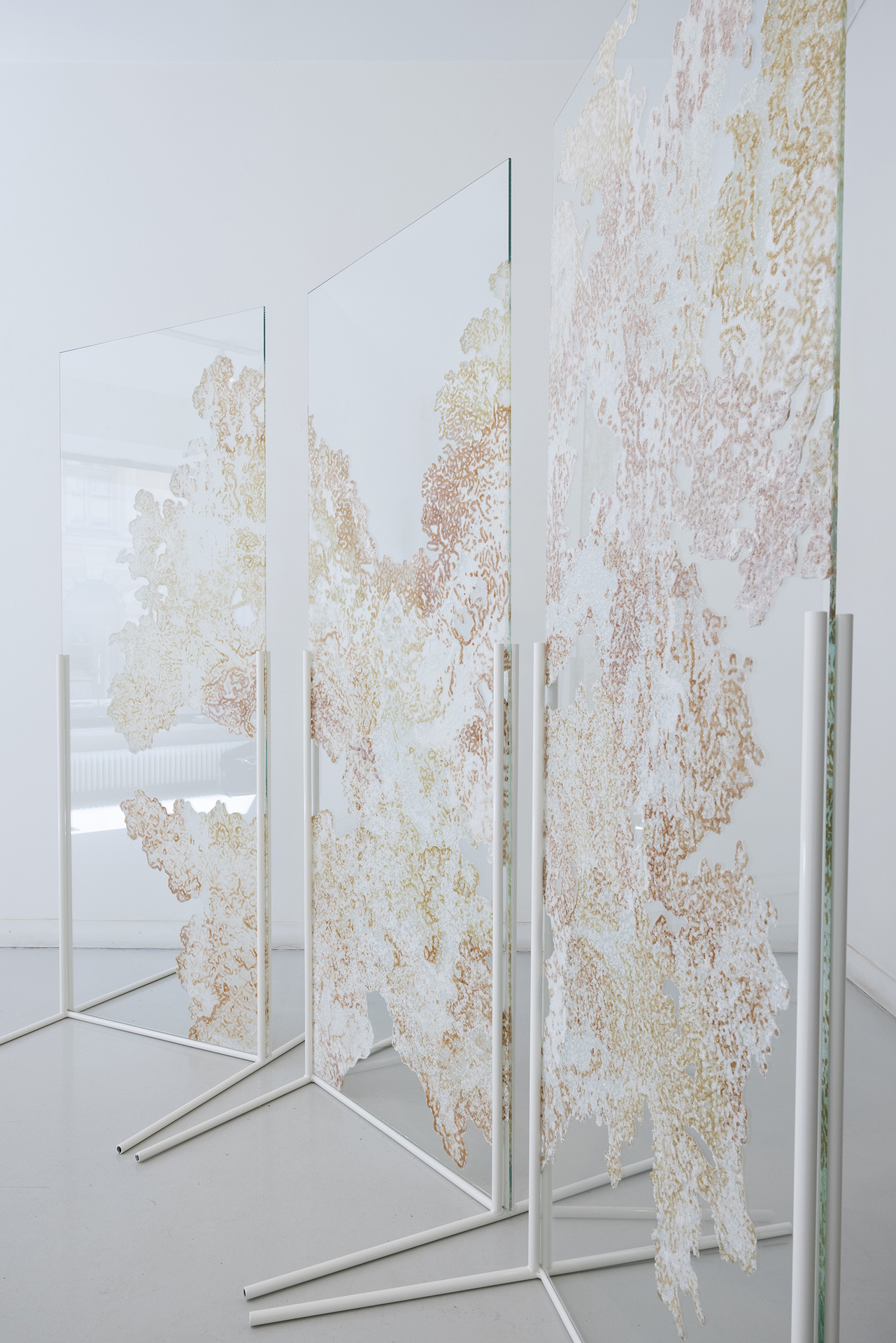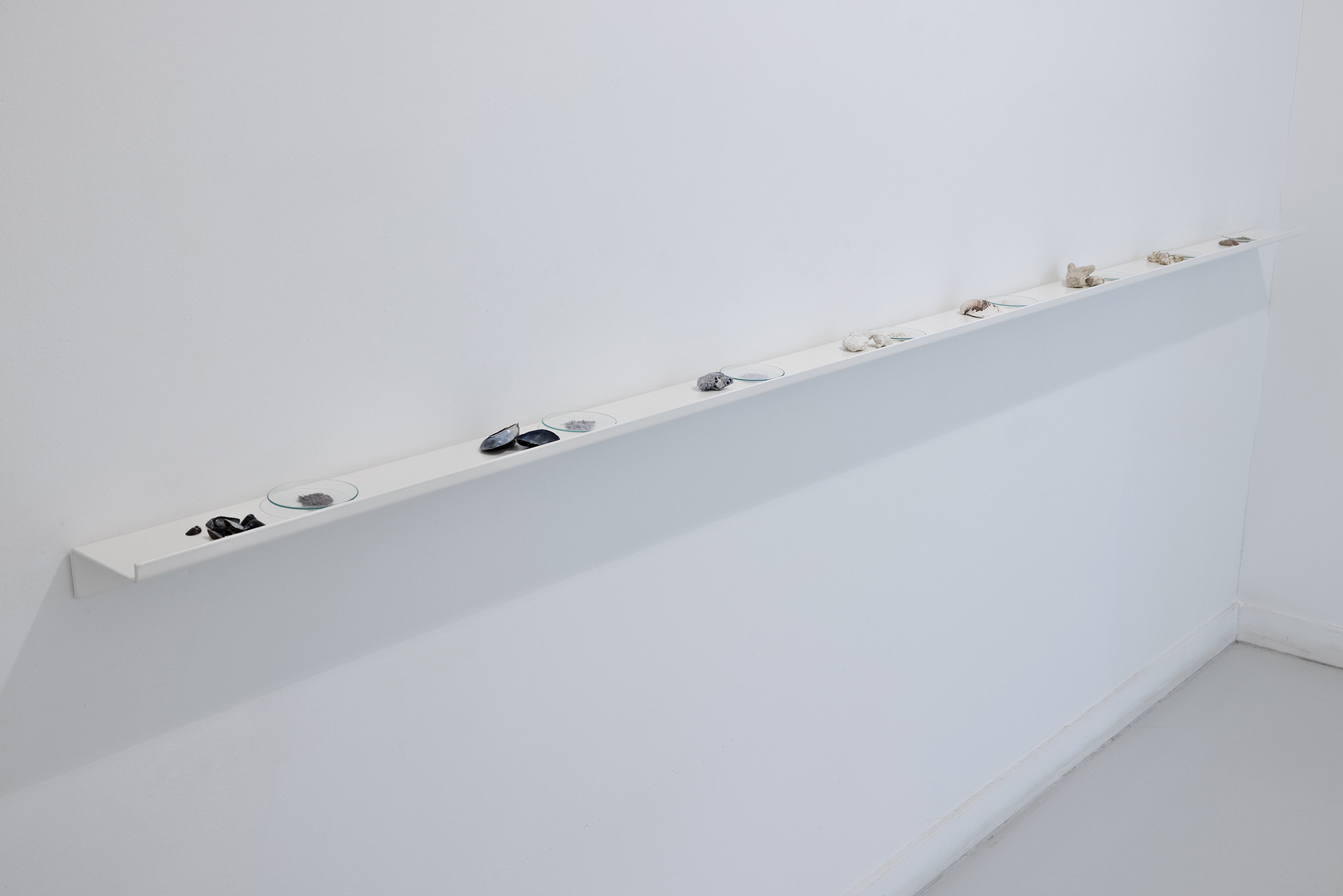 All the colour pigments of the exhibition have been gathered by Salonen from various natural sites around the world. She has made colours by cooking algae and aquatic plants, as well as grinding seashells, plastic debris and pieces of dead corals drifted ashore.Text