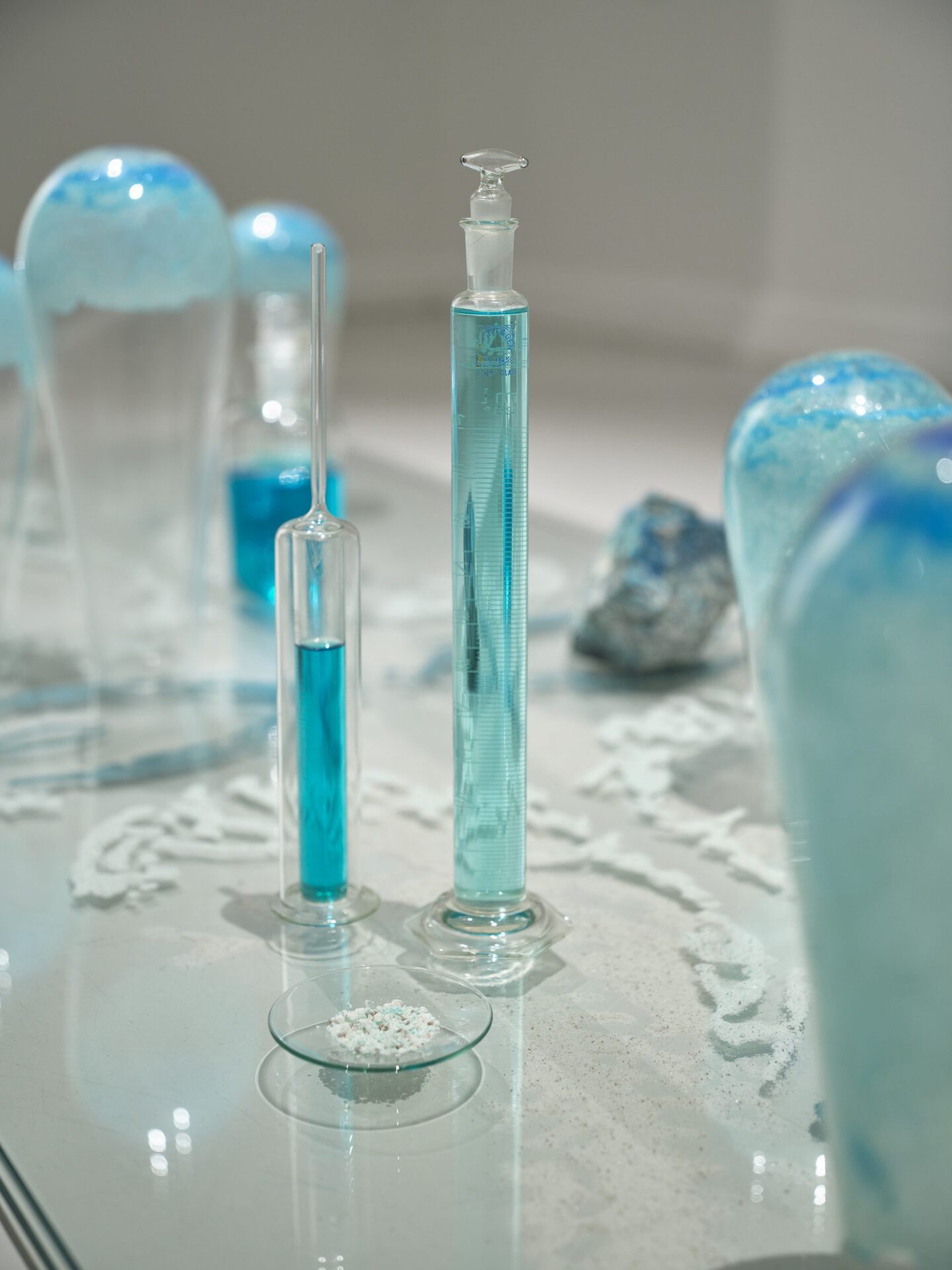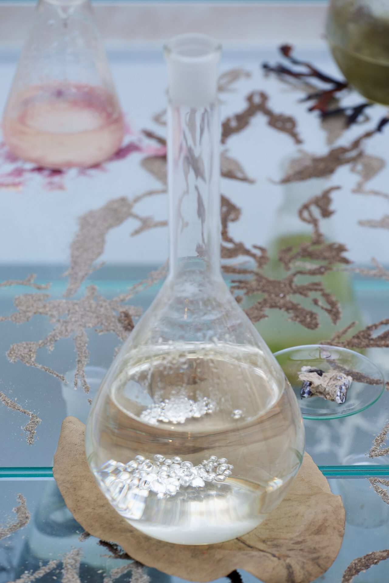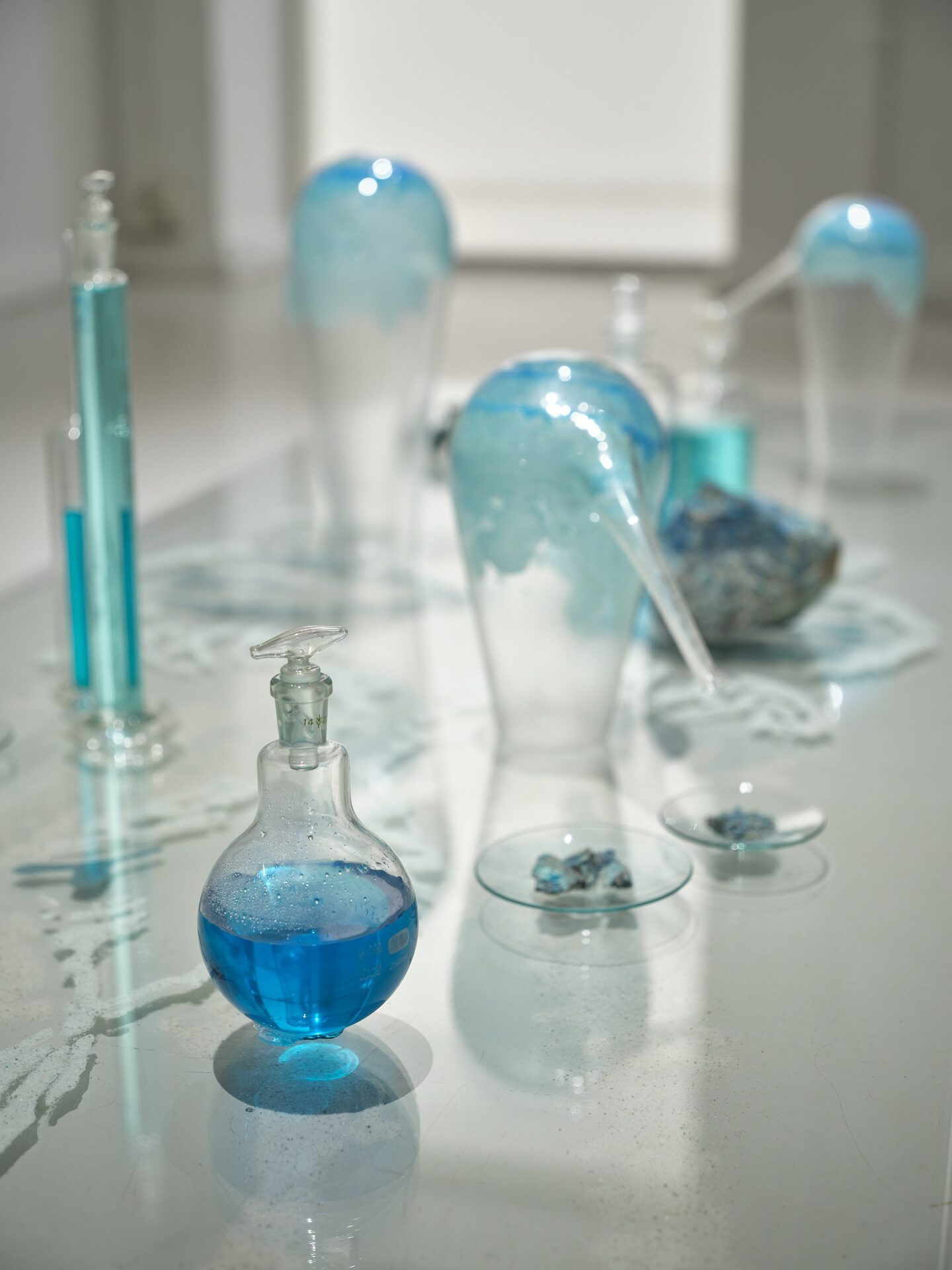 Medieval alchemists studied natural materials, from which they also made colours. Through the materials, they tried to understand the surrounding universe and at the same time the interconnectedness of everything, the role of the individual; oneself. One of the most important steps in alchemy was repeated distillation, which left the purest essence of the substance - and the alchemist - in the glass flask.