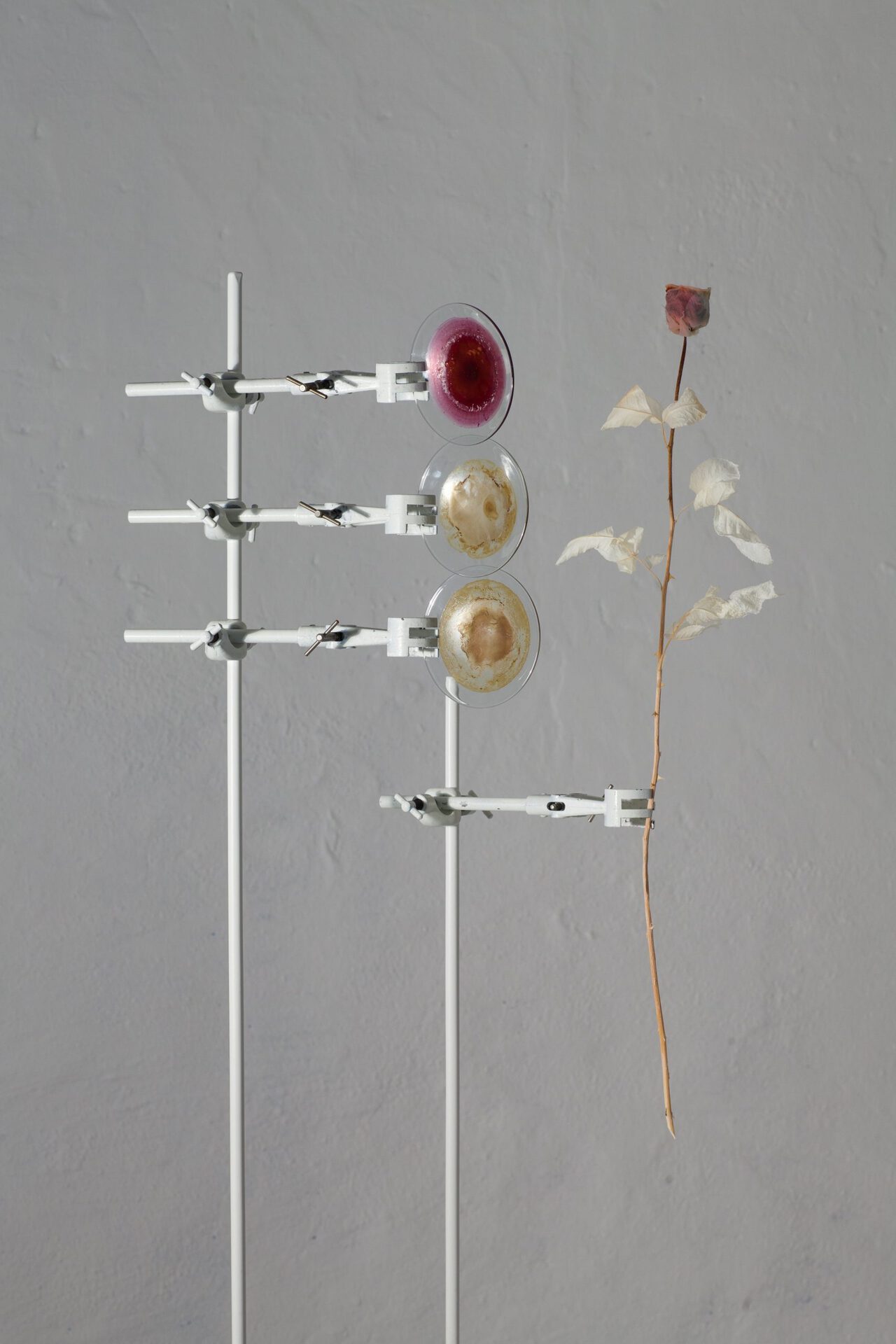Elsa Salonen’s works emerge from her artistic interpretation of alchemical knowledge. The artist distills colours from flowers, processes the colours further, and bleaches plants to make them appear entirely white. In addition, she prepares her own pigments from a range of specific natural materials - from meteorites to fox bones - according to the poetic concept of each work.