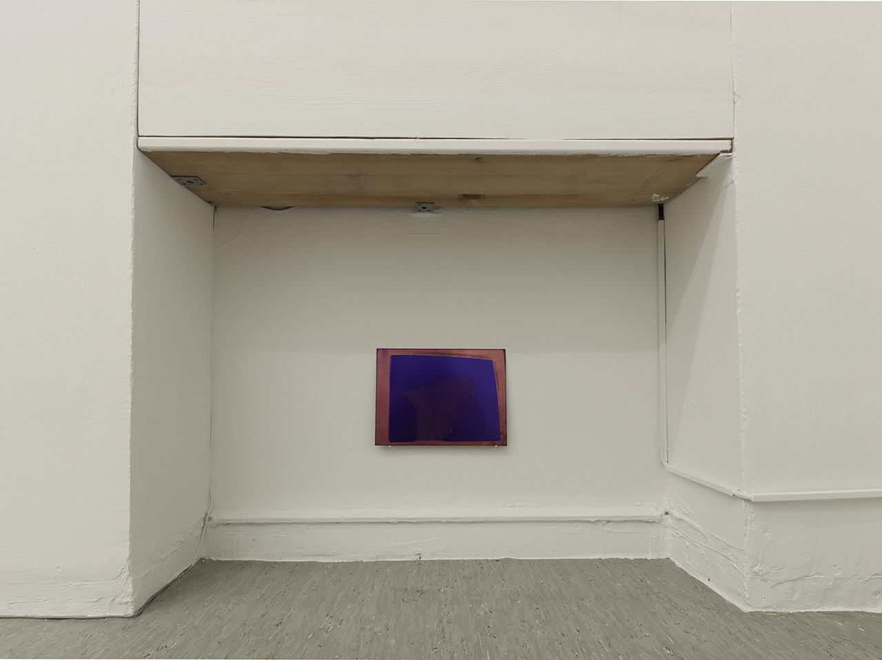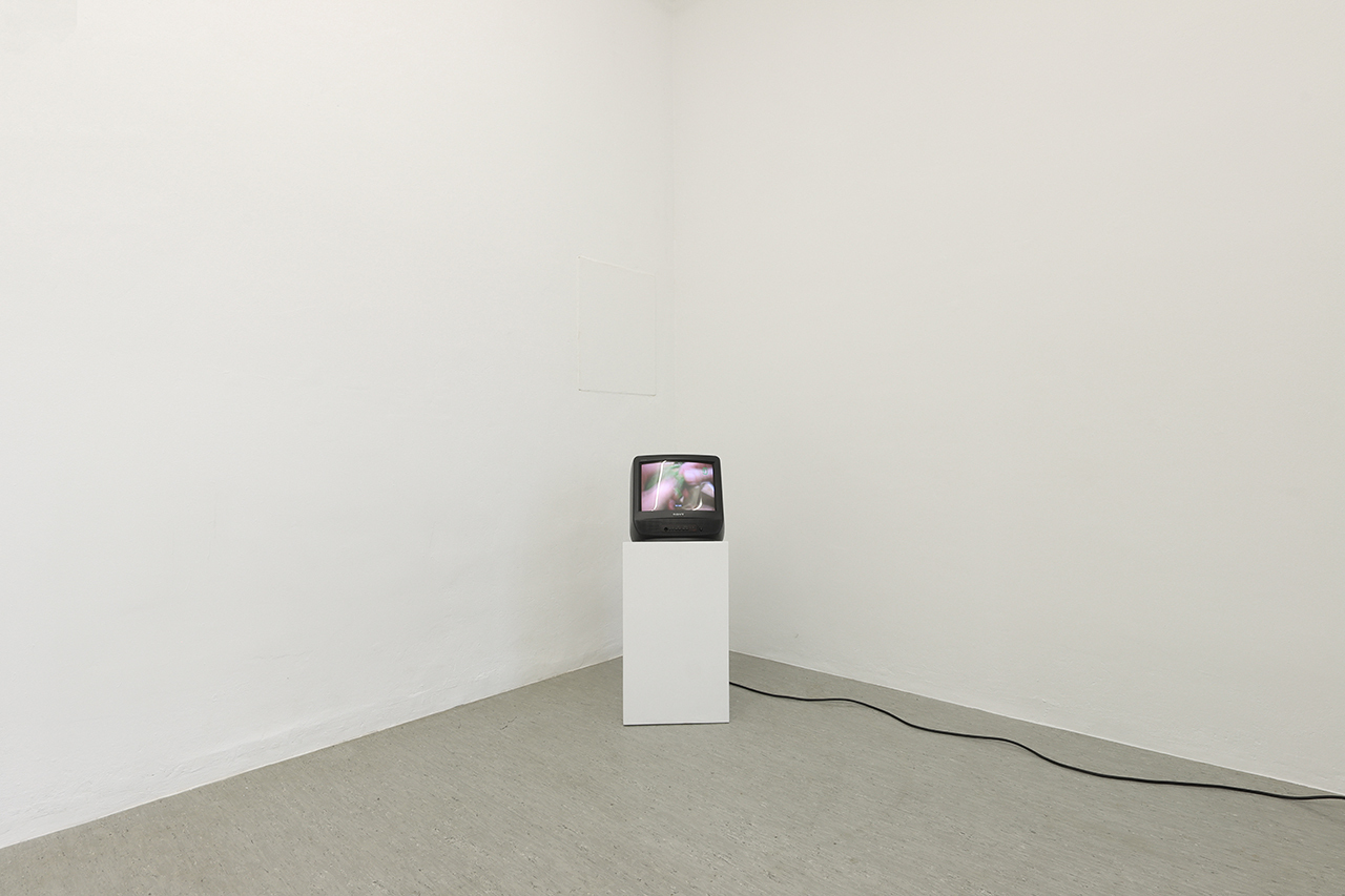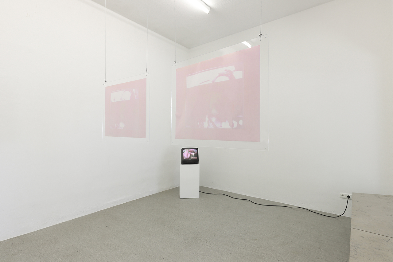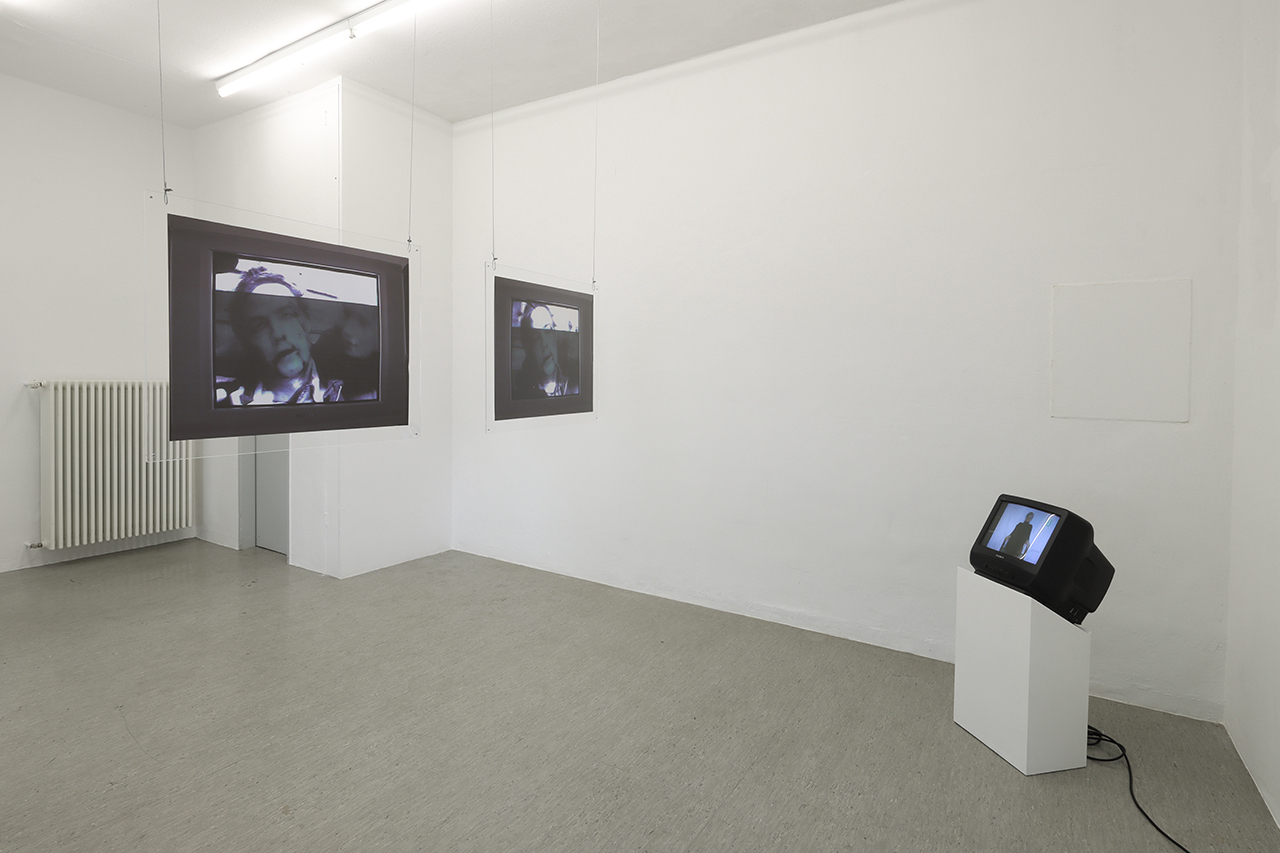 A counter-position to the maternalistic focus of the exhibition is formed by the prints hanging centrally from the ceiling, the backs of the prints revealing a glimpse of its bruised colored ink. The two photographs are part of the series 16 Marlons (2005/2021) and build the recourse to the archive of the mother, whose pictorial subjects are often associated with allegories of violence, nature, perceived orders of the world as well as human instincts. 16 Marlons (2005/2021) show a TV screen displaying the film On the Waterfront (1954) with Marlon Brando's face and, at the edge of the image, the outline of a woman who appears to be supporting him. Whether he is in pain or close to death remains hidden in this depiction, with the reinterpretation of the moving medium into a static one transfiguring its fictional or real meaning. Elsa Stanyer thus creates a two-dimensional void despite the supposed view into a television set. Brando's facial expression could be a mimicry of the ancient sculpture Laokoon, whose highly exaggerated, masculine figure in Greek mythology embodies the ideal image of the father who tried to liberate his sons from the grip of a snake. Moving between pain and passion, his iconic pose remains ambiguous, but it evokes an intuitive compassion for the sufferer ("his misery goes to our soul; but we wish, like this great man, to be able to endure misery", Johann Joachim Winckelmann). Juxtaposed with the short film, these works reflect on the representation of artificially evoked compassion and genuine grief. Who experiences empathy and protection? What is grieved and what is not?