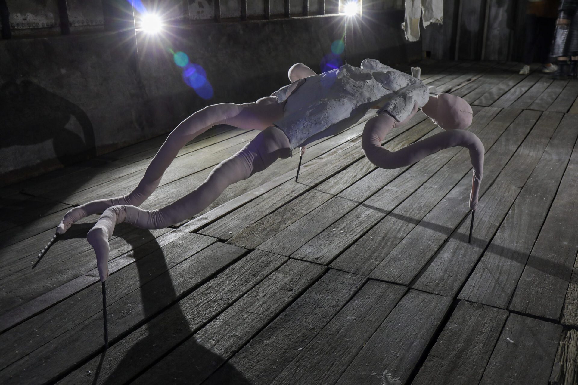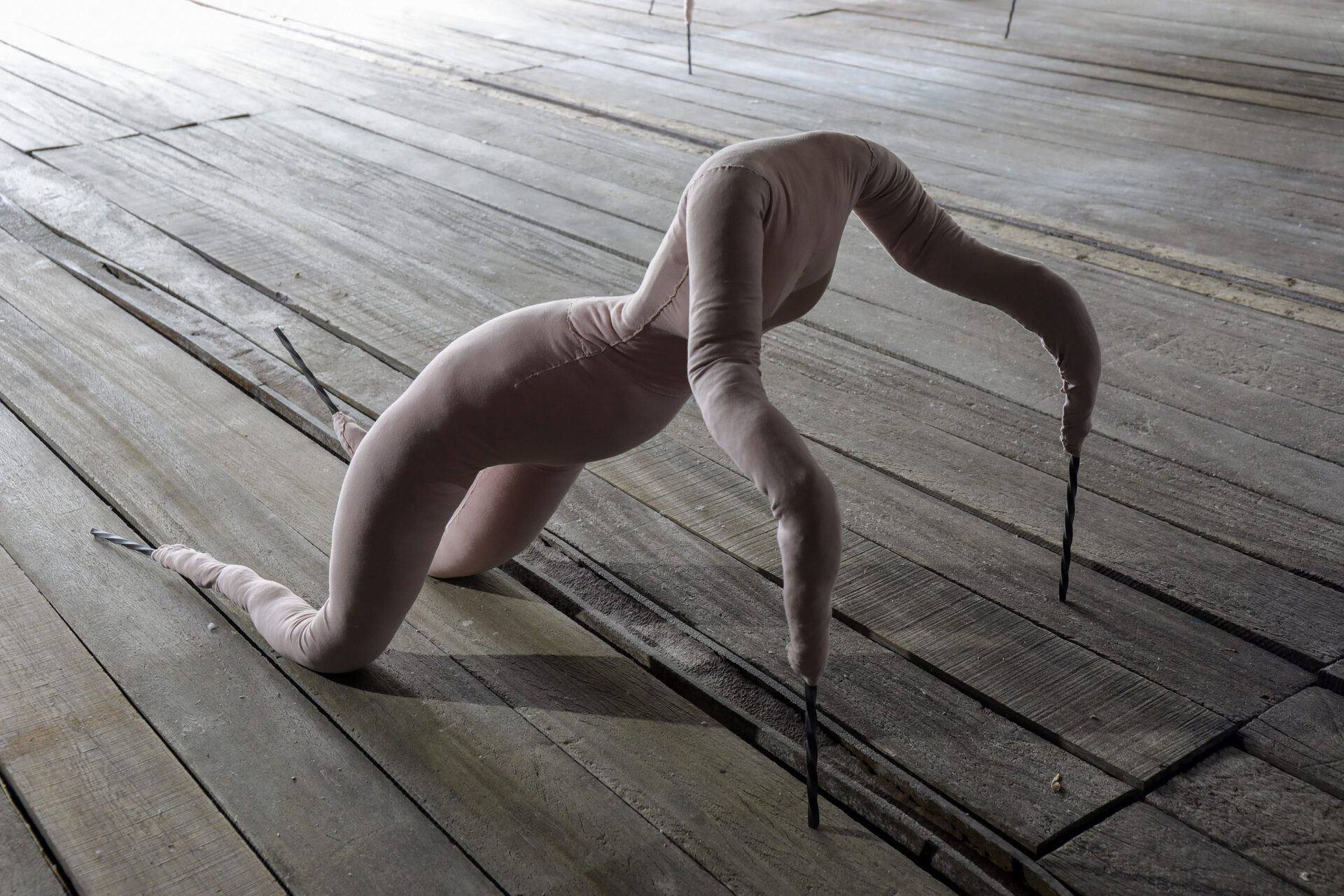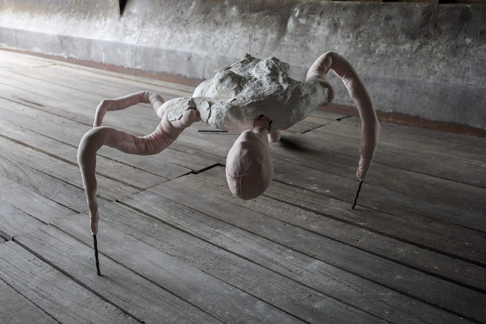 Addressing topics such as vulnerability and the temporality of human existence, the large-scale sculptures are created with found objects and materials; plaster and iron assemble with the softness of skin-coloured fabric in humanoid forms, unnervingly challenging artificially constructed power structures. Crawling on unnaturally long insect-like limbs, one of the sculptures is on the verge of shedding its cocoon, its flesh bulging through every possible extremity. The emerging creature is unapologetic, twisting and arching to take up its space, spreading out like a smaller and softer version of a Louise Bourgeois spider.