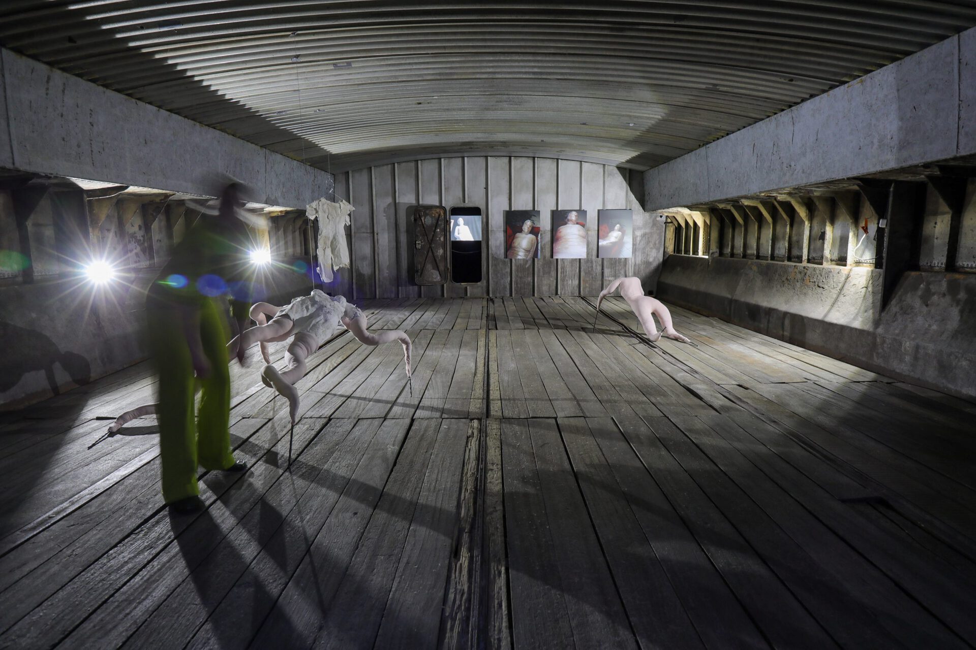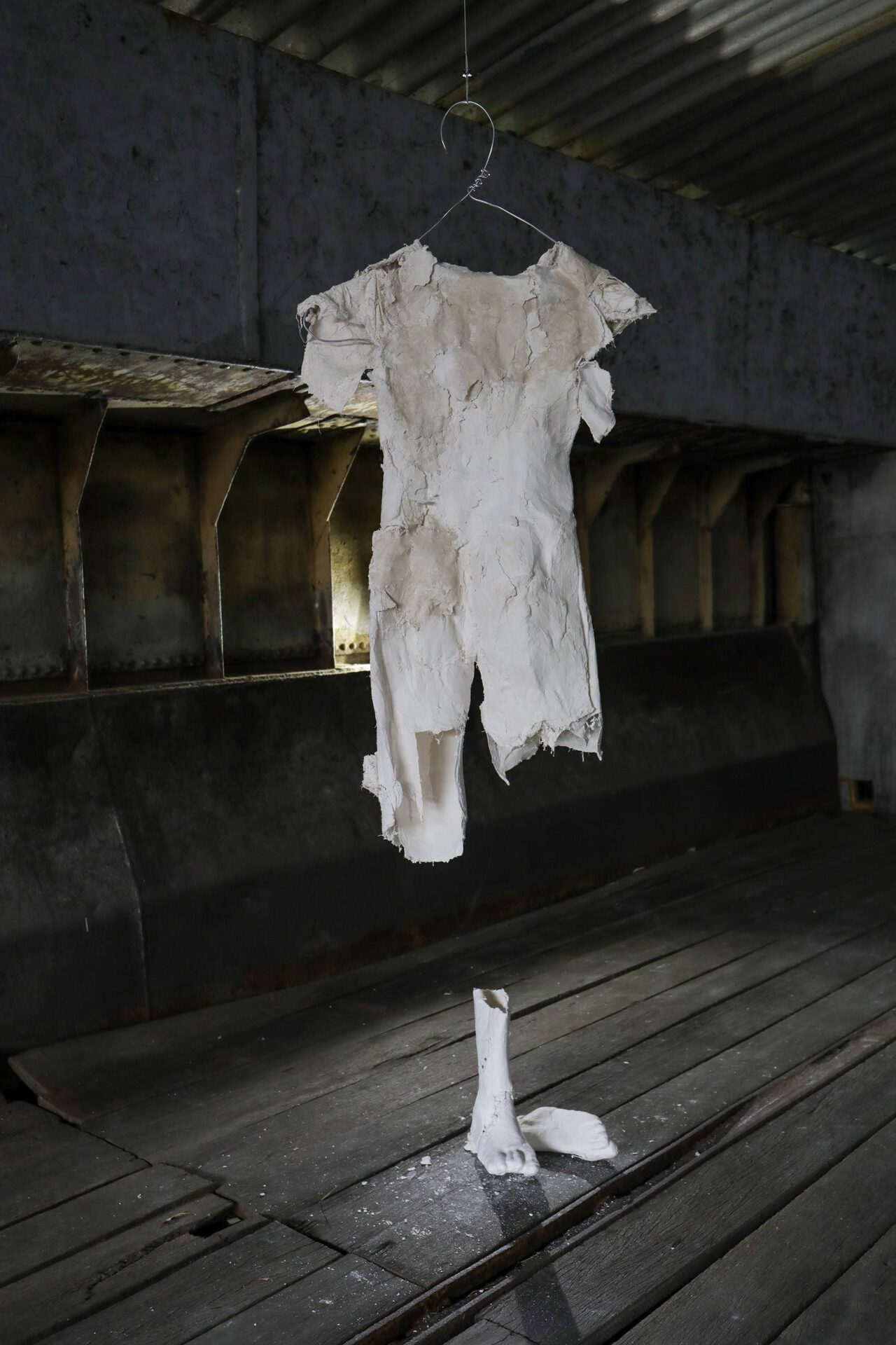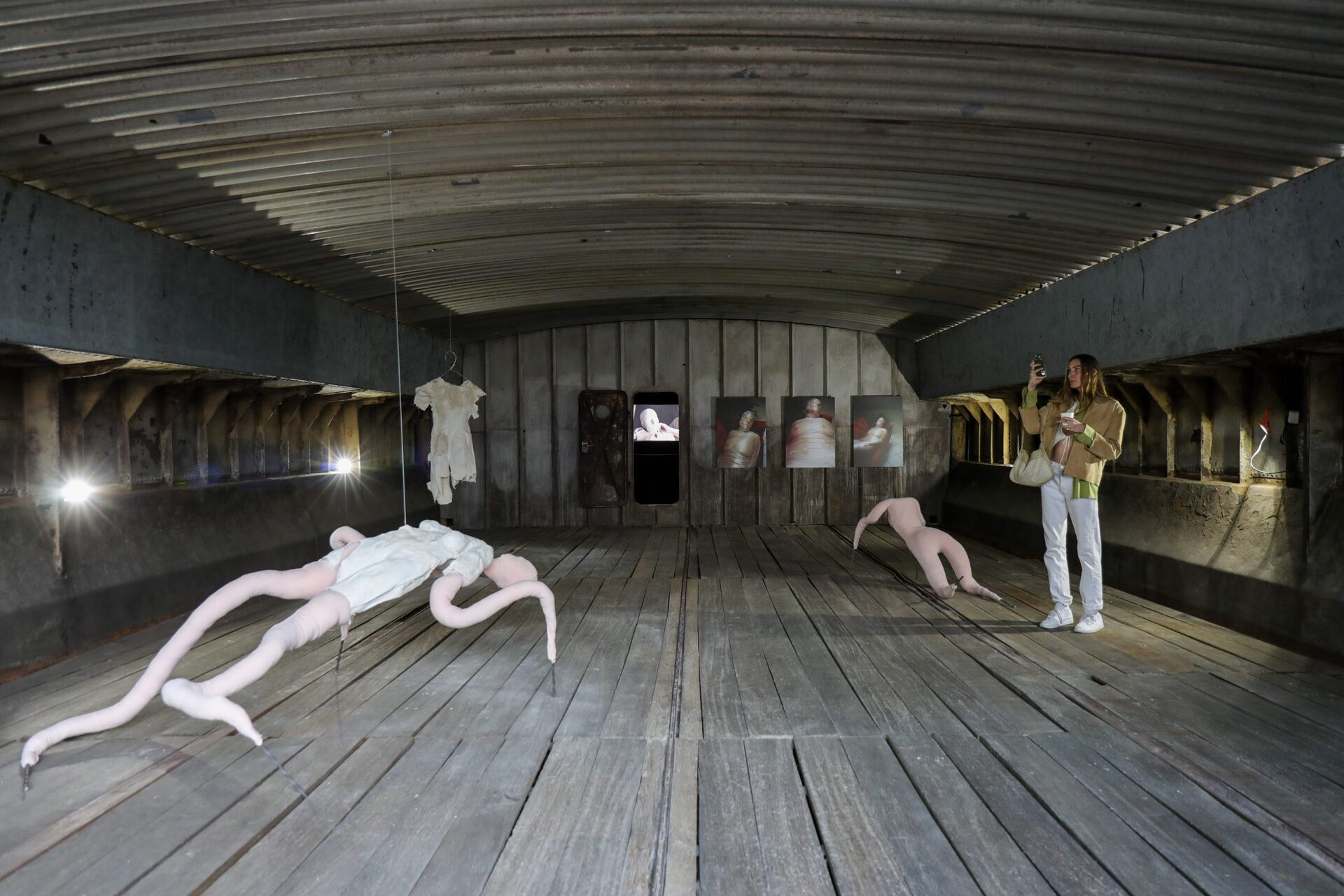 Addressing topics such as vulnerability and the temporality of human existence, the large-scale sculptures are created with found objects and materials; plaster and iron assemble with the softness of skin-coloured fabric in humanoid forms, unnervingly challenging artificially constructed power structures. Crawling on unnaturally long insect-like limbs, one of the sculptures is on the verge of shedding its cocoon, its flesh bulging through every possible extremity. The emerging creature is unapologetic, twisting and arching to take up its space, spreading out like a smaller and softer version of a Louise Bourgeois spider.