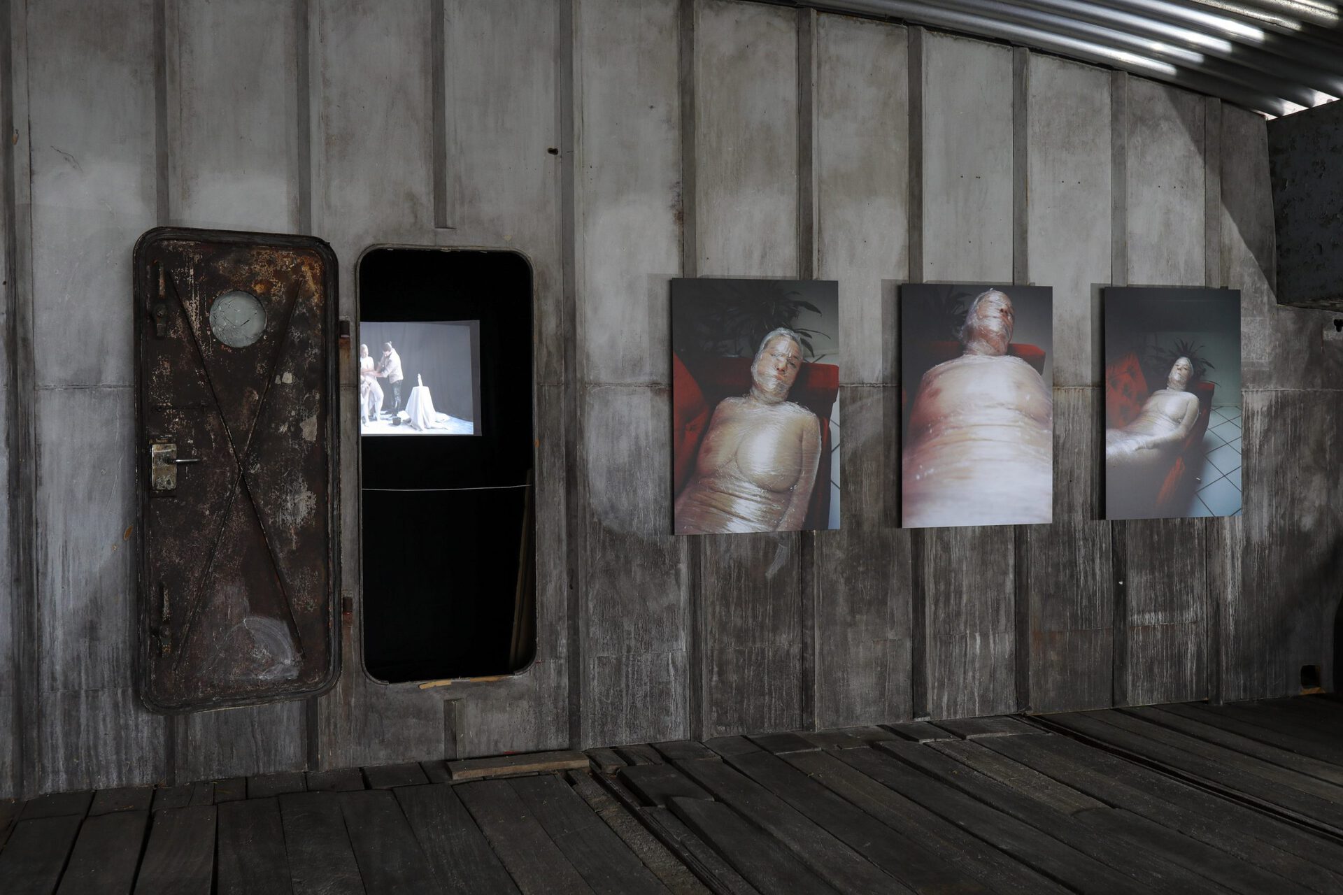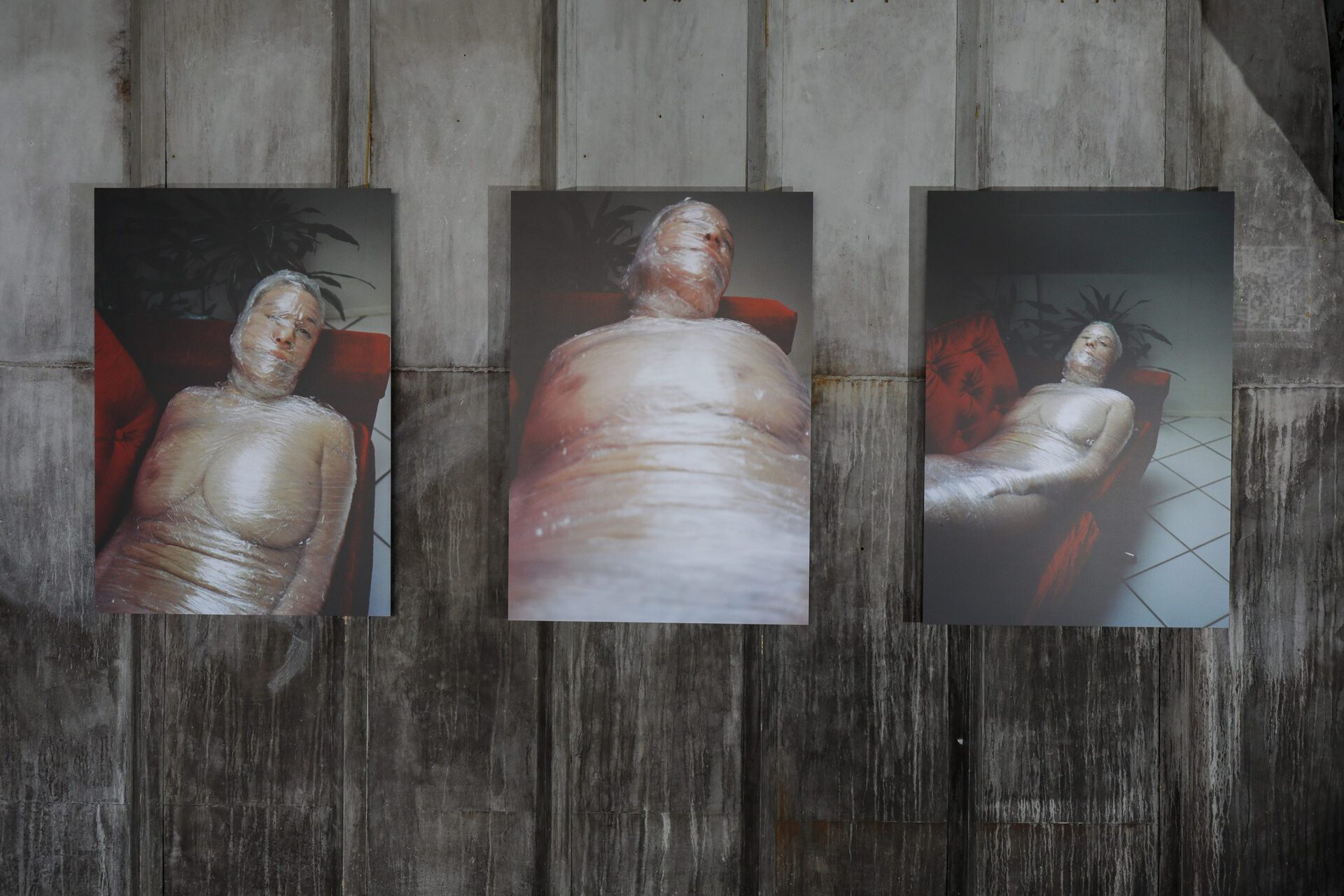 Vacuum Venus (2019) is a series of three photographs mounted on an aluminum support. Borrowing recognisable elements from Henrýsdóttir’s older works, in particular her painted self-portraits, they renounce any attempt at seduction or flattering angles. Instead, they reveal the grotesque reality of human physicality, shoving it in the face of the viewer with such vigour, that it seems to burst out of the frame. The tormenting presence of the triptych is palpable, despite the protagonist being immobile and silenced, trapped inside a cellophane chrysalis.