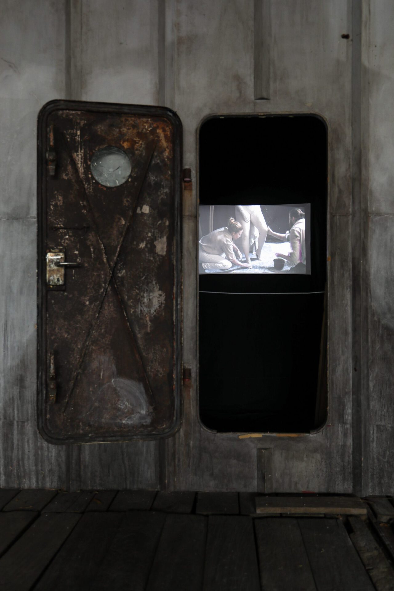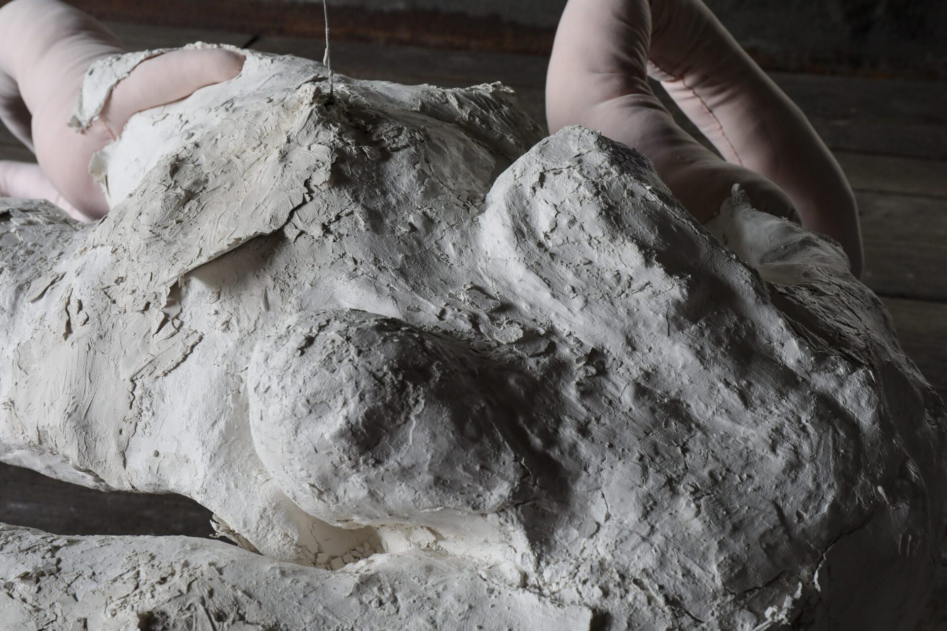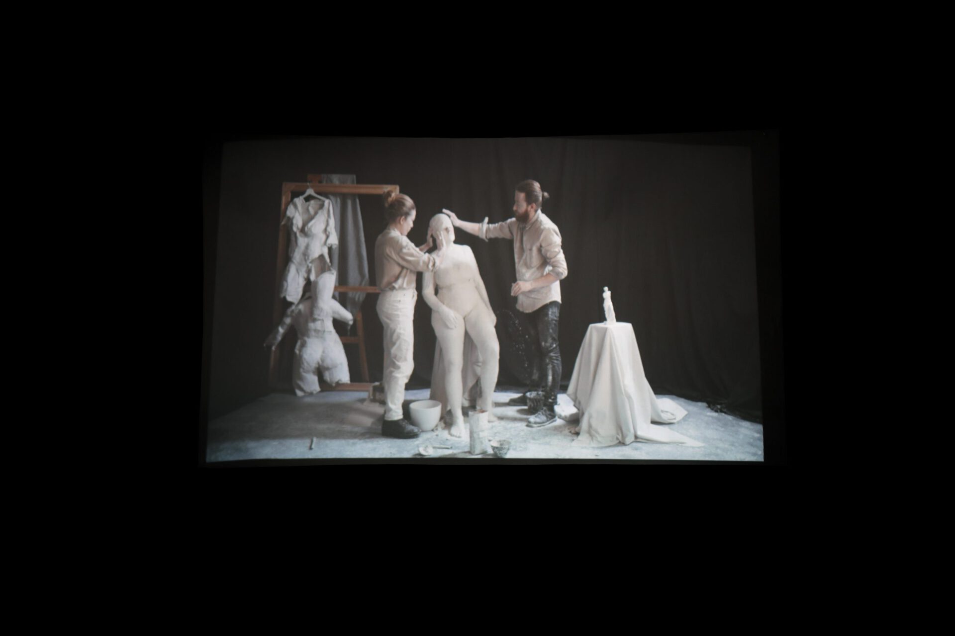 Realised in collaboration with Icelandic sound artist Sigurlaug Gísladóttur (aka Mr. Silla) and two performers, Vilhjálmur Vilhjálmsson and Borghildur Indriðadóttir, Chrysalis (2022) is a video work shot and edited by film maker Álfgerður Malmquist. The piece is activated through the performance of Henrýsdóttir, filmed in the process of herself becoming a sculpture; gradually covered in plaster, she is slowly disappearing under layers of the white paste. In this context, the statue, a symbol of classical beauty and often associated with Greek and Roman art, acts as an ideal but suffocating mould, which the artist eventually shatters and breaks out of.