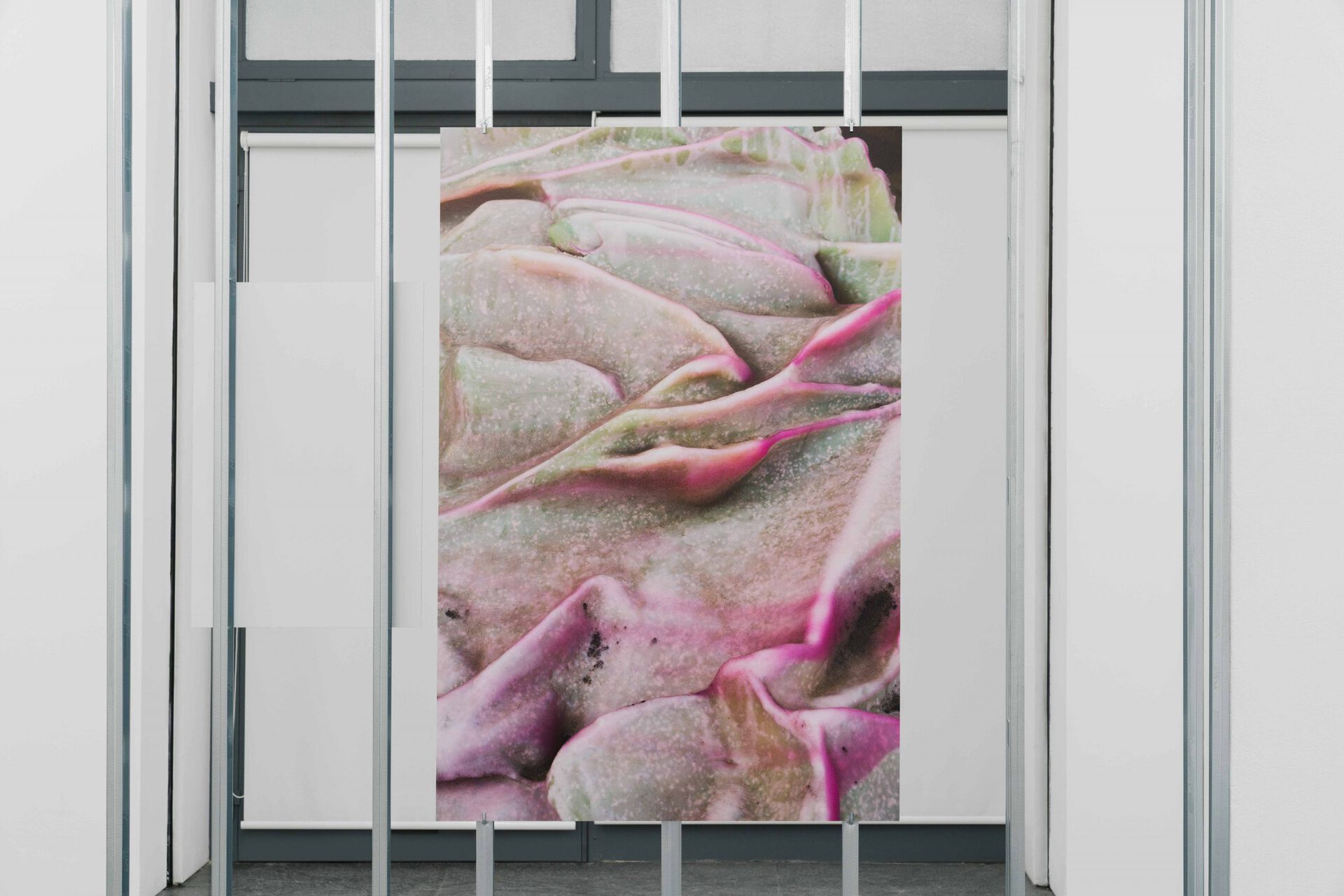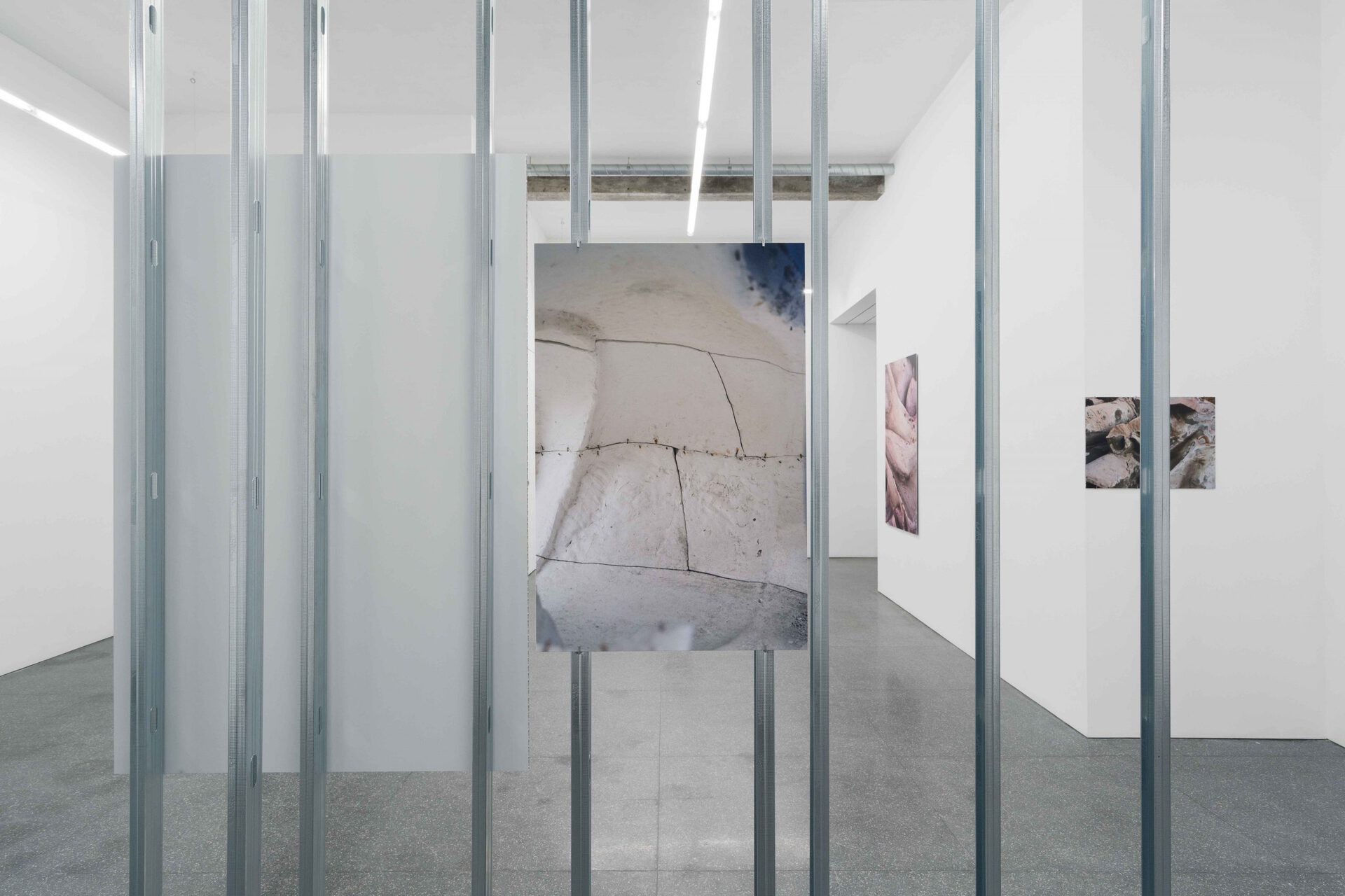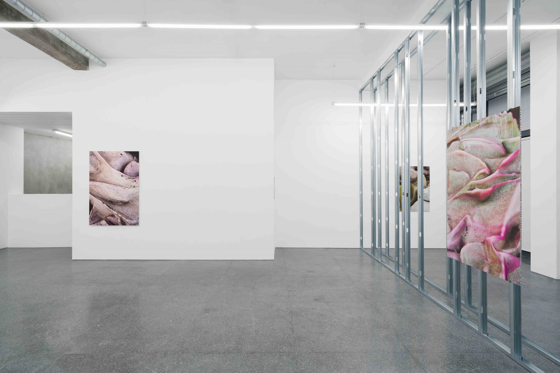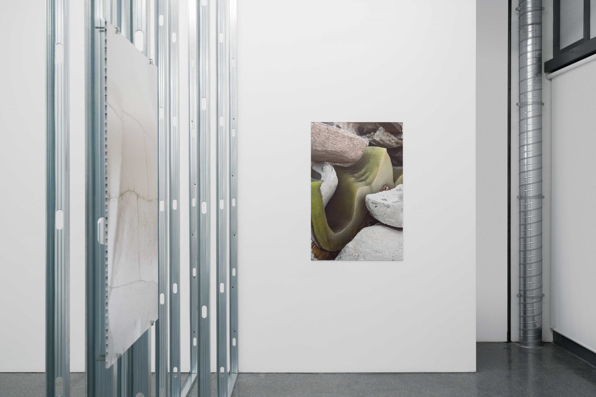 Printed on hollow aluminum plates, the industrial finish of the works defines their existence between ephemerality and gravity. Positioned directly on the ground, an extensive human-scale piece acts as the anchor of the exhibition which the other works orbit about. It summons the traces of a worker’s hands that have modeled the dry surface of a clay shell-like incrustation. These imprints are a sign of the invisible labour that touches only disposable material and evidences the imperceptible precarity behind making. This monumental work contains everything but the monument itself - it represents a symbolic absence.